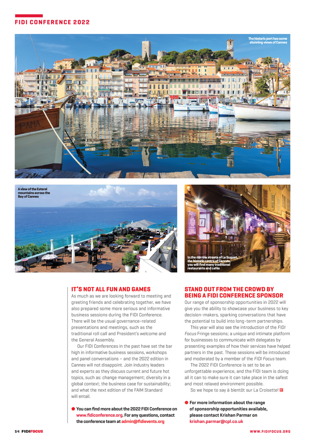 F ID I C O N FE R ENCE 2022 The historic port has some stunning views of Cannes A view of the Esterel mountains across the Bay of Cannes In the narrow streets of Le Suquet, the historic centre of Cannes, you will nd many traditional restaurants and cafs ITS NOT ALL FUN AND GAMES As much as we are looking forward to meeting and greeting friends and celebrating together, we have also prepared some more serious and informative business sessions during the FIDI Conference. There will be the usual governance-related presentations and meetings, such as the traditional roll call and Presidents welcome and the General Assembly. Our FIDI Conferences in the past have set the bar high in informative business sessions, workshops and panel conversations and the 2022 edition in Cannes will not disappoint. Join industry leaders and experts as they discuss current and future hot topics, such as: change management; diversity in a global context; the business case for sustainability; and what the next edition of the FAIM Standard will entail. You can nd more about the 2022 FIDI Conference on www.diconference.org. For any questions, contact the conference team at admin@dievents.org 54 FF304 Dec_Jan 22 pp52-55 FIDI conference.indd 54 STAND OUT FROM THE CROWD BY BEING A FIDI CONFERENCE SPONSOR Our range of sponsorship opportunities in 2022 will give you the ability to showcase your business to key decision-makers, sparking conversations that have the potential to build into long-term partnerships. This year will also see the introduction of the FIDI Focus Fringe sessions; a unique and intimate platform for businesses to communicate with delegates by presenting examples of how their services have helped partners in the past. These sessions will be introduced and moderated by a member of the FIDI Focus team. The 2022 FIDI Conference is set to be an unforgettable experience, and the FIDI team is doing all it can to make sure it can take place in the safest and most relaxed environment possible. So we hope to say bientt sur La Croisette! For more information about the range of sponsorship opportunities available, please contact Krishan Parmar on krishan.parmar@cpl.co.uk WW W. F I D I FOC U S . OR G 07/12/2021 16:06 AGS_
