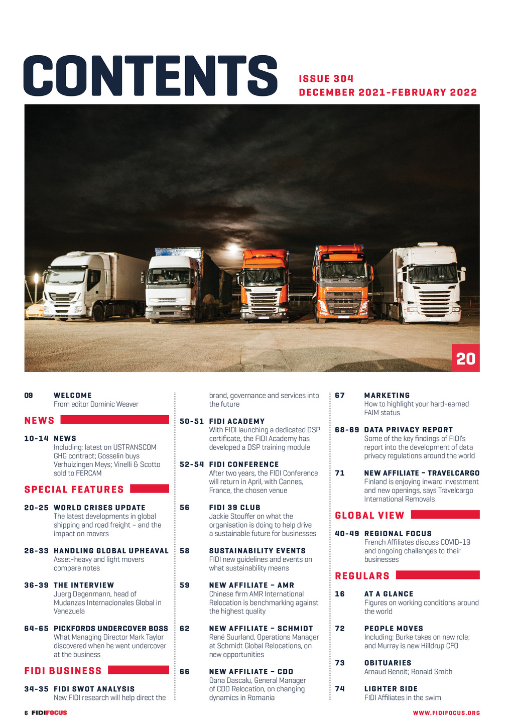 CONTENTS IS S UE 3 0 4 DEC EMBER 2 0 2 1 -FEBRUARY 2 0 2 2 20 09 W ELC O ME From editor Dominic Weaver NE W S 10-1 4 NEW S Including: latest on USTRANSCOM GHG contract; Gosselin buys Verhuizingen Meys; Vinelli & Scotto sold to FERCAM brand, governance and services into the future 50- 51F IDI AC A DE M Y With FIDI launching a dedicated DSP certificate, the FIDI Academy has developed a DSP training module S P E C I A L FE ATUR ES 52- 54F IDI C ON F E R E N C E After two years, the FIDI Conference will return in April, with Cannes, France, the chosen venue 20-2 5 WO R LD C R I SE S U P DAT E The latest developments in global shipping and road freight and the impact on movers 56F IDI 39 C L UB Jackie Stouffer on what the organisation is doing to help drive a sustainable future for businesses 26- 3 3 HA ND LI NG G LO BA L U P H E AVA L Asset-heavy and light movers compare notes 58SUSTA IN A BIL ITY E V E N TS FIDI new guidelines and events on what sustainability means 36- 3 9 T HE I NT ERV I E W Juerg Degenmann, head of Mudanzas Internacionales Global in Venezuela 59N E W A F F IL IATE A M R Chinese firm AMR International Relocation is benchmarking against the highest quality 64- 6 5PICKFORDS UNDERCOVER BOSS What Managing Director Mark Taylor discovered when he went undercover at the business 62N E W A F F IL IATE SC H M IDT Ren Suurland, Operations Manager at Schmidt Global Relocations, on new opportunities F ID I B U SI N E SS 66N E W A F F IL IATE C DD Dana Dascalu, General Manager of CDD Relocation, on changing dynamics in Romania 34-3 5 FI D I SWOT A N A LYSI S New FIDI research will help direct the 6 FF304 Dec_Jan 22 pp06-07 Contents.indd 6 67M A R K E TIN G How to highlight your hard-earned FAIM status 68-69DATA PR IVAC Y REPORT Some of the key findings of FIDIs report into the development of data privacy regulations around the world 71NEW AFFILIATE TRAVELCARGO Finland is enjoying inward investment and new openings, says Travelcargo International Removals G LOBA L V IEW 40-49R E GION A L FOC US French Affiliates discuss COVID-19 and ongoing challenges to their businesses REGULA RS 16AT A GL A N C E Figures on working conditions around the world 72PE OPL E M OV E S Including: Burke takes on new role; and Murray is new Hilldrup CFO 73OBITUA R IE S Arnaud Benoit; Ronald Smith 74L IGH TE R SIDE FIDI Affiliates in the swim WW W. F I D I FOC U S . OR G 07/12/2021 15:37