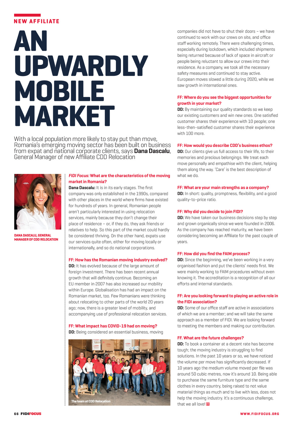 NE W A FFI L I ATE AN UPWARDLY MOBILE MARKET With a local population more likely to stay put than move, Romanias emerging moving sector has been built on business from expat and national corporate clients, says Dana Dascalu, General Manager of new Affiliate CDD Relocation DANA DASCALU, GENERAL MANAGER OF CDD RELOCATION FIDI Focus: What are the characteristics of the moving market in Romania? Dana Dascalu: It is in its early stages. The first company was only established in the 1990s, compared with other places in the world where firms have existed for hundreds of years. In general, Romanian people arent particularly interested in using relocation services, mainly because they dont change their place of residence or, if they do, they ask friends or relatives to help. So this part of the market could hardly be considered thriving. On the other hand, expats use our services quite often, either for moving locally or internationally, and so do national corporations. FF: How has the Romanian moving industry evolved? DD: It has evolved because of the large amount of foreign investment. There has been recent annual growth that will definitely continue. Becoming an EU member in 2007 has also increased our mobility within Europe. Globalisation has had an impact on the Romanian market, too. Few Romanians were thinking about relocating to other parts of the world 20 years ago; now, there is a greater level of mobility, and accompanying use of professional relocation services. FF: What impact has COVID-19 had on moving? DD: Being considered an essential business, moving The team at CDD Relocation 66 FF304 Dec_Jan 22 pp66 New Affiliate CDD.indd 66 companies did not have to shut their doors we have continued to work with our crews on site, and office staff working remotely. There were challenging times, especially during lockdown, which included shipments being returned because of lack of space in aircraft or people being reluctant to allow our crews into their residence. As a company, we took all the necessary safety measures and continued to stay active. European moves slowed a little during 2020, while we saw growth in international ones. FF: Where do you see the biggest opportunities for growth in your market? DD: By maintaining our quality standards so we keep our existing customers and win new ones. One satisfied customer shares their experience with 10 people; one less-then-satisfied customer shares their experience with 100 more. FF: How would you describe CDDs business ethos? DD: Our clients give us full access to their life, to their memories and precious belongings. We treat each move personally and empathise with the client, helping them along the way. Care is the best description of what we do. FF: What are your main strengths as a company? DD: In short: quality, promptness, flexibility, and a good quality-to-price ratio. FF: Why did you decide to join FIDI? DD: We have taken our business decisions step by step and grown organically since we were founded in 2006. As the company has reached maturity, we have been considering becoming an Affiliate for the past couple of years. FF: How did you find the FAIM process? DD: Since the beginning, weve been working in a very organised fashion and put the clients needs first. We were mainly working to FAIM procedures without even knowing it. The accreditation is a recognition of all our efforts and internal standards. FF: Are you looking forward to playing an active role in the FIDI association? DD: Some of our office staff are active in associations of which we are a member; and we will take the same approach as a member of FIDI. We are looking forward to meeting the members and making our contribution. FF. What are the future challenges? DD: To book a container at a decent rate has become tough; the moving industry is struggling to find solutions. In the past 10 years or so, we have noticed the volume per move has significantly decreased. If 10 years ago the medium volume moved per file was around 50 cubic metres, now its around 10. Being able to purchase the same furniture type and the same clothes in every country, being raised to not value material things as much and to live with less, does not help the moving industry. Its a continuous challenge, that we all love! WWW. F I D I FOC U S . OR G 07/12/2021 10:09