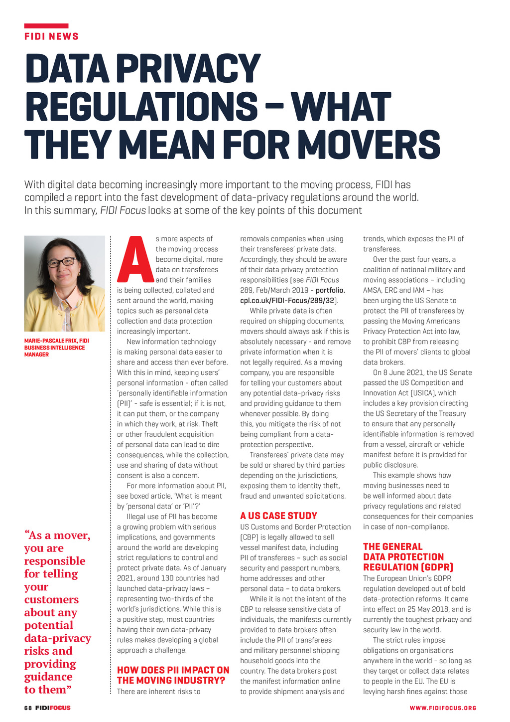 F ID I N E WS DATA PRIVACY REGULATIONS WHAT THEY MEAN FOR MOVERS With digital data becoming increasingly more important to the moving process, FIDI has compiled a report into the fast development of data-privacy regulations around the world. In this summary, FIDI Focus looks at some of the key points of this document A MARIE-PASCALE FRIX, FIDI BUSINESS INTELLIGENCE MANAGER As a mover, you are responsible for telling your customers about any potential data-privacy risks and providing guidance to them s more aspects of the moving process become digital, more data on transferees and their families is being collected, collated and sent around the world, making topics such as personal data collection and data protection increasingly important. New information technology is making personal data easier to share and access than ever before. With this in mind, keeping users personal information - often called personally identifiable information (PII) - safe is essential; if it is not, it can put them, or the company in which they work, at risk. Theft or other fraudulent acquisition of personal data can lead to dire consequences, while the collection, use and sharing of data without consent is also a concern. For more information about PII, see boxed article, What is meant by personal data or PII? Illegal use of PII has become a growing problem with serious implications, and governments around the world are developing strict regulations to control and protect private data. As of January 2021, around 130 countries had launched data-privacy laws representing two-thirds of the worlds jurisdictions. While this is a positive step, most countries having their own data-privacy rules makes developing a global approach a challenge. HOW DOES PII IMPACT ON THE MOVING INDUSTRY? There are inherent risks to 68 FF304 Dec_Jan 22 pp68-69 FIDI News.indd 68 removals companies when using their transferees private data. Accordingly, they should be aware of their data privacy protection responsibilities (see FIDI Focus 289, Feb/March 2019 - portfolio. cpl.co.uk/FIDI-Focus/289/32). While private data is often required on shipping documents, movers should always ask if this is absolutely necessary - and remove private information when it is not legally required. As a moving company, you are responsible for telling your customers about any potential data-privacy risks and providing guidance to them whenever possible. By doing this, you mitigate the risk of not being compliant from a dataprotection perspective. Transferees private data may be sold or shared by third parties depending on the jurisdictions, exposing them to identity theft, fraud and unwanted solicitations. A US CASE STUDY US Customs and Border Protection (CBP) is legally allowed to sell vessel manifest data, including PII of transferees such as social security and passport numbers, home addresses and other personal data to data brokers. While it is not the intent of the CBP to release sensitive data of individuals, the manifests currently provided to data brokers often include the PII of transferees and military personnel shipping household goods into the country. The data brokers post the manifest information online to provide shipment analysis and trends, which exposes the PII of transferees. Over the past four years, a coalition of national military and moving associations including AMSA, ERC and IAM has been urging the US Senate to protect the PII of transferees by passing the Moving Americans Privacy Protection Act into law, to prohibit CBP from releasing the PII of movers clients to global data brokers. On 8 June 2021, the US Senate passed the US Competition and Innovation Act (USICA), which includes a key provision directing the US Secretary of the Treasury to ensure that any personally identifiable information is removed from a vessel, aircraft or vehicle manifest before it is provided for public disclosure. This example shows how moving businesses need to be well informed about data privacy regulations and related consequences for their companies in case of non-compliance. THE GENERAL DATA PROTECTION REGULATION (GDPR) The European Unions GDPR regulation developed out of bold data-protection reforms. It came into effect on 25 May 2018, and is currently the toughest privacy and security law in the world. The strict rules impose obligations on organisations anywhere in the world - so long as they target or collect data relates to people in the EU. The EU is levying harsh fines against those WW W. F I D I FOC U S . OR G 07/12/2021 10:13