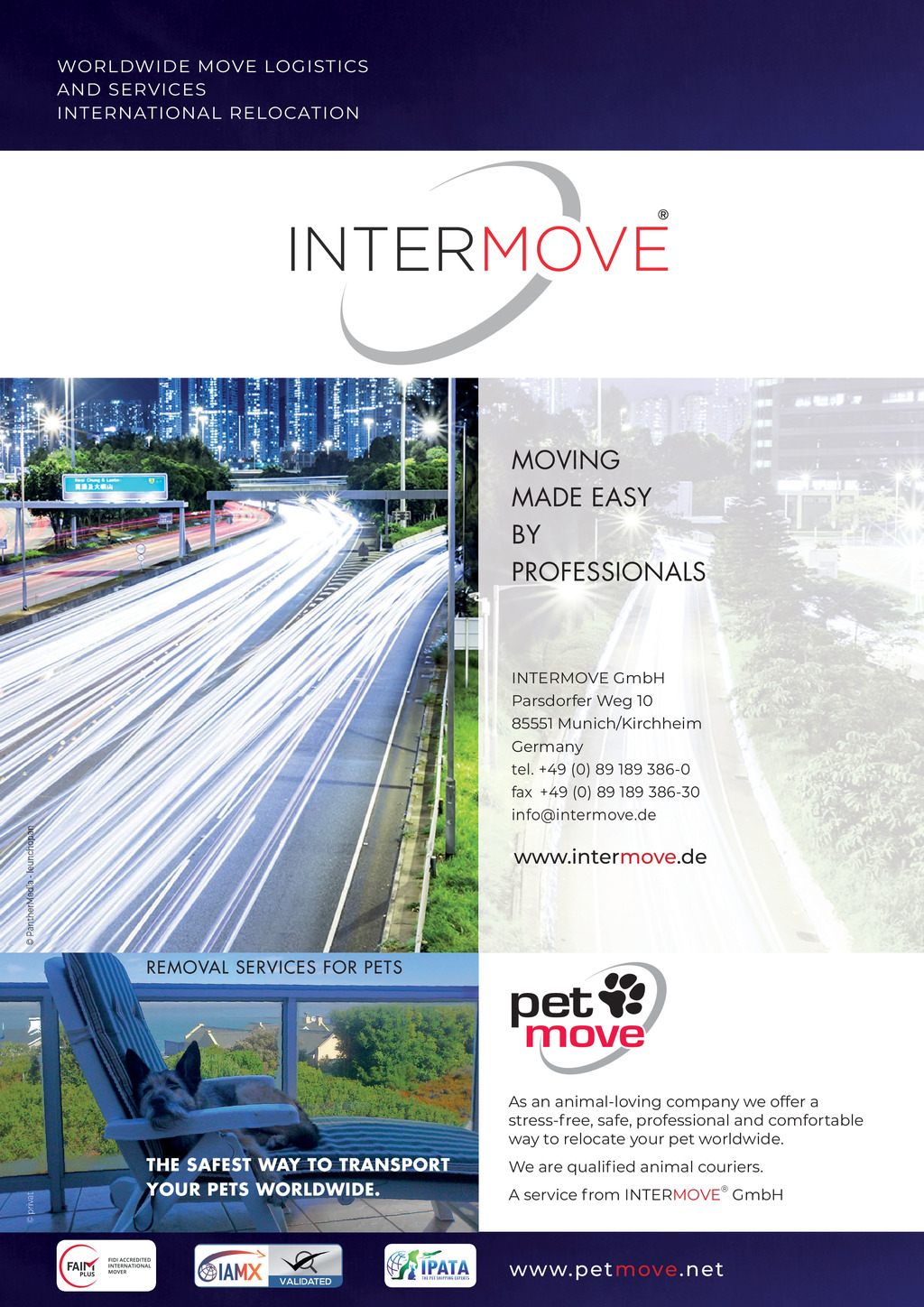WORLDWIDE MOVE LOGISTICS AND SERVICES INTERNATIONAL RELOCATION MOVING MADE EASY BY PROFESSIONALS PantherMedia - leunchopan INTERMOVE GmbH Parsdorfer Weg 10 85551 Munich/Kirchheim Germany tel. +49 (0) 89 189 386-0 fax +49 (0) 89 189 386-30 info@intermove.de www.intermove.de REMOVAL SERVICES FOR PETS pet move privat As an animal-loving company we offer a stress-free, safe, professional and comfortable way to relocate your pet worldwide. THE SAFEST WAY TO TRANSPORT YOUR PETS WORLDWIDE. We are qualified animal couriers. A service from INTERMOVE GmbH www.petmove.net FF304 Dec_Jan 22 pp70-71 New Affiliate Travelcargo.indd 70 07/12/2021 10:14