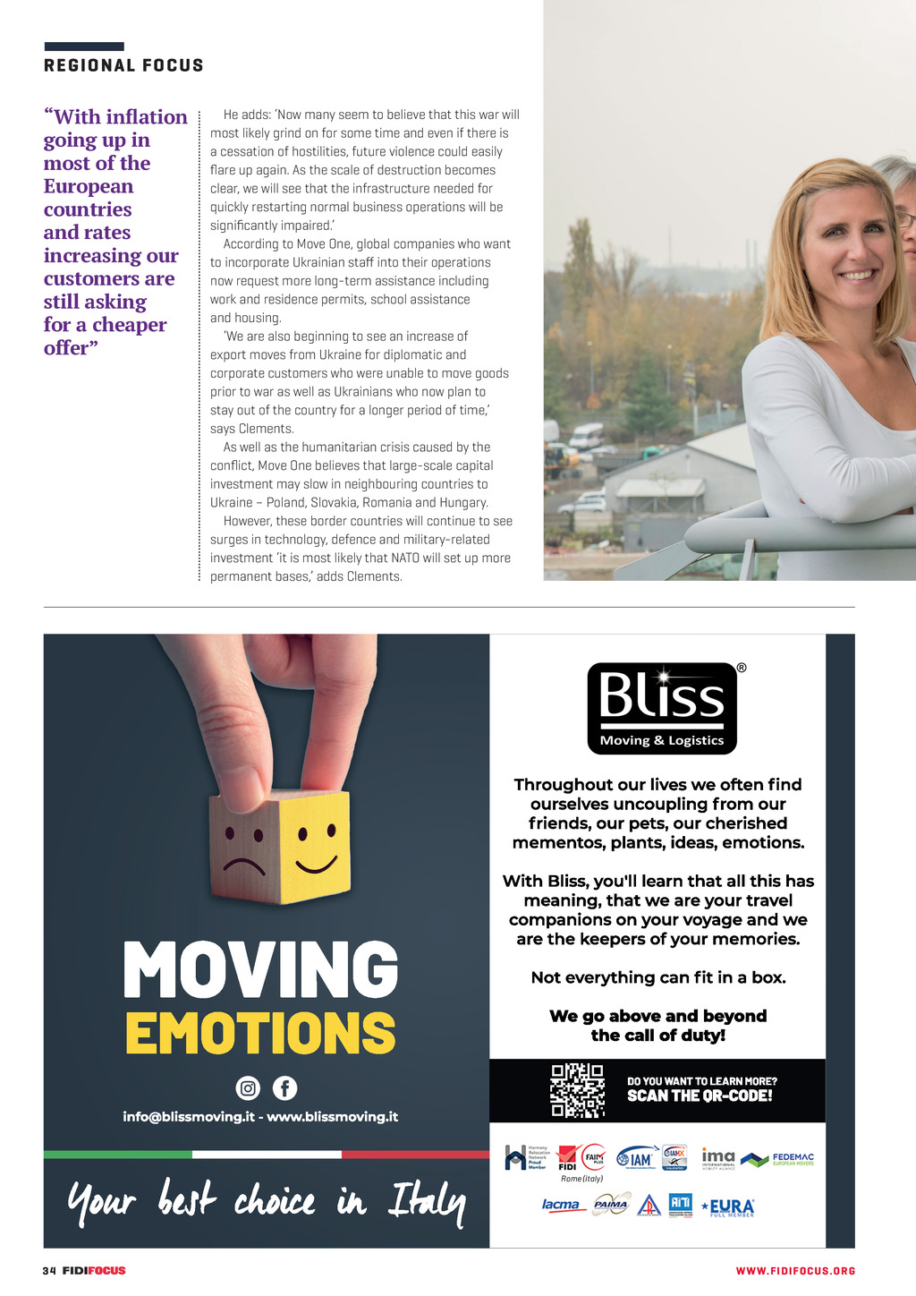R E G I O N A L FOCUS With ination going up in most of the European countries and rates increasing our customers are still asking for a cheaper offer He adds: Now many seem to believe that this war will most likely grind on for some time and even if there is a cessation of hostilities, future violence could easily flare up again. As the scale of destruction becomes clear, we will see that the infrastructure needed for quickly restarting normal business operations will be significantly impaired. According to Move One, global companies who want to incorporate Ukrainian staff into their operations now request more long-term assistance including work and residence permits, school assistance and housing. We are also beginning to see an increase of export moves from Ukraine for diplomatic and corporate customers who were unable to move goods prior to war as well as Ukrainians who now plan to stay out of the country for a longer period of time, says Clements. As well as the humanitarian crisis caused by the conflict, Move One believes that large-scale capital investment may slow in neighbouring countries to Ukraine Poland, Slovakia, Romania and Hungary. However, these border countries will continue to see surges in technology, defence and military-related investment it is most likely that NATO will set up more permanent bases, adds Clements. Rome (italy) 34 FF306 June-August 22 pp30-37 Regional Focus.indd 34 WW W. F I D I FOC U S . OR G 07/06/2022 14:59