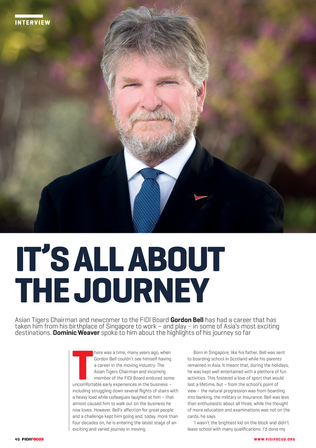 IN T E RV I E W ITS ALL ABOUT THE JOURNEY Asian Tigers Chairman and newcomer to the FIDI Board Gordon Bell has had a career that has taken him from his birthplace of Singapore to work and play in some of Asias most exciting destinations. Dominic Weaver spoke to him about the highlights of his journey so far T here was a time, many years ago, when Gordon Bell couldnt see himself having a career in the moving industry. The Asian Tigers Chairman and incoming member of the FIDI Board endured some uncomfortable early experiences in the business including struggling down several flights of stairs with a heavy load while colleagues laughed at him that almost caused him to walk out on the business he now loves. However, Bells affection for great people and a challenge kept him going and, today, more than four decades on, he is entering the latest stage of an exciting and varied journey in moving. 40 FF306 June-August 22 pp40-43 Interview.indd 40 Born in Singapore, like his father, Bell was sent to boarding school in Scotland while his parents remained in Asia. It meant that, during the holidays, he was kept well entertained with a plethora of fun activities. This fostered a love of sport that would last a lifetime, but from the schools point of view the natural progression was from boarding into banking, the military or insurance. Bell was less than enthusiastic about all three, while the thought of more education and examinations was not on the cards, he says. I wasnt the brightest kid on the block and didnt leave school with many qualifications. Id done my WW W. F I D I FOC U S . OR G 07/06/2022 09:41