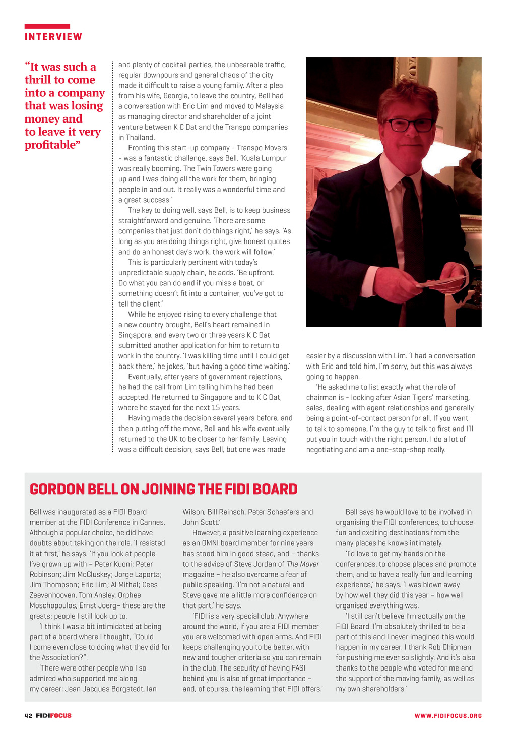 IN T E RV I E W It was such a thrill to come into a company that was losing money and to leave it very profitable and plenty of cocktail parties, the unbearable traffic, regular downpours and general chaos of the city made it difficult to raise a young family. After a plea from his wife, Georgia, to leave the country, Bell had a conversation with Eric Lim and moved to Malaysia as managing director and shareholder of a joint venture between K C Dat and the Transpo companies in Thailand. Fronting this start-up company - Transpo Movers - was a fantastic challenge, says Bell. Kuala Lumpur was really booming. The Twin Towers were going up and I was doing all the work for them, bringing people in and out. It really was a wonderful time and a great success. The key to doing well, says Bell, is to keep business straightforward and genuine. There are some companies that just dont do things right, he says. As long as you are doing things right, give honest quotes and do an honest days work, the work will follow. This is particularly pertinent with todays unpredictable supply chain, he adds. Be upfront. Do what you can do and if you miss a boat, or something doesnt fit into a container, youve got to tell the client. While he enjoyed rising to every challenge that a new country brought, Bells heart remained in Singapore, and every two or three years K C Dat submitted another application for him to return to work in the country. I was killing time until I could get back there, he jokes, but having a good time waiting. Eventually, after years of government rejections, he had the call from Lim telling him he had been accepted. He returned to Singapore and to K C Dat, where he stayed for the next 15 years. Having made the decision several years before, and then putting off the move, Bell and his wife eventually returned to the UK to be closer to her family. Leaving was a difficult decision, says Bell, but one was made easier by a discussion with Lim. I had a conversation with Eric and told him, Im sorry, but this was always going to happen. He asked me to list exactly what the role of chairman is - looking after Asian Tigers marketing, sales, dealing with agent relationships and generally being a point-of-contact person for all. If you want to talk to someone, Im the guy to talk to first and Ill put you in touch with the right person. I do a lot of negotiating and am a one-stop-shop really. GORDON BELL ON JOINING THE FIDI BOARD Bell was inaugurated as a FIDI Board member at the FIDI Conference in Cannes. Although a popular choice, he did have doubts about taking on the role. I resisted it at first, he says. If you look at people Ive grown up with Peter Kuoni; Peter Robinson; Jim McCluskey; Jorge Laporta; Jim Thompson; Eric Lim; Al Mithal; Cees Zeevenhooven, Tom Ansley, Orphee Moschopoulos, Ernst Joerg these are the greats; people I still look up to. I think I was a bit intimidated at being part of a board where I thought, Could I come even close to doing what they did for the Association?. There were other people who I so admired who supported me along my career: Jean Jacques Borgstedt, Ian 42 FF306 June-August 22 pp40-43 Interview.indd 42 Wilson, Bill Reinsch, Peter Schaefers and John Scott. However, a positive learning experience as an OMNI board member for nine years has stood him in good stead, and thanks to the advice of Steve Jordan of The Mover magazine he also overcame a fear of public speaking. Im not a natural and Steve gave me a little more confidence on that part, he says. FIDI is a very special club. Anywhere around the world, if you are a FIDI member you are welcomed with open arms. And FIDI keeps challenging you to be better, with new and tougher criteria so you can remain in the club. The security of having FASI behind you is also of great importance and, of course, the learning that FIDI offers. Bell says he would love to be involved in organising the FIDI conferences, to choose fun and exciting destinations from the many places he knows intimately. Id love to get my hands on the conferences, to choose places and promote them, and to have a really fun and learning experience, he says. I was blown away by how well they did this year how well organised everything was. I still cant believe Im actually on the FIDI Board. Im absolutely thrilled to be a part of this and I never imagined this would happen in my career. I thank Rob Chipman for pushing me ever so slightly. And its also thanks to the people who voted for me and the support of the moving family, as well as my own shareholders. WW W. F I D I FOC U S . OR G 07/06/2022 09:41