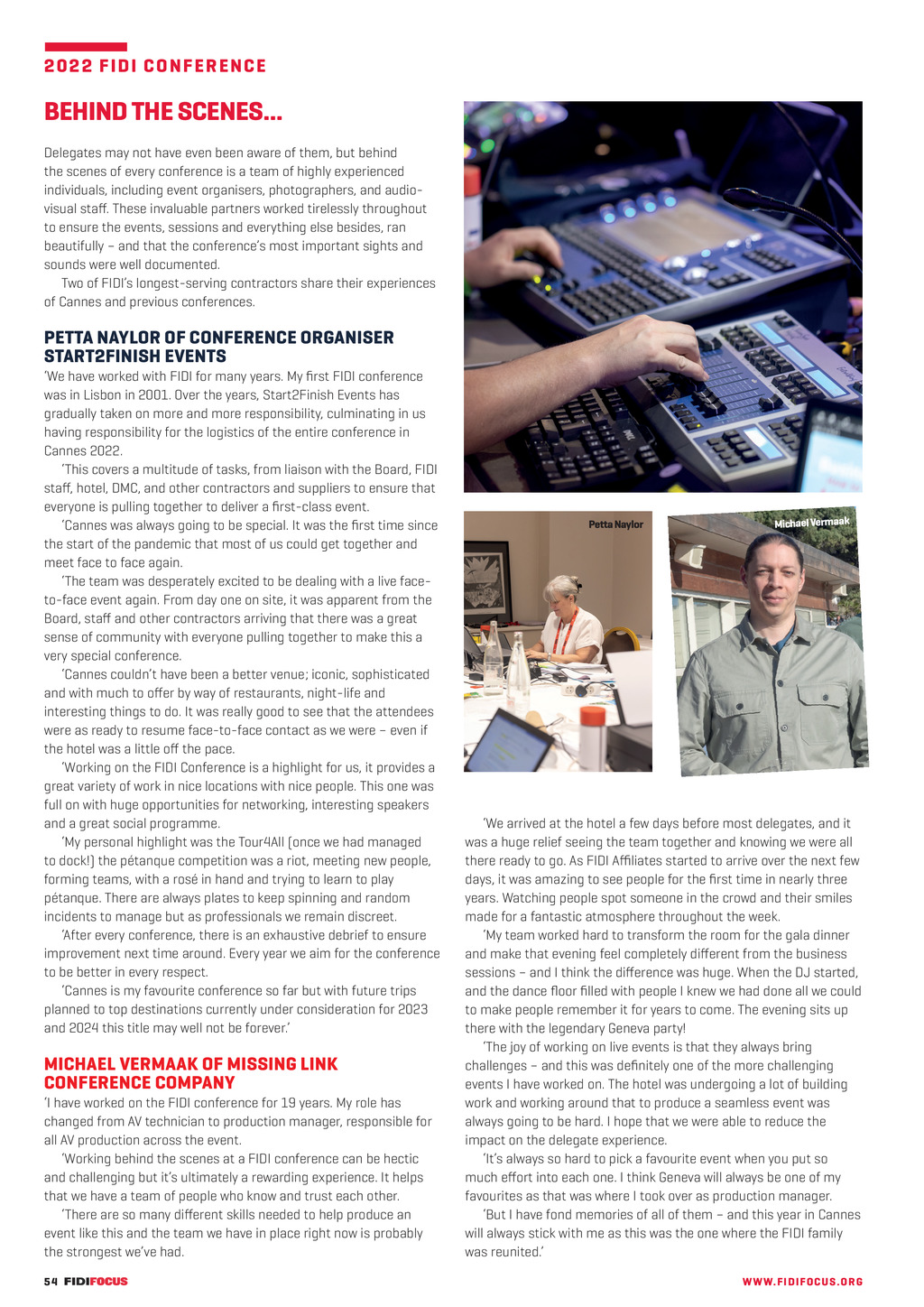 2 0 22 FI D I C ONFER ENCE BEHIND THE SCENES Delegates may not have even been aware of them, but behind the scenes of every conference is a team of highly experienced individuals, including event organisers, photographers, and audiovisual staff. These invaluable partners worked tirelessly throughout to ensure the events, sessions and everything else besides, ran beautifully and that the conferences most important sights and sounds were well documented. Two of FIDIs longest-serving contractors share their experiences of Cannes and previous conferences. PETTA NAYLOR OF CONFERENCE ORGANISER START2FINISH EVENTS We have worked with FIDI for many years. My first FIDI conference was in Lisbon in 2001. Over the years, Start2Finish Events has gradually taken on more and more responsibility, culminating in us having responsibility for the logistics of the entire conference in Cannes 2022. This covers a multitude of tasks, from liaison with the Board, FIDI staff, hotel, DMC, and other contractors and suppliers to ensure that everyone is pulling together to deliver a first-class event. Cannes was always going to be special. It was the first time since the start of the pandemic that most of us could get together and meet face to face again. The team was desperately excited to be dealing with a live faceto-face event again. From day one on site, it was apparent from the Board, staff and other contractors arriving that there was a great sense of community with everyone pulling together to make this a very special conference. Cannes couldnt have been a better venue; iconic, sophisticated and with much to offer by way of restaurants, night-life and interesting things to do. It was really good to see that the attendees were as ready to resume face-to-face contact as we were even if the hotel was a little off the pace. Working on the FIDI Conference is a highlight for us, it provides a great variety of work in nice locations with nice people. This one was full on with huge opportunities for networking, interesting speakers and a great social programme. My personal highlight was the Tour4All (once we had managed to dock!) the ptanque competition was a riot, meeting new people, forming teams, with a ros in hand and trying to learn to play ptanque. There are always plates to keep spinning and random incidents to manage but as professionals we remain discreet. After every conference, there is an exhaustive debrief to ensure improvement next time around. Every year we aim for the conference to be better in every respect. Cannes is my favourite conference so far but with future trips planned to top destinations currently under consideration for 2023 and 2024 this title may well not be forever. MICHAEL VERMAAK OF MISSING LINK CONFERENCE COMPANY I have worked on the FIDI conference for 19 years. My role has changed from AV technician to production manager, responsible for all AV production across the event. Working behind the scenes at a FIDI conference can be hectic and challenging but its ultimately a rewarding experience. It helps that we have a team of people who know and trust each other. There are so many different skills needed to help produce an event like this and the team we have in place right now is probably the strongest weve had. 54 FF306 June-August 22 pp44-59 Conference.indd 54 Petta Naylor Michael Vermaak We arrived at the hotel a few days before most delegates, and it was a huge relief seeing the team together and knowing we were all there ready to go. As FIDI Affiliates started to arrive over the next few days, it was amazing to see people for the first time in nearly three years. Watching people spot someone in the crowd and their smiles made for a fantastic atmosphere throughout the week. My team worked hard to transform the room for the gala dinner and make that evening feel completely different from the business sessions and I think the difference was huge. When the DJ started, and the dance floor filled with people I knew we had done all we could to make people remember it for years to come. The evening sits up there with the legendary Geneva party! The joy of working on live events is that they always bring challenges and this was definitely one of the more challenging events I have worked on. The hotel was undergoing a lot of building work and working around that to produce a seamless event was always going to be hard. I hope that we were able to reduce the impact on the delegate experience. Its always so hard to pick a favourite event when you put so much effort into each one. I think Geneva will always be one of my favourites as that was where I took over as production manager. But I have fond memories of all of them and this year in Cannes will always stick with me as this was the one where the FIDI family was reunited. WW W. F I D I FOC U S . OR G 07/06/2022 10:18