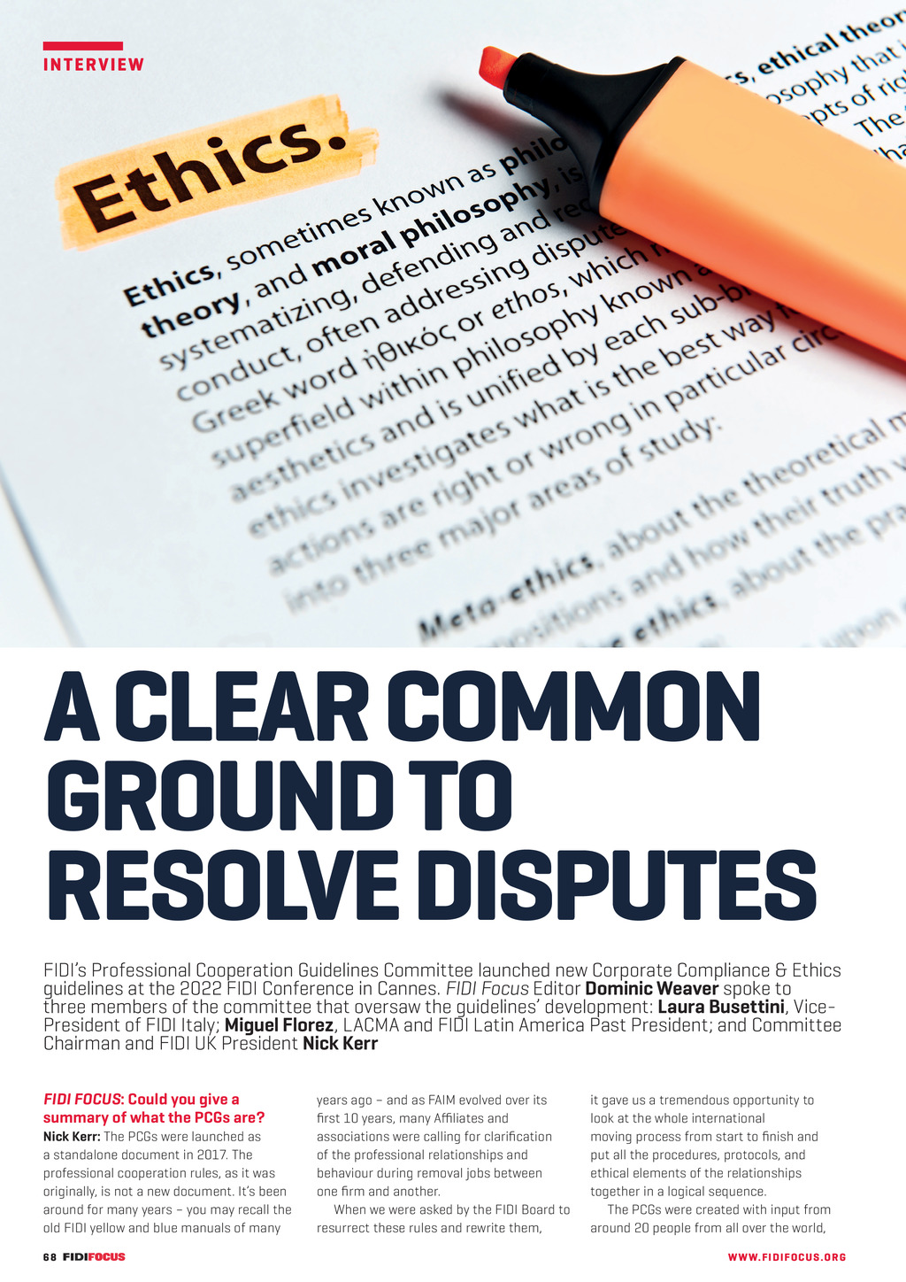 IN T E RV I E W A CLEAR COMMON GROUND TO RESOLVE DISPUTES FIDIs Professional Cooperation Guidelines Committee launched new Corporate Compliance & Ethics guidelines at the 2022 FIDI Conference in Cannes. FIDI Focus Editor Dominic Weaver spoke to three members of the committee that oversaw the guidelines development: Laura Busettini, VicePresident of FIDI Italy; Miguel Florez, LACMA and FIDI Latin America Past President; and Committee Chairman and FIDI UK President Nick Kerr FIDI FOCUS: Could you give a summary of what the PCGs are? Nick Kerr: The PCGs were launched as a standalone document in 2017. The professional cooperation rules, as it was originally, is not a new document. Its been around for many years you may recall the old FIDI yellow and blue manuals of many 68 FF306 June-August 22 pp68-69 PCG Interview.indd 68 years ago and as FAIM evolved over its first 10 years, many Affiliates and associations were calling for clarification of the professional relationships and behaviour during removal jobs between one firm and another. When we were asked by the FIDI Board to resurrect these rules and rewrite them, it gave us a tremendous opportunity to look at the whole international moving process from start to finish and put all the procedures, protocols, and ethical elements of the relationships together in a logical sequence. The PCGs were created with input from around 20 people from all over the world, WW W. F I D I FOC U S . OR G 07/06/2022 10:28