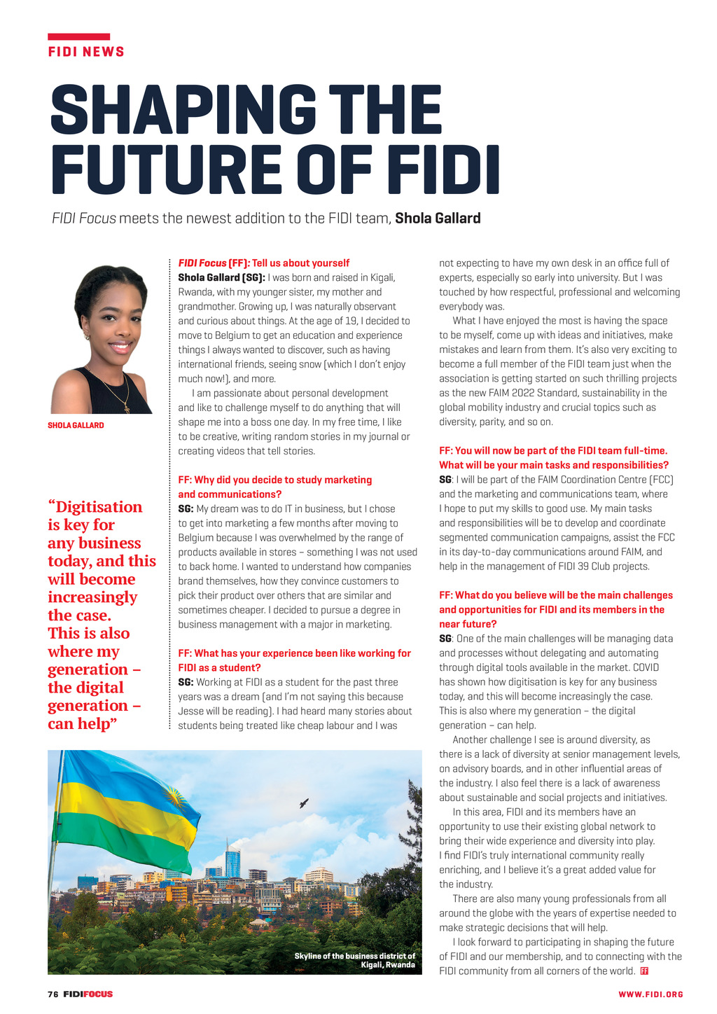 FI D I N E WS SHAPING THE FUTURE OF FIDI FIDI Focus meets the newest addition to the FIDI team, Shola Gallard SHOLA GALLARD Digitisation is key for any business today, and this will become increasingly the case. This is also where my generation the digital generation can help FIDI Focus (FF): Tell us about yourself Shola Gallard (SG): I was born and raised in Kigali, Rwanda, with my younger sister, my mother and grandmother. Growing up, I was naturally observant and curious about things. At the age of 19, I decided to move to Belgium to get an education and experience things I always wanted to discover, such as having international friends, seeing snow (which I dont enjoy much now!), and more. I am passionate about personal development and like to challenge myself to do anything that will shape me into a boss one day. In my free time, I like to be creative, writing random stories in my journal or creating videos that tell stories. FF: Why did you decide to study marketing and communications? SG: My dream was to do IT in business, but I chose to get into marketing a few months after moving to Belgium because I was overwhelmed by the range of products available in stores something I was not used to back home. I wanted to understand how companies brand themselves, how they convince customers to pick their product over others that are similar and sometimes cheaper. I decided to pursue a degree in business management with a major in marketing. FF: What has your experience been like working for FIDI as a student? SG: Working at FIDI as a student for the past three years was a dream (and Im not saying this because Jesse will be reading). I had heard many stories about students being treated like cheap labour and I was Skyline of the business district of Kigali, Rwanda 76 FF306 June-August 22 pp76-77 Interview Shola.indd 76 not expecting to have my own desk in an office full of experts, especially so early into university. But I was touched by how respectful, professional and welcoming everybody was. What I have enjoyed the most is having the space to be myself, come up with ideas and initiatives, make mistakes and learn from them. Its also very exciting to become a full member of the FIDI team just when the association is getting started on such thrilling projects as the new FAIM 2022 Standard, sustainability in the global mobility industry and crucial topics such as diversity, parity, and so on. FF: You will now be part of the FIDI team full-time. What will be your main tasks and responsibilities? SG: I will be part of the FAIM Coordination Centre (FCC) and the marketing and communications team, where I hope to put my skills to good use. My main tasks and responsibilities will be to develop and coordinate segmented communication campaigns, assist the FCC in its day-to-day communications around FAIM, and help in the management of FIDI 39 Club projects. FF: What do you believe will be the main challenges and opportunities for FIDI and its members in the near future? SG: One of the main challenges will be managing data and processes without delegating and automating through digital tools available in the market. COVID has shown how digitisation is key for any business today, and this will become increasingly the case. This is also where my generation the digital generation can help. Another challenge I see is around diversity, as there is a lack of diversity at senior management levels, on advisory boards, and in other influential areas of the industry. I also feel there is a lack of awareness about sustainable and social projects and initiatives. In this area, FIDI and its members have an opportunity to use their existing global network to bring their wide experience and diversity into play. I find FIDIs truly international community really enriching, and I believe its a great added value for the industry. There are also many young professionals from all around the globe with the years of expertise needed to make strategic decisions that will help. I look forward to participating in shaping the future of FIDI and our membership, and to connecting with the FIDI community from all corners of the world. WWW. F I D I . OR G 07/06/2022 10:34