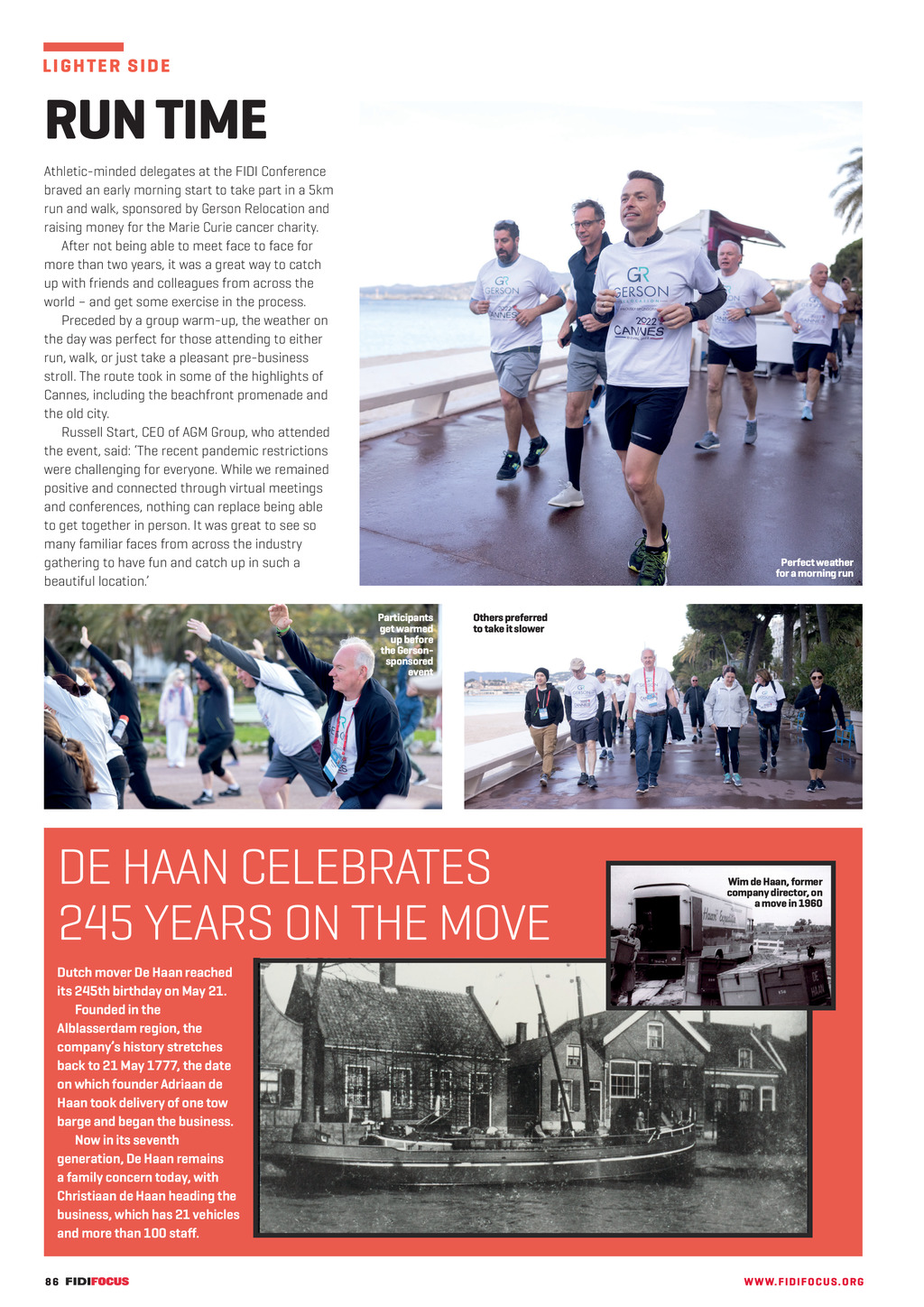 L IGH T E R S I D E RUN TIME Athletic-minded delegates at the FIDI Conference braved an early morning start to take part in a 5km run and walk, sponsored by Gerson Relocation and raising money for the Marie Curie cancer charity. After not being able to meet face to face for more than two years, it was a great way to catch up with friends and colleagues from across the world and get some exercise in the process. Preceded by a group warm-up, the weather on the day was perfect for those attending to either run, walk, or just take a pleasant pre-business stroll. The route took in some of the highlights of Cannes, including the beachfront promenade and the old city. Russell Start, CEO of AGM Group, who attended the event, said: The recent pandemic restrictions were challenging for everyone. While we remained positive and connected through virtual meetings and conferences, nothing can replace being able to get together in person. It was great to see so many familiar faces from across the industry gathering to have fun and catch up in such a beautiful location. Perfect weather for a morning run Participants get warmed up before the Gersonsponsored event Others preferred to take it slower DE HAAN CELEBRATES 245 YEARS ON THE MOVE Wim de Haan, former company director, on a move in 1960 Dutch mover De Haan reached its 245th birthday on May 21. Founded in the Alblasserdam region, the companys history stretches back to 21 May 1777, the date on which founder Adriaan de Haan took delivery of one tow barge and began the business. Now in its seventh generation, De Haan remains a family concern today, with Christiaan de Haan heading the business, which has 21 vehicles and more than 100 staff. 86 FF306 June-August 22 pp86-88 Lighter Side.indd 86 WWW. F I D I FOC U S . OR G 07/06/2022 10:43