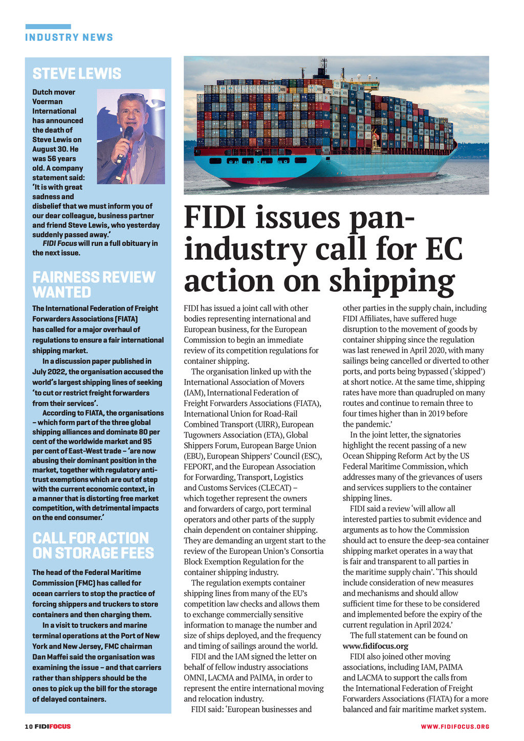 IN D U ST RY N EW S STEVE LEWIS Dutch mover Voerman International has announced the death of Steve Lewis on August 30. He was 56 years old. A company statement said: It is with great sadness and disbelief that we must inform you of our dear colleague, business partner and friend Steve Lewis, who yesterday suddenly passed away. FIDI Focus will run a full obituary in the next issue. FAIRNESS REVIEW WANTED The International Federation of Freight Forwarders Associations (FIATA) has called for a major overhaul of regulations to ensure a fair international shipping market. In a discussion paper published in July 2022, the organisation accused the worlds largest shipping lines of seeking to cut or restrict freight forwarders from their services. According to FIATA, the organisations which form part of the three global shipping alliances and dominate 80 per cent of the worldwide market and 95 per cent of East-West trade are now abusing their dominant position in the market, together with regulatory antitrust exemptions which are out of step with the current economic context, in a manner that is distorting free market competition, with detrimental impacts on the end consumer. CALL FOR ACTION ON STORAGE FEES The head of the Federal Maritime Commission (FMC) has called for ocean carriers to stop the practice of forcing shippers and truckers to store containers and then charging them. In a visit to truckers and marine terminal operations at the Port of New York and New Jersey, FMC chairman Dan Maffei said the organisation was examining the issue and that carriers rather than shippers should be the ones to pick up the bill for the storage of delayed containers. 10 FF307 September-November 22 pp10-15 News.indd 10 FIDI issues panindustry call for EC action on shipping FIDI has issued a joint call with other bodies representing international and European business, for the European Commission to begin an immediate review of its competition regulations for container shipping. The organisation linked up with the International Association of Movers (IAM), International Federation of Freight Forwarders Associations (FIATA), International Union for Road-Rail Combined Transport (UIRR), European Tugowners Association (ETA), Global Shippers Forum, European Barge Union (EBU), European Shippers Council (ESC), FEPORT, and the European Association for Forwarding, Transport, Logistics and Customs Services (CLECAT) which together represent the owners and forwarders of cargo, port terminal operators and other parts of the supply chain dependent on container shipping. They are demanding an urgent start to the review of the European Unions Consortia Block Exemption Regulation for the container shipping industry. The regulation exempts container shipping lines from many of the EUs competition law checks and allows them to exchange commercially sensitive information to manage the number and size of ships deployed, and the frequency and timing of sailings around the world. FIDI and the IAM signed the letter on behalf of fellow industry associations OMNI, LACMA and PAIMA, in order to represent the entire international moving and relocation industry. FIDI said: European businesses and other parties in the supply chain, including FIDI Afliates, have suffered huge disruption to the movement of goods by container shipping since the regulation was last renewed in April 2020, with many sailings being cancelled or diverted to other ports, and ports being bypassed (skipped) at short notice. At the same time, shipping rates have more than quadrupled on many routes and continue to remain three to four times higher than in 2019 before the pandemic. In the joint letter, the signatories highlight the recent passing of a new Ocean Shipping Reform Act by the US Federal Maritime Commission, which addresses many of the grievances of users and services suppliers to the container shipping lines. FIDI said a review will allow all interested parties to submit evidence and arguments as to how the Commission should act to ensure the deep-sea container shipping market operates in a way that is fair and transparent to all parties in the maritime supply chain. This should include consideration of new measures and mechanisms and should allow sufcient time for these to be considered and implemented before the expiry of the current regulation in April 2024. The full statement can be found on www.difocus.org FIDI also joined other moving associations, including IAM, PAIMA and LACMA to support the calls from the International Federation of Freight Forwarders Associations (FIATA) for a more balanced and fair maritime market system. WW W. F I D I FOC U S . OR G 06/09/2022 14:46
