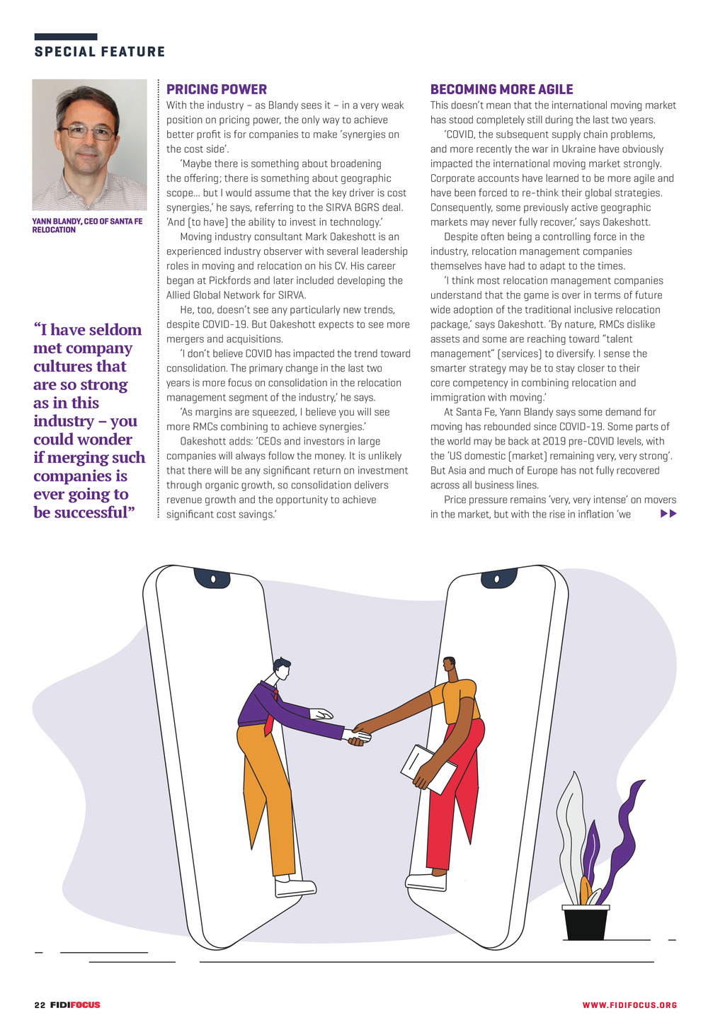 S P E C I A L F E ATURE PRICING POWER YANN BLANDY, CEO OF SANTA FE RELOCATION I have seldom met company cultures that are so strong as in this industry you could wonder if merging such companies is ever going to be successful With the industry as Blandy sees it in a very weak position on pricing power, the only way to achieve better profit is for companies to make synergies on the cost side. Maybe there is something about broadening the offering; there is something about geographic scope... but I would assume that the key driver is cost synergies, he says, referring to the SIRVA BGRS deal. And (to have) the ability to invest in technology. Moving industry consultant Mark Oakeshott is an experienced industry observer with several leadership roles in moving and relocation on his CV. His career began at Pickfords and later included developing the Allied Global Network for SIRVA. He, too, doesnt see any particularly new trends, despite COVID-19. But Oakeshott expects to see more mergers and acquisitions. I dont believe COVID has impacted the trend toward consolidation. The primary change in the last two years is more focus on consolidation in the relocation management segment of the industry, he says. As margins are squeezed, I believe you will see more RMCs combining to achieve synergies. Oakeshott adds: CEOs and investors in large companies will always follow the money. It is unlikely that there will be any significant return on investment through organic growth, so consolidation delivers revenue growth and the opportunity to achieve significant cost savings. 22 FF307 September-November 22 pp20-25 Special feature_mergers and acquisitions.indd 22 BECOMING MORE AGILE This doesnt mean that the international moving market has stood completely still during the last two years. COVID, the subsequent supply chain problems, and more recently the war in Ukraine have obviously impacted the international moving market strongly. Corporate accounts have learned to be more agile and have been forced to re-think their global strategies. Consequently, some previously active geographic markets may never fully recover, says Oakeshott. Despite often being a controlling force in the industry, relocation management companies themselves have had to adapt to the times. I think most relocation management companies understand that the game is over in terms of future wide adoption of the traditional inclusive relocation package, says Oakeshott. By nature, RMCs dislike assets and some are reaching toward talent management (services) to diversify. I sense the smarter strategy may be to stay closer to their core competency in combining relocation and immigration with moving. At Santa Fe, Yann Blandy says some demand for moving has rebounded since COVID-19. Some parts of the world may be back at 2019 pre-COVID levels, with the US domestic (market) remaining very, very strong. But Asia and much of Europe has not fully recovered across all business lines. Price pressure remains very, very intense on movers in the market, but with the rise in inflation we WW W. F I D I FOC U S . OR G 06/09/2022 12:38 DBon
