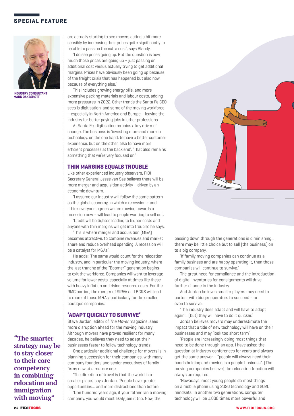 S P E C I A L F E ATURE INDUSTRY CONSULTANT MARK OAKESHOTT are actually starting to see movers acting a bit more sensibly by increasing their prices quite significantly to be able to pass on the extra cost, says Blandy. I do see prices going up. But the question is how much those prices are going up just passing on additional cost versus actually trying to get additional margins. Prices have obviously been going up because of the freight crisis that has happened but also now because of everything else. This includes growing energy bills, and more expensive packing materials and labour costs, adding more pressures in 2022. Other trends the Santa Fe CEO sees is digitisation, and some of the moving workforce especially in North America and Europe leaving the industry for better paying jobs in other professions. At Santa Fe, digitisation remains a key driver of change. The business is investing more and more in technology, on the one hand, to have a better customer experience, but on the other, also to have more efficient processes at the back end. That also remains something that were very focused on. THIN MARGINS EQUALS TROUBLE Like other experienced industry observers, FIDI Secretary General Jesse van Sas believes there will be more merger and acquisition activity driven by an economic downturn. I assume our industry will follow the same pattern as the global economy, in which a recession and I think everyone agrees we are moving towards a recession now will lead to people wanting to sell out. Credit will be tighter, leading to higher costs and anyone with thin margins will get into trouble, he says. This is where merger and acquisition (M&A) becomes attractive, to combine revenues and market share and reduce overhead spending. A recession will be a catalyst for M&As. He adds: The same would count for the relocation industry, and in particular the moving industry, where the last tranche of the Boomer generation begins to exit the workforce. Companies will want to leverage volume for lower costs, especially at times like these with heavy inflation and rising resource costs. For the RMC portion, the merger of SIRVA and BGRS will lead to more of those M&As, particularly for the smaller boutique companies. ADAPT QUICKLY TO SURVIVE The smarter strategy may be to stay closer to their core competency in combining relocation and immigration with moving Steve Jordan, editor of The Mover magazine, sees more disruption ahead for the moving industry. Although movers have proved resilient for many decades, he believes they need to adapt their businesses faster to follow technology trends. One particular additional challenge for movers is in planning succession for their companies, with many company founders and senior executives of family firms now at a mature age. The direction of travel is that the world is a smaller place, says Jordan. People have greater opportunities... and more distractions than before. One hundred years ago, if your father ran a moving company, you would most likely join it too. Now, the 24 FF307 September-November 22 pp20-25 Special feature_mergers and acquisitions.indd 24 passing down through the generations is diminishing... there may be little choice but to sell (the business) on to a big company. If family moving companies can continue as a family business and are happy operating it, then those companies will continue to survive. The great need for compliance and the introduction of digital inventories for consignments will drive further change in the industry. And Jordan believes smaller players may need to partner with bigger operators to succeed or even to survive. The industry does adapt and will have to adapt again... (but) they will have to do it quicker. Jordan believes movers may underestimate the impact that a tide of new technology will have on their businesses and may look too short term. People are increasingly doing most things that need to be done through an app. I have asked the question at industry conferences for years and always get the same answer people will always need their hands holding and moving is a people business. (The moving companies believe) the relocation function will always be required. Nowadays, most young people do most things on a mobile phone using 2020 technology and 2020 mindsets. In another two generations, computer technology will be 1,000 times more powerful and WW W. F I D I FOC U S . OR G 06/09/2022 12:38