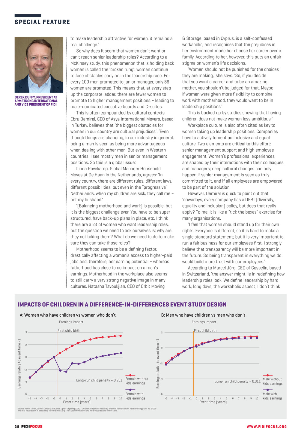 S P E C I A L F E ATURE & Storage, based in Cyprus, is a self-confessed workaholic, and recognises that the prejudices in her environment made her choose her career over a family. According to her, however, this puts an unfair stigma on womens life decisions. Women should not be punished for the choices they are making, she says. So, if you decide that you want a career and to be an amazing mother, you shouldnt be judged for that. Maybe if women were given more flexibility to combine work with motherhood, they would want to be in leadership positions. This is backed up by studies showing that having children does not make women less ambitious.2 Workplace culture is also often cited as key to women taking up leadership positions. Companies have to actively foment an inclusive and equal culture. Two elements are critical to this effort: senior management support and high employee engagement. Womens professional experiences are shaped by their interactions with their colleagues and managers; deep cultural changes can only happen if senior management is seen as truly committed to it, and if all employees are empowered to be part of the solution. However, Demirel is quick to point out that nowadays, every company has a DE&I [diversity, equality and inclusion] policy, but does that really apply? To me, it is like a tick the boxes exercise for many organisations. I feel that women should stand up for their own rights. Everyone is different, so it is hard to make a single standard statement; but it is very important to run a fair business for our employees first. I strongly believe that transparency will be more important in the future. So being transparent in everything we do would build more trust with our employees. According to Marcel Jrg, CEO of Gosselin, based in Switzerland, the answer might lie in redefining how leadership roles look. We define leadership by hard work, long days, the workaholic aspect; I dont think to make leadership attractive for women, it remains a real challenge. So why does it seem that women dont want or cant reach senior leadership roles? According to a McKinsey study, this phenomenon that is holding back women is called the broken rung: women continue to face obstacles early on in the leadership race. For every 100 men promoted to junior manager, only 86 women are promoted. This means that, at every step up the corporate ladder, there are fewer women to promote to higher management positions leading to male-dominated executive boards and C-suites. This is often compounded by cultural contexts. Ebru Demirel, CEO of Asya International Movers, based in Turkey, believes that the biggest obstacles for women in our country are cultural prejudices. Even though things are changing, in our industry in general, being a man is seen as being more advantageous when dealing with other men. But even in Western countries, I see mostly men in senior management positions. So this is a global issue. Linda Rovekamp, Global Manager Household Moves at De Haan in the Netherlands, agrees: In every country, there are different rules, different laws, different possibilities, but even in the progressive Netherlands, when my children are sick, they call me not my husband. [Balancing motherhood and work] is possible, but it is the biggest challenge ever. You have to be super structured, have back-up plans in place, etc. I think there are a lot of women who want leadership roles, but the question we need to ask ourselves is: why are they not taking them? What do we need to do to make sure they can take those roles? Motherhood seems to be a defining factor, drastically affecting a womans access to higher-paid jobs and, therefore, her earning potential whereas fatherhood has close to no impact on a mans earnings. Motherhood in the workplace also seems to still carry a very strong negative image in many cultures. Natasha Tavoukjian, CEO of Orbit Moving DEREK DUFFY, PRESIDENT AT ARMSTRONG INTERNATIONAL AND VICE PRESIDENT OF FIDI IMPACTS OF CHILDREN IN A DIFFERENCE-IN-DIFFERENCES EVENT STUDY DESIGN A: Women who have children vs women who dont B: Men who have children vs men who dont Earnings impact First child birth 2 0 -2 Long-run child penalty = 0.231 Female without kids earnings -4 -6 -5 -4 -3 -2 -1 0 1 2 3 First child birth 2 4 5 Event time (years) 6 7 8 9 10 Earnings relative to event time -1 4 Earnings relative to event time -1 Earnings impact Female with kids earnings 0 -2 -4 Long-run child penalty = 0.011 -6 -5 -4 -3 -2 -1 0 1 2 3 4 5 Event time (years) 6 7 8 9 10 Male without kids earnings Male with kids earnings Source: Henrik Kleven, Camille Landais, and Jakob Egholt Sgaard (2018) - Children and gender inequality: evidence from Denmark. NBER Working paper no. 24219 The data visualization is adapted by ourworldindata.org. There you find research and more visualizations on this topic. 28 FF307 September-November 22 pp26-31 Gender parity.indd 28 WW W. F I D I FOC U S . OR G 06/09/2022 12:40