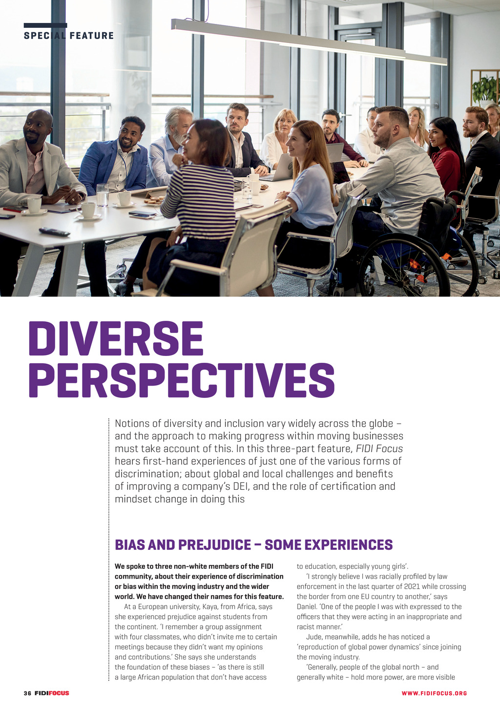 S P E C I A L F E ATURE DIVERSE PERSPECTIVES Notions of diversity and inclusion vary widely across the globe and the approach to making progress within moving businesses must take account of this. In this three-part feature, FIDI Focus hears first-hand experiences of just one of the various forms of discrimination; about global and local challenges and benefits of improving a companys DEI, and the role of certification and mindset change in doing this BIAS AND PREJUDICE SOME EXPERIENCES We spoke to three non-white members of the FIDI community, about their experience of discrimination or bias within the moving industry and the wider world. We have changed their names for this feature. At a European university, Kaya, from Africa, says she experienced prejudice against students from the continent. I remember a group assignment with four classmates, who didnt invite me to certain meetings because they didnt want my opinions and contributions. She says she understands the foundation of these biases as there is still a large African population that dont have access 36 FF307 September-November 22 pp36-41 Special feature_global view of diversity.indd 36 to education, especially young girls. I strongly believe I was racially profiled by law enforcement in the last quarter of 2021 while crossing the border from one EU country to another, says Daniel. One of the people I was with expressed to the officers that they were acting in an inappropriate and racist manner. Jude, meanwhile, adds he has noticed a reproduction of global power dynamics since joining the moving industry. Generally, people of the global north and generally white hold more power, are more visible WW W. F I D I FOC U S . OR G 06/09/2022 07:33