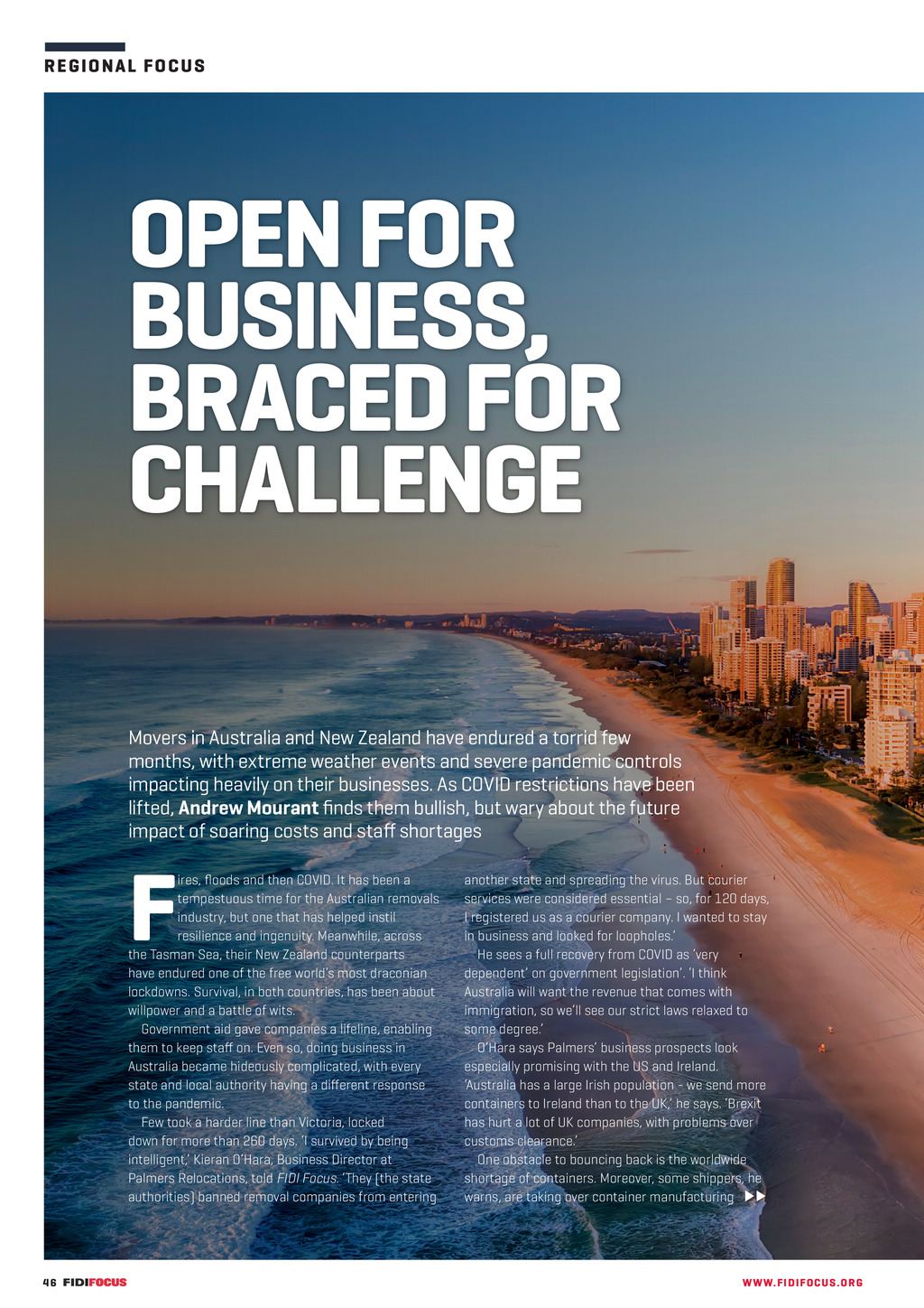 R E G I O N A L FOCUS OPEN FOR BUSINESS, BRACED FOR CHALLENGE Movers in Australia and New Zealand have endured a torrid few months, with extreme weather events and severe pandemic controls impacting heavily on their businesses. As COVID restrictions have been lifted, Andrew Mourant finds them bullish, but wary about the future impact of soaring costs and staff shortages F ires, floods and then COVID. It has been a tempestuous time for the Australian removals industry, but one that has helped instil resilience and ingenuity. Meanwhile, across the Tasman Sea, their New Zealand counterparts have endured one of the free worlds most draconian lockdowns. Survival, in both countries, has been about willpower and a battle of wits. Government aid gave companies a lifeline, enabling them to keep staff on. Even so, doing business in Australia became hideously complicated, with every state and local authority having a different response to the pandemic. Few took a harder line than Victoria, locked down for more than 260 days. I survived by being intelligent, Kieran OHara, Business Director at Palmers Relocations, told FIDI Focus. They (the state authorities) banned removal companies from entering 46 FF307 September-November 22 pp46-53 Regional Focus.indd 46 another state and spreading the virus. But courier services were considered essential so, for 120 days, I registered us as a courier company. I wanted to stay in business and looked for loopholes. He sees a full recovery from COVID as very dependent on government legislation. I think Australia will want the revenue that comes with immigration, so well see our strict laws relaxed to some degree. OHara says Palmers business prospects look especially promising with the US and Ireland. Australia has a large Irish population - we send more containers to Ireland than to the UK, he says. Brexit has hurt a lot of UK companies, with problems over customs clearance. One obstacle to bouncing back is the worldwide shortage of containers. Moreover, some shippers, he warns, are taking over container manufacturing WW W. F I D I FOC U S . OR G 06/09/2022 07:42