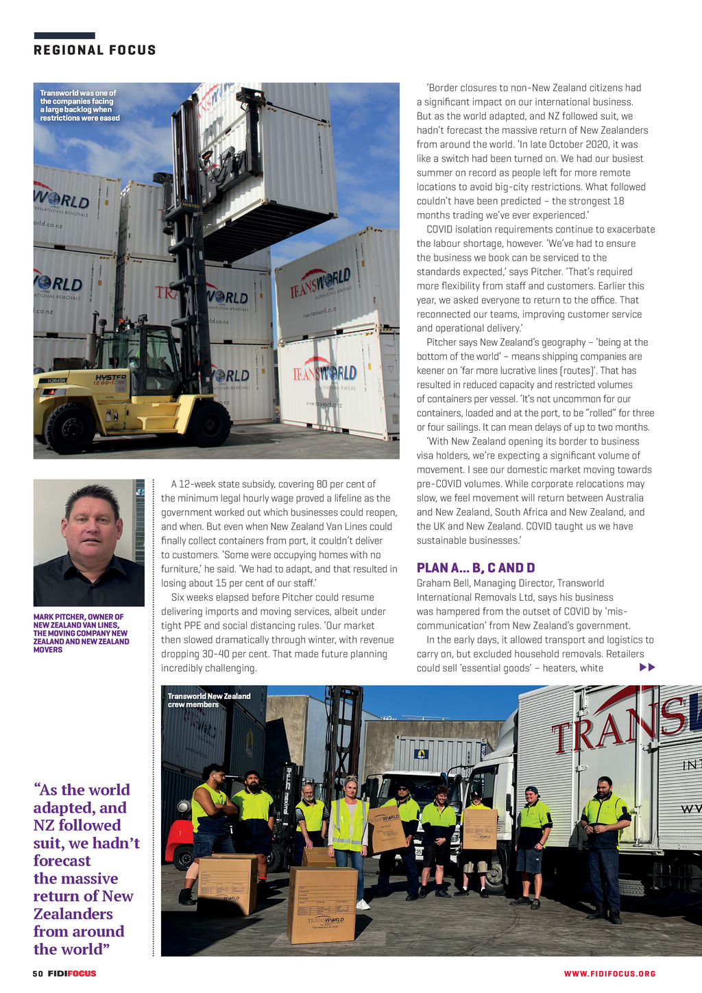 R E G I O N A L FOCUS Transworld was one of the companies facing a large backlog when restrictions were eased MARK PITCHER, OWNER OF NEW ZEALAND VAN LINES, THE MOVING COMPANY NEW ZEALAND AND NEW ZEALAND MOVERS A 12-week state subsidy, covering 80 per cent of the minimum legal hourly wage proved a lifeline as the government worked out which businesses could reopen, and when. But even when New Zealand Van Lines could finally collect containers from port, it couldnt deliver to customers. Some were occupying homes with no furniture, he said. We had to adapt, and that resulted in losing about 15 per cent of our staff. Six weeks elapsed before Pitcher could resume delivering imports and moving services, albeit under tight PPE and social distancing rules. Our market then slowed dramatically through winter, with revenue dropping 30-40 per cent. That made future planning incredibly challenging. Border closures to non-New Zealand citizens had a significant impact on our international business. But as the world adapted, and NZ followed suit, we hadnt forecast the massive return of New Zealanders from around the world. In late October 2020, it was like a switch had been turned on. We had our busiest summer on record as people left for more remote locations to avoid big-city restrictions. What followed couldnt have been predicted the strongest 18 months trading weve ever experienced. COVID isolation requirements continue to exacerbate the labour shortage, however. Weve had to ensure the business we book can be serviced to the standards expected, says Pitcher. Thats required more flexibility from staff and customers. Earlier this year, we asked everyone to return to the office. That reconnected our teams, improving customer service and operational delivery. Pitcher says New Zealands geography being at the bottom of the world means shipping companies are keener on far more lucrative lines (routes). That has resulted in reduced capacity and restricted volumes of containers per vessel. Its not uncommon for our containers, loaded and at the port, to be rolled for three or four sailings. It can mean delays of up to two months. With New Zealand opening its border to business visa holders, were expecting a significant volume of movement. I see our domestic market moving towards pre-COVID volumes. While corporate relocations may slow, we feel movement will return between Australia and New Zealand, South Africa and New Zealand, and the UK and New Zealand. COVID taught us we have sustainable businesses. PLAN A B, C AND D Graham Bell, Managing Director, Transworld International Removals Ltd, says his business was hampered from the outset of COVID by miscommunication from New Zealands government. In the early days, it allowed transport and logistics to carry on, but excluded household removals. Retailers could sell essential goods heaters, white Transworld New Zealand crew members As the world adapted, and NZ followed suit, we hadnt forecast the massive return of New Zealanders from around the world 50 FF307 September-November 22 pp46-53 Regional Focus.indd 50 WW W. F I D I FOC U S . OR G 06/09/2022 07:42 FIDI A