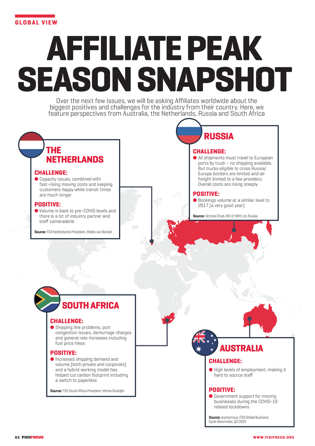 G LO BA L V I E W AFFILIATE PEAK SEASON SNAPSHOT Over the next few issues, we will be asking Affiliates worldwide about the biggest positives and challenges for the industry from their country. Here, we feature perspectives from Australia, the Netherlands, Russia and South Africa RUSSIA THE NETHERLANDS CHALLENGE: l Capacity issues, combined with fast-rising moving costs and keeping customers happy while transit times are much longer POSITIVE: l Volume is back to pre-COVID levels and there is a lot of industry partner and staff camaraderie CHALLENGE: l All shipments must travel to European ports by truck no shipping available. But trucks eligible to cross Russia/ Europe borders are limited and air freight limited to a few providers. Overall costs are rising steeply POSITIVE: l Bookings volume at a similar level to 2017 (a very good year) Source: Victoria Chub, MD of IWM Ltd, Russia Source: FIDI Netherlands President, Wiebe van Bockel SOUTH AFRICA CHALLENGE: l Shipping line problems, port congestion issues, demurrage charges and general rate increases including fuel price hikes POSITIVE: l Increased shipping demand and volume (both private and corporate) and a hybrid working model has helped cut carbon footprint including a switch to paperless Source: FIDI South Africa President, Morne Rudolph AUSTRALIA CHALLENGE: l High levels of employment, making it hard to source staff POSITIVE: l Government support for moving businesses during the COVID-19 related lockdowns Source: anonymous, FIDI Global Business Cycle Barometer, Q3 2022 62 FF307 September-November 22 pp62-63 Country round up.indd 62 WW W. F I D I FOC U S . OR G 06/09/2022 07:48