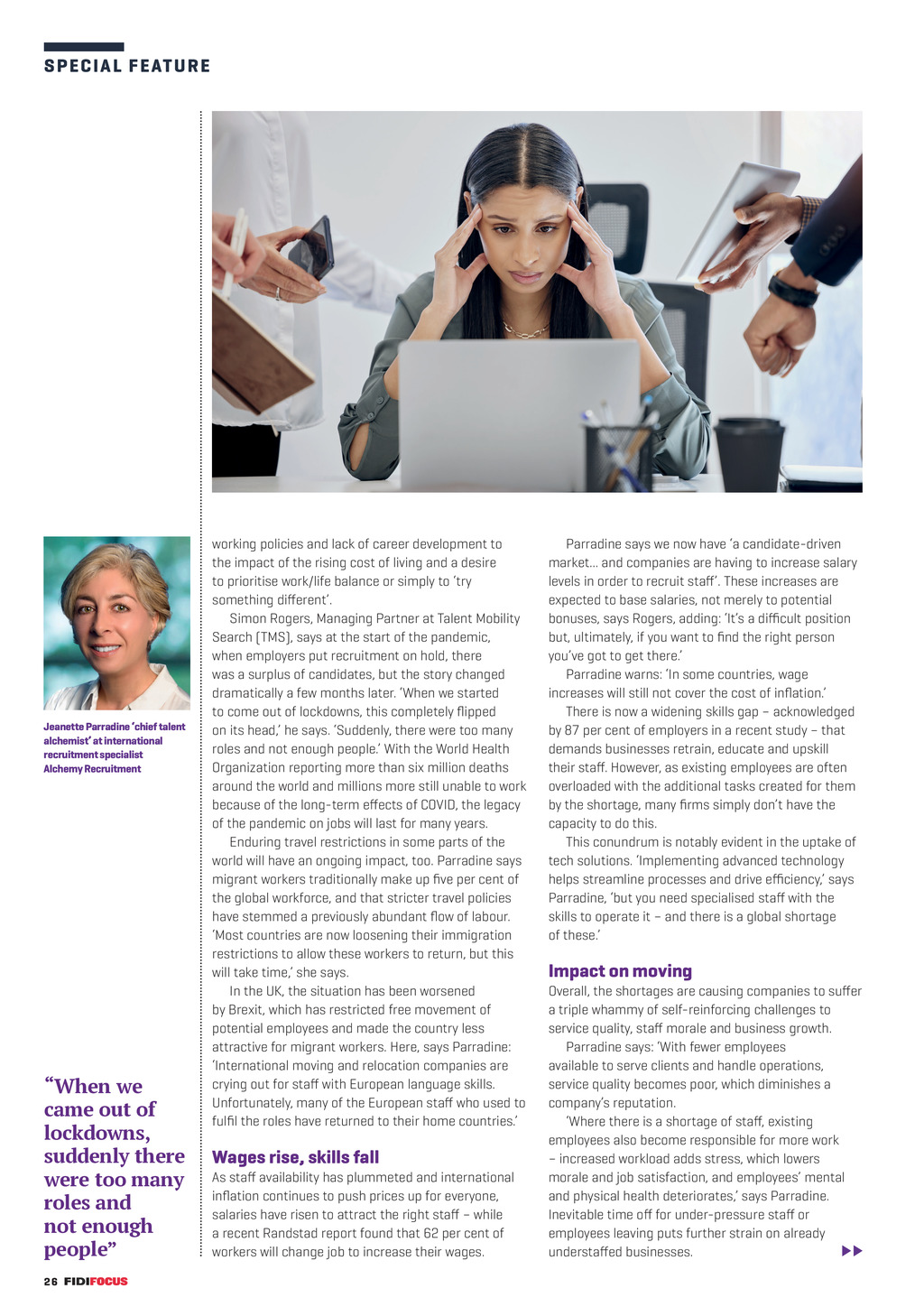 S P E C I A L F E ATURE Jeanette Parradine chief talent alchemist at international recruitment specialist Alchemy Recruitment When we came out of lockdowns, suddenly there were too many roles and not enough people working policies and lack of career development to the impact of the rising cost of living and a desire to prioritise work/life balance or simply to try something different. Simon Rogers, Managing Partner at Talent Mobility Search (TMS), says at the start of the pandemic, when employers put recruitment on hold, there was a surplus of candidates, but the story changed dramatically a few months later. When we started to come out of lockdowns, this completely flipped on its head, he says. Suddenly, there were too many roles and not enough people. With the World Health Organization reporting more than six million deaths around the world and millions more still unable to work because of the long-term effects of COVID, the legacy of the pandemic on jobs will last for many years. Enduring travel restrictions in some parts of the world will have an ongoing impact, too. Parradine says migrant workers traditionally make up five per cent of the global workforce, and that stricter travel policies have stemmed a previously abundant flow of labour. Most countries are now loosening their immigration restrictions to allow these workers to return, but this will take time, she says. In the UK, the situation has been worsened by Brexit, which has restricted free movement of potential employees and made the country less attractive for migrant workers. Here, says Parradine: International moving and relocation companies are crying out for staff with European language skills. Unfortunately, many of the European staff who used to fulfil the roles have returned to their home countries. Wages rise, skills fall As staff availability has plummeted and international inflation continues to push prices up for everyone, salaries have risen to attract the right staff while a recent Randstad report found that 62 per cent of workers will change job to increase their wages. Parradine says we now have a candidate-driven market... and companies are having to increase salary levels in order to recruit staff. These increases are expected to base salaries, not merely to potential bonuses, says Rogers, adding: Its a difficult position but, ultimately, if you want to find the right person youve got to get there. Parradine warns: In some countries, wage increases will still not cover the cost of inflation. There is now a widening skills gap acknowledged by 87 per cent of employers in a recent study that demands businesses retrain, educate and upskill their staff. However, as existing employees are often overloaded with the additional tasks created for them by the shortage, many firms simply dont have the capacity to do this. This conundrum is notably evident in the uptake of tech solutions. Implementing advanced technology helps streamline processes and drive efficiency, says Parradine, but you need specialised staff with the skills to operate it and there is a global shortage of these. Impact on moving Overall, the shortages are causing companies to suffer a triple whammy of self-reinforcing challenges to service quality, staff morale and business growth. Parradine says: With fewer employees available to serve clients and handle operations, service quality becomes poor, which diminishes a companys reputation. Where there is a shortage of staff, existing employees also become responsible for more work increased workload adds stress, which lowers morale and job satisfaction, and employees mental and physical health deteriorates, says Parradine. Inevitable time off for under-pressure staff or employees leaving puts further strain on already understaffed businesses. 26 FF308 Dec-Jan 23 pp24-31 Recruitment.indd 26 06/12/2022 11:18 DBon