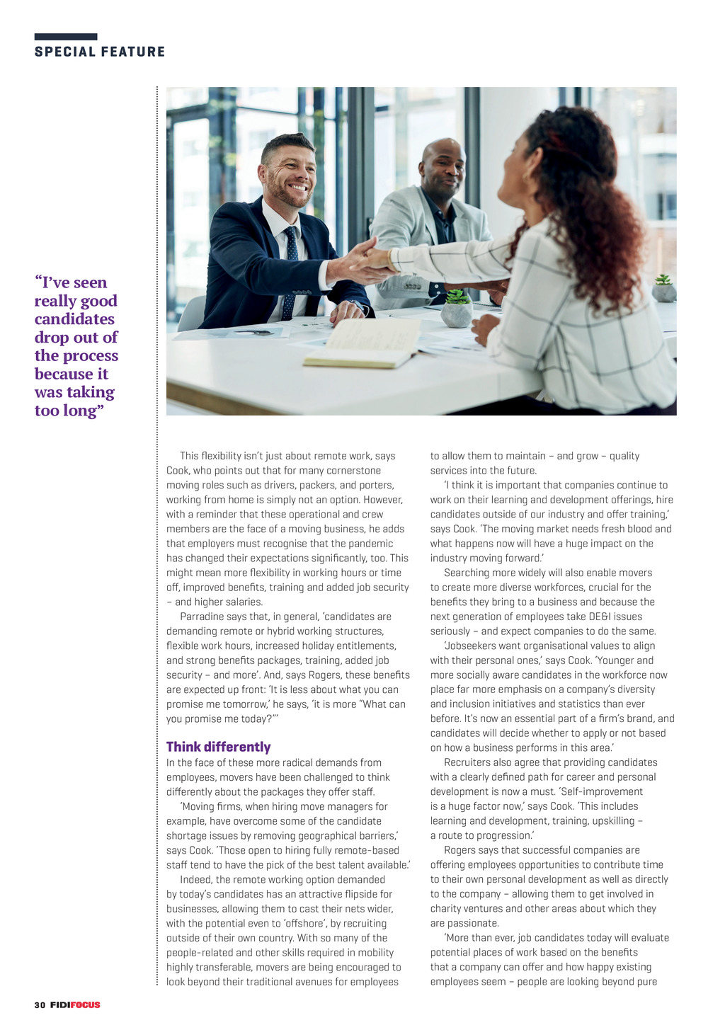 S P E C I A L F E ATURE Ive seen really good candidates drop out of the process because it was taking too long This flexibility isnt just about remote work, says Cook, who points out that for many cornerstone moving roles such as drivers, packers, and porters, working from home is simply not an option. However, with a reminder that these operational and crew members are the face of a moving business, he adds that employers must recognise that the pandemic has changed their expectations significantly, too. This might mean more flexibility in working hours or time off, improved benefits, training and added job security and higher salaries. Parradine says that, in general, candidates are demanding remote or hybrid working structures, flexible work hours, increased holiday entitlements, and strong benefits packages, training, added job security and more. And, says Rogers, these benefits are expected up front: It is less about what you can promise me tomorrow, he says, it is more What can you promise me today? Think differently In the face of these more radical demands from employees, movers have been challenged to think differently about the packages they offer staff. Moving firms, when hiring move managers for example, have overcome some of the candidate shortage issues by removing geographical barriers, says Cook. Those open to hiring fully remote-based staff tend to have the pick of the best talent available. Indeed, the remote working option demanded by todays candidates has an attractive flipside for businesses, allowing them to cast their nets wider, with the potential even to offshore, by recruiting outside of their own country. With so many of the people-related and other skills required in mobility highly transferable, movers are being encouraged to look beyond their traditional avenues for employees to allow them to maintain and grow quality services into the future. I think it is important that companies continue to work on their learning and development offerings, hire candidates outside of our industry and offer training, says Cook. The moving market needs fresh blood and what happens now will have a huge impact on the industry moving forward. Searching more widely will also enable movers to create more diverse workforces, crucial for the benefits they bring to a business and because the next generation of employees take DE&I issues seriously and expect companies to do the same. Jobseekers want organisational values to align with their personal ones, says Cook. Younger and more socially aware candidates in the workforce now place far more emphasis on a companys diversity and inclusion initiatives and statistics than ever before. Its now an essential part of a firms brand, and candidates will decide whether to apply or not based on how a business performs in this area. Recruiters also agree that providing candidates with a clearly defined path for career and personal development is now a must. Self-improvement is a huge factor now, says Cook. This includes learning and development, training, upskilling a route to progression. Rogers says that successful companies are offering employees opportunities to contribute time to their own personal development as well as directly to the company allowing them to get involved in charity ventures and other areas about which they are passionate. More than ever, job candidates today will evaluate potential places of work based on the benefits that a company can offer and how happy existing employees seem people are looking beyond pure 30 FF308 Dec-Jan 23 pp24-31 Recruitment.indd 30 06/12/2022 11:18