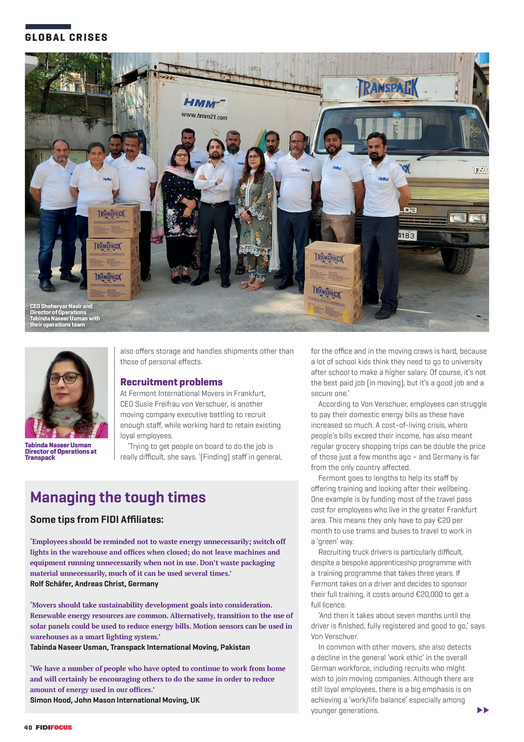 G LO BA L C R I SES CEO Sheheryar Nasir and Director of Operations Tabinda Naseer Usman with their operations team also offers storage and handles shipments other than those of personal effects. Recruitment problems Tabinda Naseer Usman Director of Operations at Transpack At Fermont International Movers in Frankfurt, CEO Susie Freifrau von Verschuer, is another moving company executive battling to recruit enough staff, while working hard to retain existing loyal employees. Trying to get people on board to do the job is really difficult, she says. (Finding) staff in general, Managing the tough times Some tips from FIDI Affiliates: Employees should be reminded not to waste energy unnecessarily; switch off lights in the warehouse and ofces when closed; do not leave machines and equipment running unnecessarily when not in use. Dont waste packaging material unnecessarily, much of it can be used several times. Rolf Schfer, Andreas Christ, Germany Movers should take sustainability development goals into consideration. Renewable energy resources are common. Alternatively, transition to the use of solar panels could be used to reduce energy bills. Motion sensors can be used in warehouses as a smart lighting system. Tabinda Naseer Usman, Transpack International Moving, Pakistan We have a number of people who have opted to continue to work from home and will certainly be encouraging others to do the same in order to reduce amount of energy used in our ofces. Simon Hood, John Mason International Moving, UK for the office and in the moving crews is hard, because a lot of school kids think they need to go to university after school to make a higher salary. Of course, its not the best paid job (in moving), but its a good job and a secure one. According to Von Verschuer, employees can struggle to pay their domestic energy bills as these have increased so much. A cost-of-living crisis, where peoples bills exceed their income, has also meant regular grocery shopping trips can be double the price of those just a few months ago and Germany is far from the only country affected. Fermont goes to lengths to help its staff by offering training and looking after their wellbeing. One example is by funding most of the travel pass cost for employees who live in the greater Frankfurt area. This means they only have to pay 20 per month to use trams and buses to travel to work in a green way. Recruiting truck drivers is particularly difficult, despite a bespoke apprenticeship programme with a training programme that takes three years. If Fermont takes on a driver and decides to sponsor their full training, it costs around 20,000 to get a full licence. And then it takes about seven months until the driver is finished, fully registered and good to go, says Von Verschuer. In common with other movers, she also detects a decline in the general work ethic in the overall German workforce, including recruits who might wish to join moving companies. Although there are still loyal employees, there is a big emphasis is on achieving a work/life balance especially among younger generations. 40 FF308 Dec-Jan 23 pp36-43 Regional Focus Global Crises.indd 40 05/12/2022 17:00