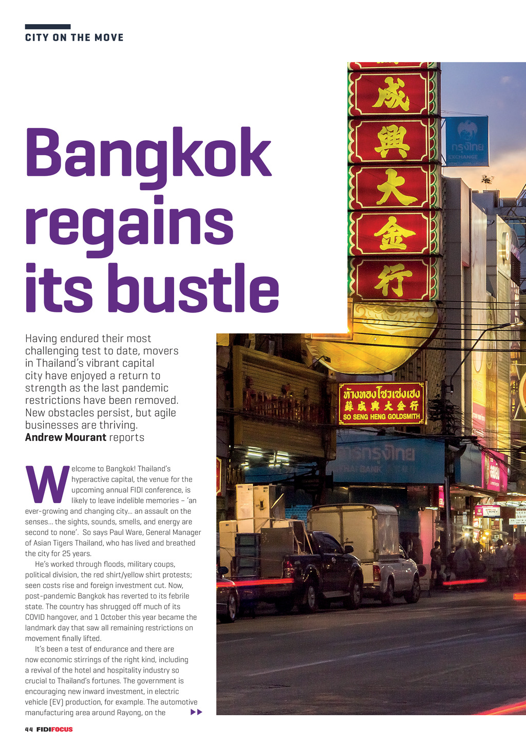 CI T Y O N T H E MOVE Bangkok regains its bustle Having endured their most challenging test to date, movers in Thailands vibrant capital city have enjoyed a return to strength as the last pandemic restrictions have been removed. New obstacles persist, but agile businesses are thriving. Andrew Mourant reports W elcome to Bangkok! Thailands hyperactive capital, the venue for the upcoming annual FIDI conference, is likely to leave indelible memories an ever-growing and changing city... an assault on the senses... the sights, sounds, smells, and energy are second to none. So says Paul Ware, General Manager of Asian Tigers Thailand, who has lived and breathed the city for 25 years. Hes worked through floods, military coups, political division, the red shirt/yellow shirt protests; seen costs rise and foreign investment cut. Now, post-pandemic Bangkok has reverted to its febrile state. The country has shrugged off much of its COVID hangover, and 1 October this year became the landmark day that saw all remaining restrictions on movement finally lifted. Its been a test of endurance and there are now economic stirrings of the right kind, including a revival of the hotel and hospitality industry so crucial to Thailands fortunes. The government is encouraging new inward investment, in electric vehicle (EV) production, for example. The automotive manufacturing area around Rayong, on the 44 FF308 Dec-Jan 23 pp44-51 City on the move Bangkok.indd 44 05/12/2022 17:04