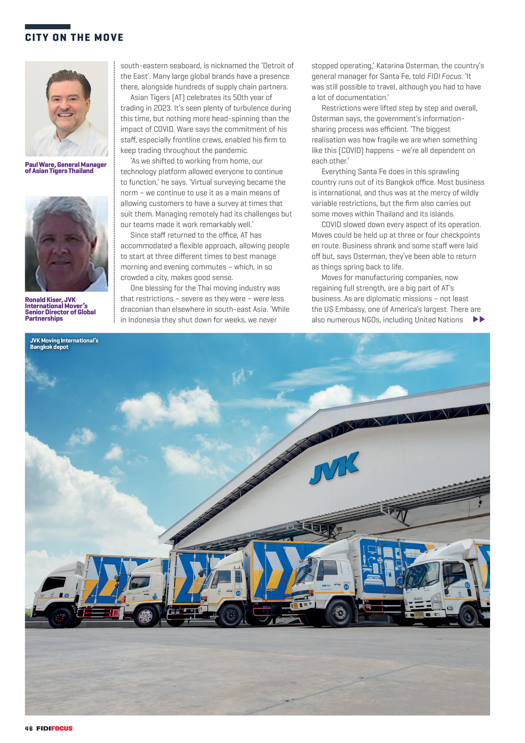 CI T Y O N T H E MOVE Paul Ware, General Manager of Asian Tigers Thailand Ronald Kiser, JVK International Movers Senior Director of Global Partnerships south-eastern seaboard, is nicknamed the Detroit of the East. Many large global brands have a presence there, alongside hundreds of supply chain partners. Asian Tigers (AT) celebrates its 50th year of trading in 2023. Its seen plenty of turbulence during this time, but nothing more head-spinning than the impact of COVID. Ware says the commitment of his staff, especially frontline crews, enabled his firm to keep trading throughout the pandemic. As we shifted to working from home, our technology platform allowed everyone to continue to function, he says. Virtual surveying became the norm we continue to use it as a main means of allowing customers to have a survey at times that suit them. Managing remotely had its challenges but our teams made it work remarkably well. Since staff returned to the office, AT has accommodated a flexible approach, allowing people to start at three different times to best manage morning and evening commutes which, in so crowded a city, makes good sense. One blessing for the Thai moving industry was that restrictions severe as they were were less draconian than elsewhere in south-east Asia. While in Indonesia they shut down for weeks, we never stopped operating, Katarina Osterman, the countrys general manager for Santa Fe, told FIDI Focus. It was still possible to travel, although you had to have a lot of documentation. Restrictions were lifted step by step and overall, Osterman says, the governments informationsharing process was efficient. The biggest realisation was how fragile we are when something like this (COVID) happens were all dependent on each other. Everything Santa Fe does in this sprawling country runs out of its Bangkok office. Most business is international, and thus was at the mercy of wildly variable restrictions, but the firm also carries out some moves within Thailand and its islands. COVID slowed down every aspect of its operation. Moves could be held up at three or four checkpoints en route. Business shrank and some staff were laid off but, says Osterman, theyve been able to return as things spring back to life. Moves for manufacturing companies, now regaining full strength, are a big part of ATs business. As are diplomatic missions not least the US Embassy, one of Americas largest. There are also numerous NGOs, including United Nations JVK Moving Internationals Bangkok depot 46 FF308 Dec-Jan 23 pp44-51 City on the move Bangkok.indd 46 05/12/2022 17:04