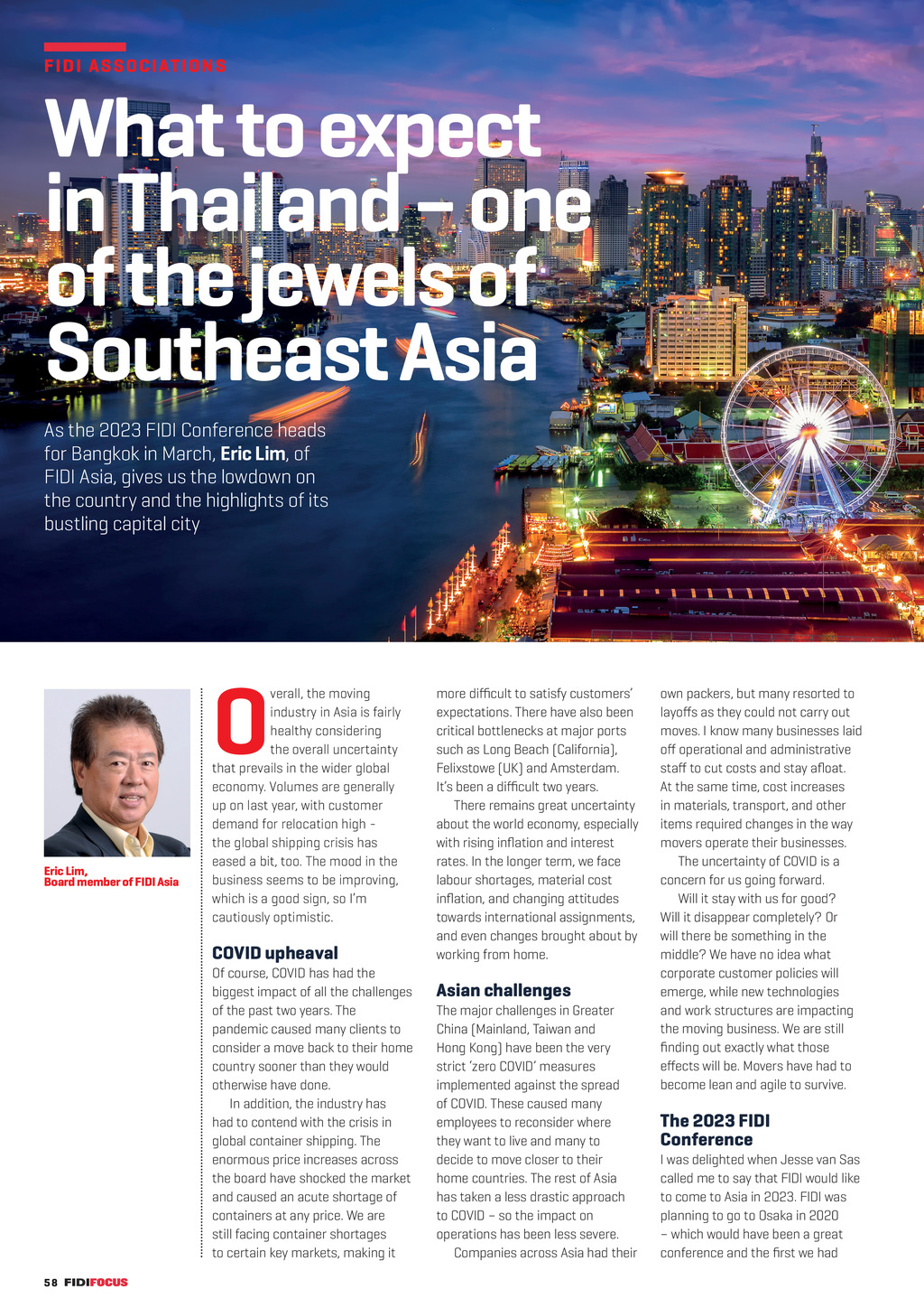 F ID I AS SO C I ATI O NS What to expect in Thailand one of the jewels of Southeast Asia As the 2023 FIDI Conference heads for Bangkok in March, Eric Lim, of FIDI Asia, gives us the lowdown on the country and the highlights of its bustling capital city O Eric Lim, Board member of FIDI Asia verall, the moving industry in Asia is fairly healthy considering the overall uncertainty that prevails in the wider global economy. Volumes are generally up on last year, with customer demand for relocation high the global shipping crisis has eased a bit, too. The mood in the business seems to be improving, which is a good sign, so Im cautiously optimistic. COVID upheaval Of course, COVID has had the biggest impact of all the challenges of the past two years. The pandemic caused many clients to consider a move back to their home country sooner than they would otherwise have done. In addition, the industry has had to contend with the crisis in global container shipping. The enormous price increases across the board have shocked the market and caused an acute shortage of containers at any price. We are still facing container shortages to certain key markets, making it more difficult to satisfy customers expectations. There have also been critical bottlenecks at major ports such as Long Beach (California), Felixstowe (UK) and Amsterdam. Its been a difficult two years. There remains great uncertainty about the world economy, especially with rising inflation and interest rates. In the longer term, we face labour shortages, material cost inflation, and changing attitudes towards international assignments, and even changes brought about by working from home. Asian challenges The major challenges in Greater China (Mainland, Taiwan and Hong Kong) have been the very strict zero COVID measures implemented against the spread of COVID. These caused many employees to reconsider where they want to live and many to decide to move closer to their home countries. The rest of Asia has taken a less drastic approach to COVID so the impact on operations has been less severe. Companies across Asia had their own packers, but many resorted to layoffs as they could not carry out moves. I know many businesses laid off operational and administrative staff to cut costs and stay afloat. At the same time, cost increases in materials, transport, and other items required changes in the way movers operate their businesses. The uncertainty of COVID is a concern for us going forward. Will it stay with us for good? Will it disappear completely? Or will there be something in the middle? We have no idea what corporate customer policies will emerge, while new technologies and work structures are impacting the moving business. We are still finding out exactly what those effects will be. Movers have had to become lean and agile to survive. The 2023 FIDI Conference I was delighted when Jesse van Sas called me to say that FlDl would like to come to Asia in 2O23. FlDl was planning to go to Osaka in 2020 which would have been a great conference and the first we had 58 FF308 Dec-Jan 23 pp58-59 Associations.indd 58 06/12/2022 11:21