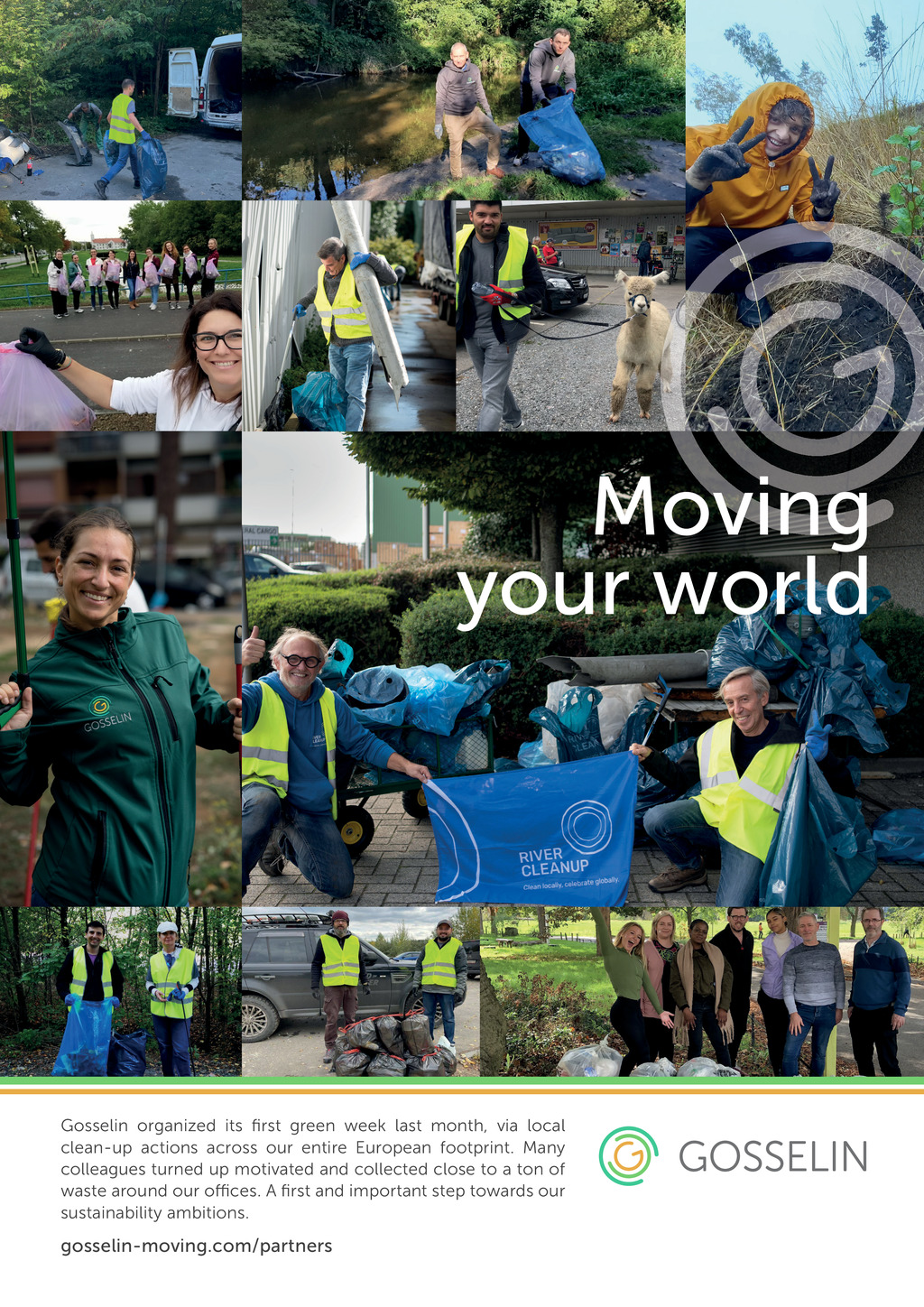 Moving your world Gosselin organized its first green week last month, via local clean-up actions across our entire European footprint. Many colleagues turned up motivated and collected close to a ton of waste around our offices. A first and important step towards our sustainability ambitions. gosselin-moving.com/partners FF308 Dec-Jan 23 pp82-84 People moves.indd 84 05/12/2022 17:27