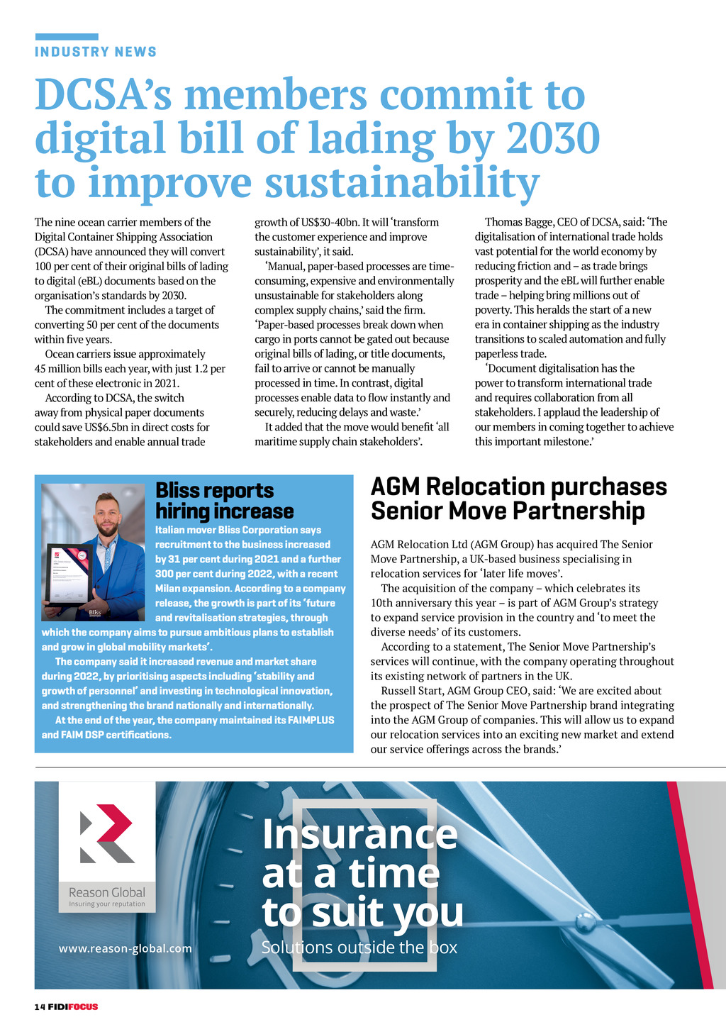 I ND U ST RY N E WS DCSAs members commit to digital bill of lading by 2030 to improve sustainability The nine ocean carrier members of the Digital Container Shipping Association (DCSA) have announced they will convert 100 per cent of their original bills of lading to digital (eBL) documents based on the organisations standards by 2030. The commitment includes a target of converting 50 per cent of the documents within five years. Ocean carriers issue approximately 45 million bills each year, with just 1.2 per cent of these electronic in 2021. According to DCSA, the switch away from physical paper documents could save US$6.5bn in direct costs for stakeholders and enable annual trade growth of US$30-40bn. It will transform the customer experience and improve sustainability, it said. Manual, paper-based processes are timeconsuming, expensive and environmentally unsustainable for stakeholders along complex supply chains, said the firm. Paper-based processes break down when cargo in ports cannot be gated out because original bills of lading, or title documents, fail to arrive or cannot be manually processed in time. In contrast, digital processes enable data to flow instantly and securely, reducing delays and waste. It added that the move would benefit all maritime supply chain stakeholders. Bliss reports hiring increase Italian mover Bliss Corporation says recruitment to the business increased by 31 per cent during 2021 and a further 300 per cent during 2022, with a recent Milan expansion. According to a company release, the growth is part of its future and revitalisation strategies, through which the company aims to pursue ambitious plans to establish and grow in global mobility markets. The company said it increased revenue and market share during 2022, by prioritising aspects including stability and growth of personnel and investing in technological innovation, and strengthening the brand nationally and internationally. At the end of the year, the company maintained its FAIMPLUS and FAIM DSP certifications. AGM Relocation purchases Senior Move Partnership AGM Relocation Ltd (AGM Group) has acquired The Senior Move Partnership, a UK-based business specialising in relocation services for later life moves. The acquisition of the company which celebrates its 10th anniversary this year is part of AGM Groups strategy to expand service provision in the country and to meet the diverse needs of its customers. According to a statement, The Senior Move Partnerships services will continue, with the company operating throughout its existing network of partners in the UK. Russell Start, AGM Group CEO, said: We are excited about the prospect of The Senior Move Partnership brand integrating into the AGM Group of companies. This will allow us to expand our relocation services into an exciting new market and extend our service offerings across the brands. Insurance at a time to suit you www.reason-global.com 14 Thomas Bagge, CEO of DCSA, said: The digitalisation of international trade holds vast potential for the world economy by reducing friction and as trade brings prosperity and the eBL will further enable trade helping bring millions out of poverty. This heralds the start of a new era in container shipping as the industry transitions to scaled automation and fully paperless trade. Document digitalisation has the power to transform international trade and requires collaboration from all stakeholders. I applaud the leadership of our members in coming together to achieve this important milestone. Solutions outside the box