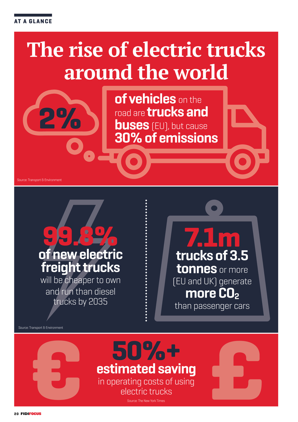 AT A G L A N C E The rise of electric trucks around the world 2% of vehicles on the road are trucks and buses (EU), but cause 30% of emissions Source: Transport & Environment 99.8% of new electric 7.1m trucks of 3.5 will be cheaper to own and run than diesel trucks by 2035 (EU and UK) generate freight trucks tonnes or more more CO2 than passenger cars Source: Transport & Environment 50%+ estimated saving in operating costs of using electric trucks Source: The New York Times 20