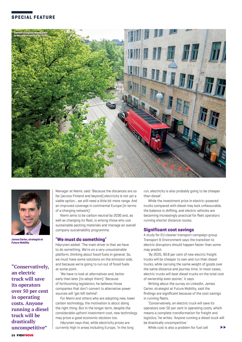 SP EC I A L FE AT U R E Finnish company Niemi aims to be carbon neutral by 2030 Manager at Niemi, said: Because the distances are so far (across Finland and beyond) electricity is not yet a viable option... we still need a little bit more range. And an improved coverage in continental Europe (in terms of a charging network). Niemi aims to be carbon neutral by 2030 and, as well as changing its fleet, is among those who use sustainable packing materials and manage an overall company sustainability programme. James Carter, strategist at Future Mobility Conservatively, an electric truck will save its operators over 50 per cent in operating costs. Anyone running a diesel truck will be drastically uncompetitive 26 We must do something Hyrynen added: The main driver is that we have to do something. Were on a very unsustainable platform, thinking about fossil fuels in general. So, we must have some solutions on the emission side, and because were going to run out of fossil fuels at some point. We have to look at alternatives and, better early than later (to adopt them). Because of forthcoming legislation, he believes those companies that dont convert to alternative power sources will get left behind. For Niemi and others who are adopting new, lower carbon technology, the motivation is about doing the right thing. But in the longer term, despite the considerable upfront investment cost, new technology may prove a good economic decision too. Hyrynen says that, while electricity prices are currently high in areas including Europe, in the long run, electricity is also probably going to be cheaper than diesel. While the investment price in electric-powered trucks compared with diesel may look unfavourable, the balance is shifting, and electric vehicles are becoming increasingly practical for fleet operators running shorter distance routes. Significant cost savings A study for EU cleaner transport campaign group Transport & Environment says the transition to electric disruptors should happen faster than some may predict. By 2035, 99.8 per cent of new electric freight trucks will be cheaper to own and run than diesel trucks, while carrying the same weight of goods over the same distance and journey time. In most cases, electric trucks will beat diesel trucks on the total cost of ownership even sooner, it says. Writing about the survey on LinkedIn, James Carter, strategist at Future Mobility, said the findings are significant because of the cost savings in running fleets. Conservatively, an electric truck will save its operators over 50 per cent in operating costs, which means a complete transformation for freight and logistics, he writes. Anyone running a diesel truck will be drastically uncompetitive. While cost is also a problem for fuel cell
