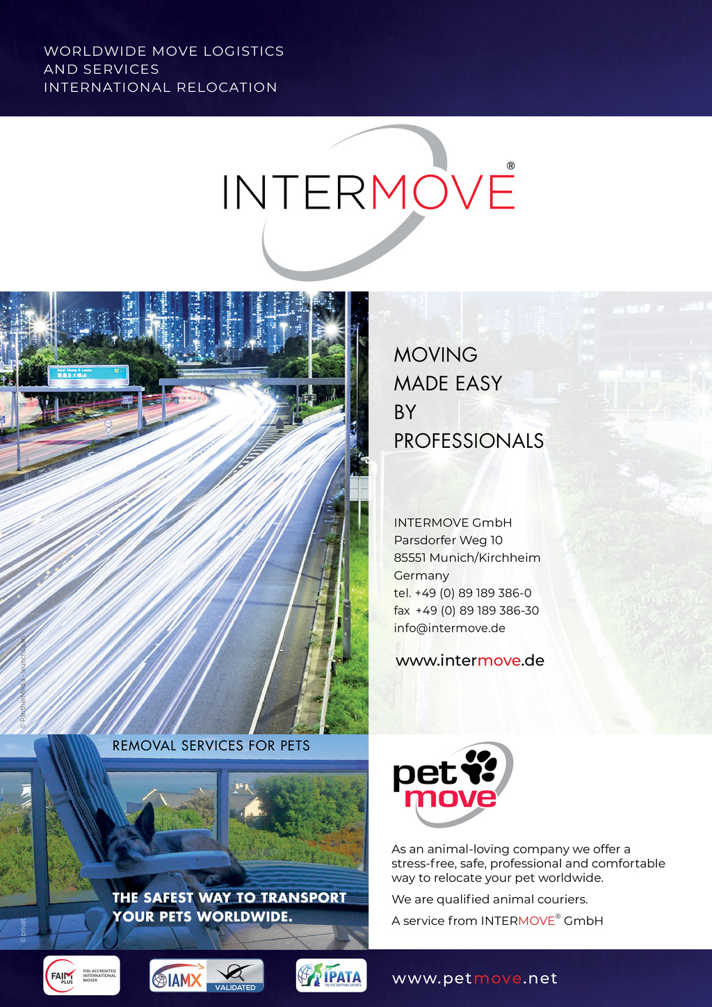 WORLDWIDE MOVE LOGISTICS AND SERVICES INTERNATIONAL RELOCATION MOVING MADE EASY BY PROFESSIONALS PantherMedia - leunchopan INTERMOVE GmbH Parsdorfer Weg 10 85551 Munich/Kirchheim Germany tel. +49 (0) 89 189 386-0 fax +49 (0) 89 189 386-30 info@intermove.de www.intermove.de REMOVAL SERVICES FOR PETS pet move privat As an animal-loving company we offer a stress-free, safe, professional and comfortable way to relocate your pet worldwide. THE SAFEST WAY TO TRANSPORT YOUR PETS WORLDWIDE. We are qualified animal couriers. A service from INTERMOVE GmbH www.petmove.net
