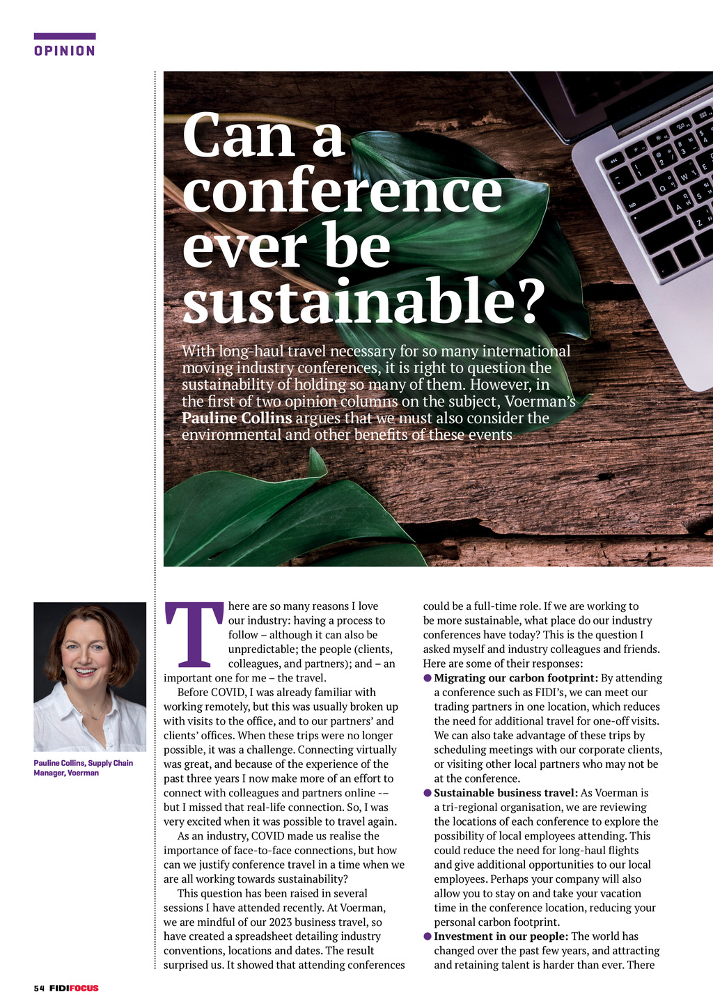 O P INIO N Can a conference ever be sustainable? With long-haul travel necessary for so many international moving industry conferences, it is right to question the sustainability of holding so many of them. However, in the first of two opinion columns on the subject, Voermans Pauline Collins argues that we must also consider the environmental and other benefits of these events T Pauline Collins, Supply Chain Manager, Voerman 54 here are so many reasons I love our industry: having a process to follow although it can also be unpredictable; the people (clients, colleagues, and partners); and an important one for me the travel. Before COVID, I was already familiar with working remotely, but this was usually broken up with visits to the office, and to our partners and clients offices. When these trips were no longer possible, it was a challenge. Connecting virtually was great, and because of the experience of the past three years I now make more of an effort to connect with colleagues and partners online - but I missed that real-life connection. So, I was very excited when it was possible to travel again. As an industry, COVID made us realise the importance of face-to-face connections, but how can we justify conference travel in a time when we are all working towards sustainability? This question has been raised in several sessions I have attended recently. At Voerman, we are mindful of our 2023 business travel, so have created a spreadsheet detailing industry conventions, locations and dates. The result surprised us. It showed that attending conferences could be a full-time role. If we are working to be more sustainable, what place do our industry conferences have today? This is the question I asked myself and industry colleagues and friends. Here are some of their responses: l Migrating our carbon footprint: By attending a conference such as FIDIs, we can meet our trading partners in one location, which reduces the need for additional travel for one-off visits. We can also take advantage of these trips by scheduling meetings with our corporate clients, or visiting other local partners who may not be at the conference. l Sustainable business travel: As Voerman is a tri-regional organisation, we are reviewing the locations of each conference to explore the possibility of local employees attending. This could reduce the need for long-haul flights and give additional opportunities to our local employees. Perhaps your company will also allow you to stay on and take your vacation time in the conference location, reducing your personal carbon footprint. l Investment in our people: The world has changed over the past few years, and attracting and retaining talent is harder than ever. There