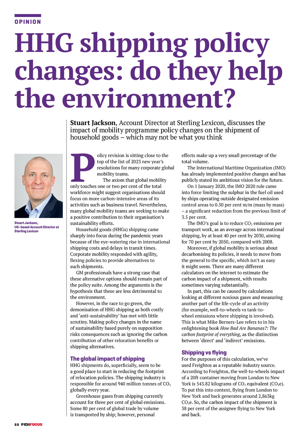 O P INIO N HHG shipping policy changes: do they help the environment? Stuart Jackson, Account Director at Sterling Lexicon, discusses the impact of mobility programme policy changes on the shipment of household goods which may not be what you think P Stuart Jackson, UK- based Account Director at Sterling Lexicon olicy revision is sitting close to the top of the list of 2023 new years resolutions for many corporate global mobility teams. The axiom that global mobility only touches one or two per cent of the total workforce might suggest organisations should focus on more carbon-intensive areas of its activities such as business travel. Nevertheless, many global mobility teams are seeking to make a positive contribution to their organisations sustainability efforts. Household goods (HHGs) shipping came sharply into focus during the pandemic years because of the eye-watering rise in international shipping costs and delays in transit times. Corporate mobility responded with agility, flexing policies to provide alternatives to such shipments. GM professionals have a strong case that these alternative options should remain part of the policy suite. Among the arguments is the hypothesis that these are less detrimental to the environment. However, in the race to go green, the demonisation of HHG shipping as both costly and anti-sustainability has met with little scrutiny. Making policy changes in the name of sustainability based purely on supposition risks consequences such as ignoring the carbon contribution of other relocation benefits or shipping alternatives. effects make up a very small percentage of the total volume. The International Maritime Organization (IMO) has already implemented positive changes and has publicly stated its ambitious vision for the future. On 1 January 2020, the IMO 2020 rule came into force limiting the sulphur in the fuel oil used by ships operating outside designated emission control areas to 0.50 per cent m/m (mass by mass) a significant reduction from the previous limit of 3.5 per cent. The IMOs goal is to reduce CO2 emissions per transport work, as an average across international shipping, by at least 40 per cent by 2030, aiming for 70 per cent by 2050, compared with 2008. Moreover, if global mobility is serious about decarbonising its policies, it needs to move from the general to the specific, which isnt as easy it might seem. There are many different calculators on the internet to estimate the carbon impact of a shipment, with results sometimes varying substantially. In part, this can be caused by calculations looking at different noxious gases and measuring another part of the life-cycle of an activity (for example, well-to-wheels vs tank-towheel emissions where shipping is involved). This is what Mike Berners-Lee refers to in his enlightening book How Bad Are Bananas?: The carbon footprint of everything, as the distinction between direct and indirect emissions. The global impact of shipping For the purposes of this calculation, weve used Freightos as a reputable industry source. According to Freightos, the well-to-wheels impact of a 20ft container moving from London to New York is 543.82 kilograms of CO2 equivalent (CO2e). To put this into context, flying from London to New York and back generates around 2,863kg CO2e. So, the carbon impact of the shipment is 38 per cent of the assignee flying to New York and back. HHG shipments do, superficially, seem to be a good place to start in reducing the footprint of relocation policies. The shipping industry is responsible for around 940 million tonnes of CO2 globally every year. Greenhouse gases from shipping currently account for three per cent of global emissions. Some 80 per cent of global trade by volume is transported by ship; however, personal 66 Shipping vs flying