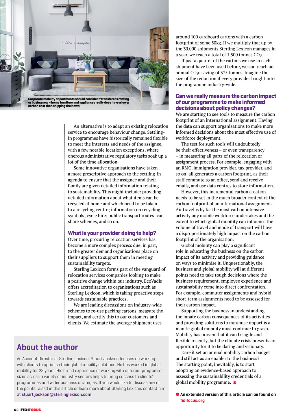 O P INIO N around 100 cardboard cartons with a carbon footprint of some 50kg. If we multiply that up by the 30,000 shipments Sterling Lexicon manages in a year, we reach a total of 1,500 tonnes CO2e. If just a quarter of the cartons we use in each shipment have been used before, we can reach an annual CO2e saving of 375 tonnes. Imagine the size of the reduction if every provider bought into the programme industry-wide. Corporate mobility departments should consider if transferees renting or buying new home furniture and appliances really does have a lower carbon cost than shipping their own An alternative is to adapt an existing relocation service to encourage behaviour change. Settlingin programmes have historically remained flexible to meet the interests and needs of the assignee, with a few notable location exceptions, where onerous administrative regulatory tasks soak up a lot of the time allocation. Some innovative organisations have taken a more prescriptive approach to the settling-in agenda to ensure that the assignee and their family are given detailed information relating to sustainability. This might include: providing detailed information about what items can be recycled at home and which need to be taken to a recycling centre; information on recycling symbols; cycle hire; public transport routes; car share schemes, and so on. What is your provider doing to help? Over time, procuring relocation services has become a more complex process due, in part, to the greater demand organisations place on their suppliers to support them in meeting sustainability targets. Sterling Lexicon forms part of the vanguard of relocation services companies looking to make a positive change within our industry. EcoVadis offers accreditation to organisations such as Sterling Lexicon, which is taking proactive steps towards sustainable practices. We are leading discussions on industry-wide schemes to re-use packing cartons, measure the impact, and certify this to our customers and clients. We estimate the average shipment uses About the author As Account Director at Sterling Lexicon, Stuart Jackson focuses on working with clients to optimise their global mobility solutions. He has worked in global mobility for 23 years. His broad experience of working with different programme sizes across a variety of industry sectors helps to bring success to clients programmes and wider business strategies. If you would like to discuss any of the points raised in this article or learn more about Sterling Lexicon, contact him at stuart.jackson@sterlinglexicon.com 68 Can we really measure the carbon impact of our programme to make informed decisions about policy changes? We are starting to see tools to measure the carbon footprint of an international assignment. Having the data can support organisations to make more informed decisions about the most effective use of workforce deployment. The test for such tools will undoubtedly be their effectiveness or even transparency in measuring all parts of the relocation or assignment process. For example, engaging with an RMC, immigration provider, tax provider, and so on, all generates a carbon footprint, as their staff commute to an office, send and receive emails, and use data centres to store information. However, this incremental carbon creation needs to be set in the much broader context of the carbon footprint of an international assignment. Air travel is by far the most carbon intensive activity any mobile workforce undertakes and the extent to which global mobility can influence the volume of travel and mode of transport will have a disproportionately high impact on the carbon footprint of the organisation. Global mobility can play a significant role in educating the business on the carbon impact of its activity and providing guidance on ways to minimise it. Unquestionably, the business and global mobility will at different points need to take tough decisions where the business requirement, employee experience and sustainability come into direct confrontation. For example, commuter assignments and hybrid short-term assignments need to be assessed for their carbon impact. Supporting the business in understanding the innate carbon consequences of its activities and providing solutions to minimise impact is a mantle global mobility must continue to grasp. Mobility has proven that it can be agile and flexible recently, but the climate crisis presents an opportunity for it to be daring and visionary. Dare it set an annual mobility carbon budget and still act as an enabler to the business? The starting point, inevitably, is to start adopting an evidence-based approach to assessing the sustainability credentials of a global mobility programme. l An extended version of this article can be found on fidifocus.org
