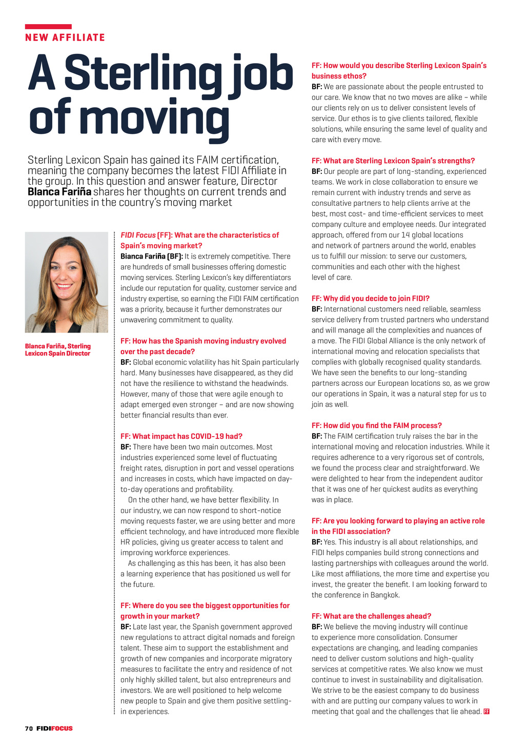 N EW A FFI L I AT E A Sterling job of moving Sterling Lexicon Spain has gained its FAIM certification, meaning the company becomes the latest FIDI Affiliate in the group. In this question and answer feature, Director Blanca Faria shares her thoughts on current trends and opportunities in the countrys moving market FIDI Focus (FF): What are the characteristics of Spains moving market? Bianca Faria (BF): It is extremely competitive. There are hundreds of small businesses offering domestic moving services. Sterling Lexicons key differentiators include our reputation for quality, customer service and industry expertise, so earning the FIDI FAIM certification was a priority, because it further demonstrates our unwavering commitment to quality. Blanca Faria, Sterling Lexicon Spain Director FF: How has the Spanish moving industry evolved over the past decade? BF: Global economic volatility has hit Spain particularly hard. Many businesses have disappeared, as they did not have the resilience to withstand the headwinds. However, many of those that were agile enough to adapt emerged even stronger and are now showing better financial results than ever. FF: What impact has COVID-19 had? BF: There have been two main outcomes. Most industries experienced some level of fluctuating freight rates, disruption in port and vessel operations and increases in costs, which have impacted on dayto-day operations and profitability. On the other hand, we have better flexibility. In our industry, we can now respond to short-notice moving requests faster, we are using better and more efficient technology, and have introduced more flexible HR policies, giving us greater access to talent and improving workforce experiences. As challenging as this has been, it has also been a learning experience that has positioned us well for the future. FF: Where do you see the biggest opportunities for growth in your market? BF: Late last year, the Spanish government approved new regulations to attract digital nomads and foreign talent. These aim to support the establishment and growth of new companies and incorporate migratory measures to facilitate the entry and residence of not only highly skilled talent, but also entrepreneurs and investors. We are well positioned to help welcome new people to Spain and give them positive settlingin experiences. 70 FF: How would you describe Sterling Lexicon Spains business ethos? BF: We are passionate about the people entrusted to our care. We know that no two moves are alike while our clients rely on us to deliver consistent levels of service. Our ethos is to give clients tailored, flexible solutions, while ensuring the same level of quality and care with every move. FF: What are Sterling Lexicon Spains strengths? BF: Our people are part of long-standing, experienced teams. We work in close collaboration to ensure we remain current with industry trends and serve as consultative partners to help clients arrive at the best, most cost- and time-efficient services to meet company culture and employee needs. Our integrated approach, offered from our 14 global locations and network of partners around the world, enables us to fulfill our mission: to serve our customers, communities and each other with the highest level of care. FF: Why did you decide to join FIDI? BF: International customers need reliable, seamless service delivery from trusted partners who understand and will manage all the complexities and nuances of a move. The FIDI Global Alliance is the only network of international moving and relocation specialists that complies with globally recognised quality standards. We have seen the benefits to our long-standing partners across our European locations so, as we grow our operations in Spain, it was a natural step for us to join as well. FF: How did you find the FAIM process? BF: The FAIM certification truly raises the bar in the international moving and relocation industries. While it requires adherence to a very rigorous set of controls, we found the process clear and straightforward. We were delighted to hear from the independent auditor that it was one of her quickest audits as everything was in place. FF: Are you looking forward to playing an active role in the FIDI association? BF: Yes. This industry is all about relationships, and FIDI helps companies build strong connections and lasting partnerships with colleagues around the world. Like most affiliations, the more time and expertise you invest, the greater the benefit. I am looking forward to the conference in Bangkok. FF: What are the challenges ahead? BF: We believe the moving industry will continue to experience more consolidation. Consumer expectations are changing, and leading companies need to deliver custom solutions and high-quality services at competitive rates. We also know we must continue to invest in sustainability and digitalisation. We strive to be the easiest company to do business with and are putting our company values to work in meeting that goal and the challenges that lie ahead.