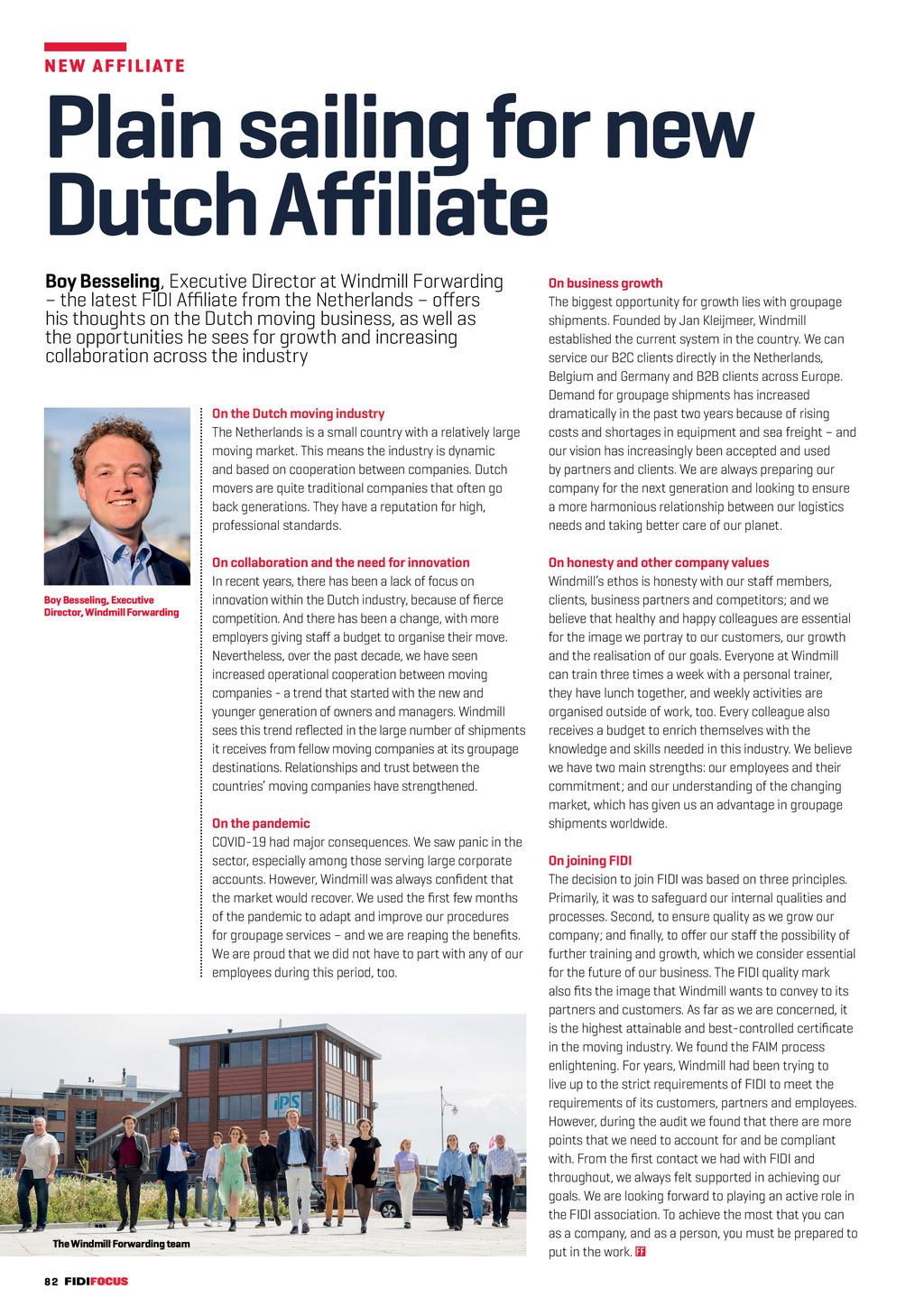 N EW A FFI L I AT E Plain sailing for new Dutch Affiliate Boy Besseling, Executive Director at Windmill Forwarding the latest FIDI Affiliate from the Netherlands offers his thoughts on the Dutch moving business, as well as the opportunities he sees for growth and increasing collaboration across the industry On the Dutch moving industry The Netherlands is a small country with a relatively large moving market. This means the industry is dynamic and based on cooperation between companies. Dutch movers are quite traditional companies that often go back generations. They have a reputation for high, professional standards. Boy Besseling, Executive Director, Windmill Forwarding On collaboration and the need for innovation In recent years, there has been a lack of focus on innovation within the Dutch industry, because of fierce competition. And there has been a change, with more employers giving staff a budget to organise their move. Nevertheless, over the past decade, we have seen increased operational cooperation between moving companies - a trend that started with the new and younger generation of owners and managers. Windmill sees this trend reflected in the large number of shipments it receives from fellow moving companies at its groupage destinations. Relationships and trust between the countries moving companies have strengthened. On the pandemic COVID-19 had major consequences. We saw panic in the sector, especially among those serving large corporate accounts. However, Windmill was always confident that the market would recover. We used the first few months of the pandemic to adapt and improve our procedures for groupage services and we are reaping the benefits. We are proud that we did not have to part with any of our employees during this period, too. The Windmill Forwarding team 82 On business growth The biggest opportunity for growth lies with groupage shipments. Founded by Jan Kleijmeer, Windmill established the current system in the country. We can service our B2C clients directly in the Netherlands, Belgium and Germany and B2B clients across Europe. Demand for groupage shipments has increased dramatically in the past two years because of rising costs and shortages in equipment and sea freight and our vision has increasingly been accepted and used by partners and clients. We are always preparing our company for the next generation and looking to ensure a more harmonious relationship between our logistics needs and taking better care of our planet. On honesty and other company values Windmills ethos is honesty with our staff members, clients, business partners and competitors; and we believe that healthy and happy colleagues are essential for the image we portray to our customers, our growth and the realisation of our goals. Everyone at Windmill can train three times a week with a personal trainer, they have lunch together, and weekly activities are organised outside of work, too. Every colleague also receives a budget to enrich themselves with the knowledge and skills needed in this industry. We believe we have two main strengths: our employees and their commitment; and our understanding of the changing market, which has given us an advantage in groupage shipments worldwide. On joining FIDI The decision to join FIDI was based on three principles. Primarily, it was to safeguard our internal qualities and processes. Second, to ensure quality as we grow our company; and finally, to offer our staff the possibility of further training and growth, which we consider essential for the future of our business. The FIDI quality mark also fits the image that Windmill wants to convey to its partners and customers. As far as we are concerned, it is the highest attainable and best-controlled certificate in the moving industry. We found the FAIM process enlightening. For years, Windmill had been trying to live up to the strict requirements of FIDI to meet the requirements of its customers, partners and employees. However, during the audit we found that there are more points that we need to account for and be compliant with. From the first contact we had with FIDI and throughout, we always felt supported in achieving our goals. We are looking forward to playing an active role in the FIDI association. To achieve the most that you can as a company, and as a person, you must be prepared to put in the work.