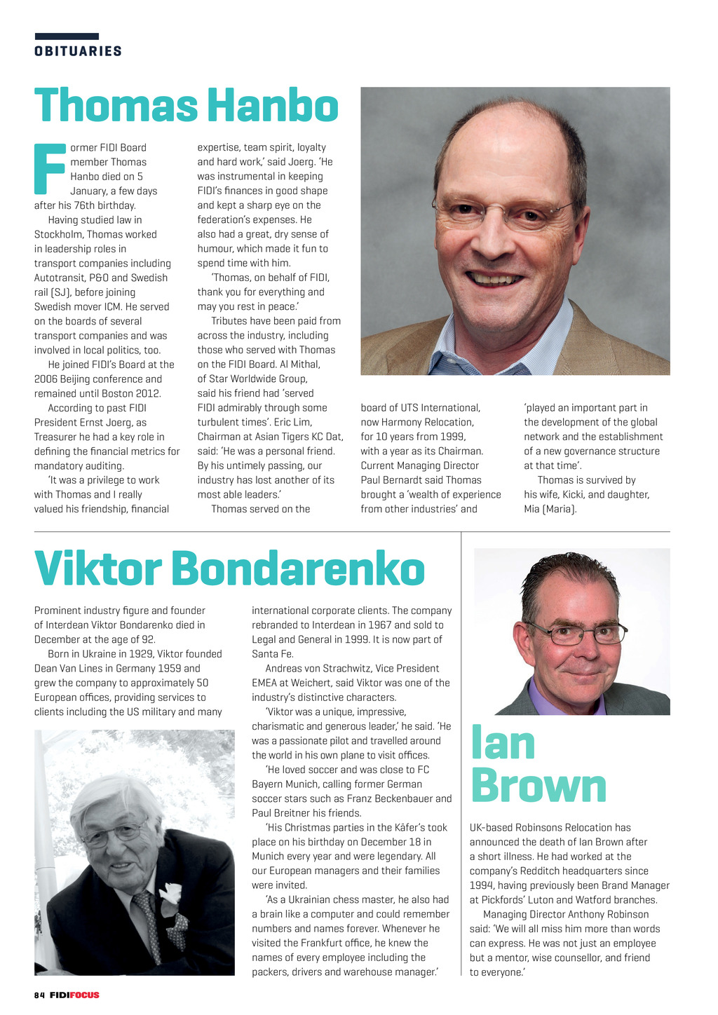 O BIT UA RI E S Thomas Hanbo F ormer FIDI Board member Thomas Hanbo died on 5 January, a few days after his 76th birthday. Having studied law in Stockholm, Thomas worked in leadership roles in transport companies including Autotransit, P&O and Swedish rail (SJ), before joining Swedish mover ICM. He served on the boards of several transport companies and was involved in local politics, too. He joined FIDIs Board at the 2006 Beijing conference and remained until Boston 2012. According to past FIDI President Ernst Joerg, as Treasurer he had a key role in defining the financial metrics for mandatory auditing. It was a privilege to work with Thomas and I really valued his friendship, financial expertise, team spirit, loyalty and hard work, said Joerg. He was instrumental in keeping FIDIs finances in good shape and kept a sharp eye on the federations expenses. He also had a great, dry sense of humour, which made it fun to spend time with him. Thomas, on behalf of FIDI, thank you for everything and may you rest in peace. Tributes have been paid from across the industry, including those who served with Thomas on the FIDI Board. Al Mithal, of Star Worldwide Group, said his friend had served FIDI admirably through some turbulent times. Eric Lim, Chairman at Asian Tigers KC Dat, said: He was a personal friend. By his untimely passing, our industry has lost another of its most able leaders. Thomas served on the board of UTS International, now Harmony Relocation, for 10 years from 1999, with a year as its Chairman. Current Managing Director Paul Bernardt said Thomas brought a wealth of experience from other industries and played an important part in the development of the global network and the establishment of a new governance structure at that time. Thomas is survived by his wife, Kicki, and daughter, Mia (Maria). Viktor Bondarenko Prominent industry figure and founder of Interdean Viktor Bondarenko died in December at the age of 92. Born in Ukraine in 1929, Viktor founded Dean Van Lines in Germany 1959 and grew the company to approximately 50 European offices, providing services to clients including the US military and many 84 international corporate clients. The company rebranded to Interdean in 1967 and sold to Legal and General in 1999. It is now part of Santa Fe. Andreas von Strachwitz, Vice President EMEA at Weichert, said Viktor was one of the industrys distinctive characters. Viktor was a unique, impressive, charismatic and generous leader, he said. He was a passionate pilot and travelled around the world in his own plane to visit offices. He loved soccer and was close to FC Bayern Munich, calling former German soccer stars such as Franz Beckenbauer and Paul Breitner his friends. His Christmas parties in the Kfers took place on his birthday on December 18 in Munich every year and were legendary. All our European managers and their families were invited. As a Ukrainian chess master, he also had a brain like a computer and could remember numbers and names forever. Whenever he visited the Frankfurt office, he knew the names of every employee including the packers, drivers and warehouse manager. Ian Brown UK-based Robinsons Relocation has announced the death of Ian Brown after a short illness. He had worked at the companys Redditch headquarters since 1994, having previously been Brand Manager at Pickfords Luton and Watford branches. Managing Director Anthony Robinson said: We will all miss him more than words can express. He was not just an employee but a mentor, wise counsellor, and friend to everyone.