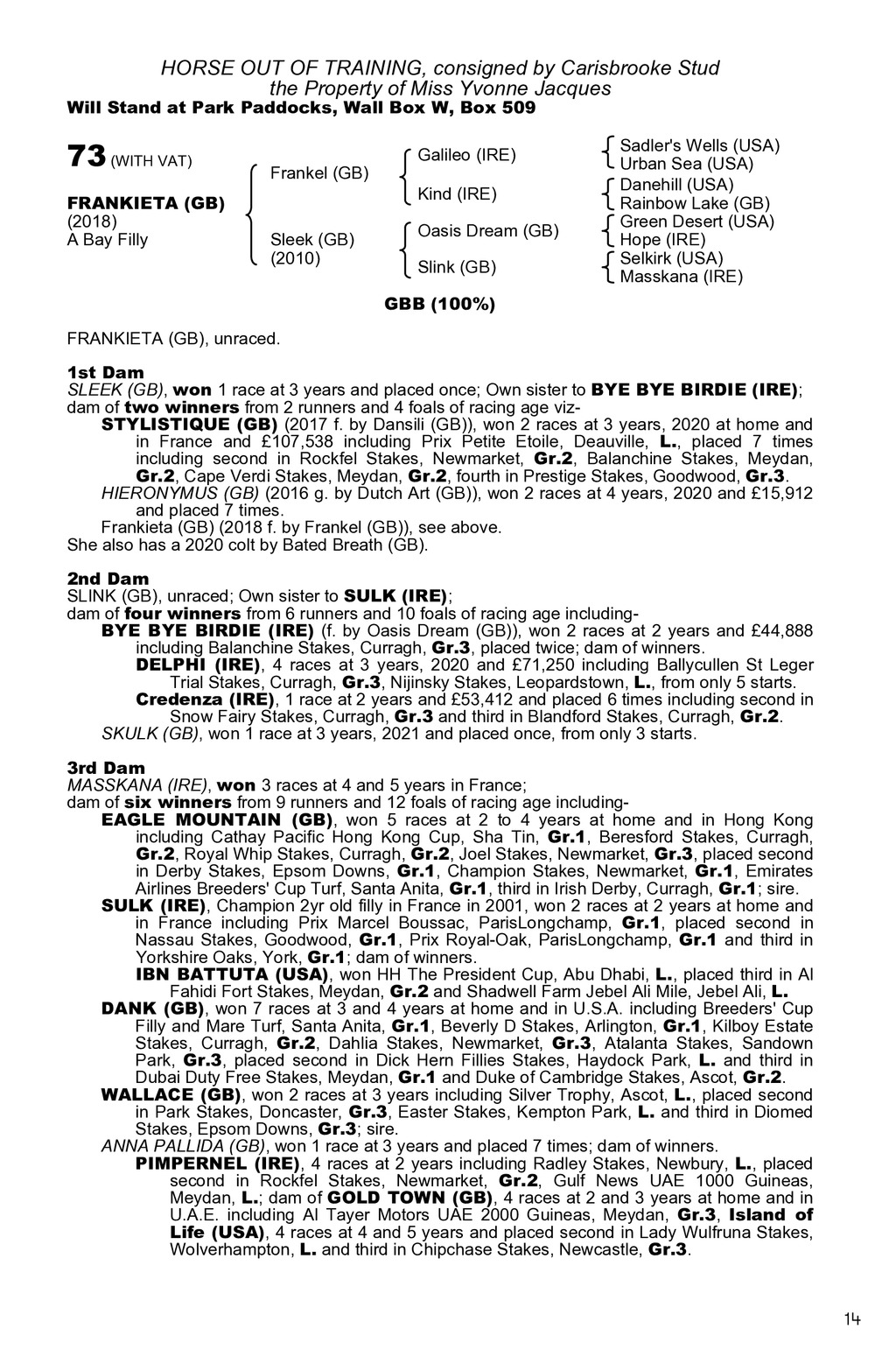 HORSE OUT OF TRAINING, consigned by Carisbrooke Stud the Property of Miss Yvonne Jacques Will Stand at Park Paddocks, Wall Box W, Box 509 73 (WITH VAT) FRANKIETA (GB) (2018) A Bay Filly Frankel (GB) Galileo (IRE) Kind (IRE) Sleek (GB) (2010) Oasis Dream (GB) Slink (GB) Sadler s Wells (USA) Urban Sea (USA) Danehill (USA) Rainbow Lake (GB) Green Desert (USA) Hope (IRE) Selkirk (USA) Masskana (IRE) GBB (100%) FRANKIETA (GB), unraced. 1st Dam SLEEK (GB), won 1 race at 3 years and placed once; Own sister to BYE BYE BIRDIE (IRE); dam of two winners from 2 runners and 4 foals of racing age vizSTYLISTIQUE (GB) (2017 f. by Dansili (GB)), won 2 races at 3 years, 2020 at home and in France and 107,538 including Prix Petite Etoile, Deauville, L., placed 7 times including second in Rockfel Stakes, Newmarket, Gr.2, Balanchine Stakes, Meydan, Gr.2, Cape Verdi Stakes, Meydan, Gr.2, fourth in Prestige Stakes, Goodwood, Gr.3. HIERONYMUS (GB) (2016 g. by Dutch Art (GB)), won 2 races at 4 years, 2020 and 15,912 and placed 7 times. Frankieta (GB) (2018 f. by Frankel (GB)), see above. She also has a 2020 colt by Bated Breath (GB). 2nd Dam SLINK (GB), unraced; Own sister to SULK (IRE); dam of four winners from 6 runners and 10 foals of racing age includingBYE BYE BIRDIE (IRE) (f. by Oasis Dream (GB)), won 2 races at 2 years and 44,888 including Balanchine Stakes, Curragh, Gr.3, placed twice; dam of winners. DELPHI (IRE), 4 races at 3 years, 2020 and 71,250 including Ballycullen St Leger Trial Stakes, Curragh, Gr.3, Nijinsky Stakes, Leopardstown, L., from only 5 starts. Credenza (IRE), 1 race at 2 years and 53,412 and placed 6 times including second in Snow Fairy Stakes, Curragh, Gr.3 and third in Blandford Stakes, Curragh, Gr.2. SKULK (GB), won 1 race at 3 years, 2021 and placed once, from only 3 starts. 3rd Dam MASSKANA (IRE), won 3 races at 4 and 5 years in France; dam of six winners from 9 runners and 12 foals of racing age includingEAGLE MOUNTAIN (GB), won 5 races at 2 to 4 years at home and in Hong Kong including Cathay Pacific Hong Kong Cup, Sha Tin, Gr.1, Beresford Stakes, Curragh, Gr.2, Royal Whip Stakes, Curragh, Gr.2, Joel Stakes, Newmarket, Gr.3, placed second in Derby Stakes, Epsom Downs, Gr.1, Champion Stakes, Newmarket, Gr.1, Emirates Airlines Breeders Cup Turf, Santa Anita, Gr.1, third in Irish Derby, Curragh, Gr.1; sire. SULK (IRE), Champion 2yr old filly in France in 2001, won 2 races at 2 years at home and in France including Prix Marcel Boussac, ParisLongchamp, Gr.1, placed second in Nassau Stakes, Goodwood, Gr.1, Prix Royal-Oak, ParisLongchamp, Gr.1 and third in Yorkshire Oaks, York, Gr.1; dam of winners. IBN BATTUTA (USA), won HH The President Cup, Abu Dhabi, L., placed third in Al Fahidi Fort Stakes, Meydan, Gr.2 and Shadwell Farm Jebel Ali Mile, Jebel Ali, L. DANK (GB), won 7 races at 3 and 4 years at home and in U.S.A. including Breeders Cup Filly and Mare Turf, Santa Anita, Gr.1, Beverly D Stakes, Arlington, Gr.1, Kilboy Estate Stakes, Curragh, Gr.2, Dahlia Stakes, Newmarket, Gr.3, Atalanta Stakes, Sandown Park, Gr.3, placed second in Dick Hern Fillies Stakes, Haydock Park, L. and third in Dubai Duty Free Stakes, Meydan, Gr.1 and Duke of Cambridge Stakes, Ascot, Gr.2. WALLACE (GB), won 2 races at 3 years including Silver Trophy, Ascot, L., placed second in Park Stakes, Doncaster, Gr.3, Easter Stakes, Kempton Park, L. and third in Diomed Stakes, Epsom Downs, Gr.3; sire. ANNA PALLIDA (GB), won 1 race at 3 years and placed 7 times; dam of winners. PIMPERNEL (IRE), 4 races at 2 years including Radley Stakes, Newbury, L., placed second in Rockfel Stakes, Newmarket, Gr.2, Gulf News UAE 1000 Guineas, Meydan, L.; dam of GOLD TOWN (GB), 4 races at 2 and 3 years at home and in U.A.E. including Al Tayer Motors UAE 2000 Guineas, Meydan, Gr.3, Island of Life (USA), 4 races at 4 and 5 years and placed second in Lady Wulfruna Stakes, Wolverhampton, L. and third in Chipchase Stakes, Newcastle, Gr.3. 14