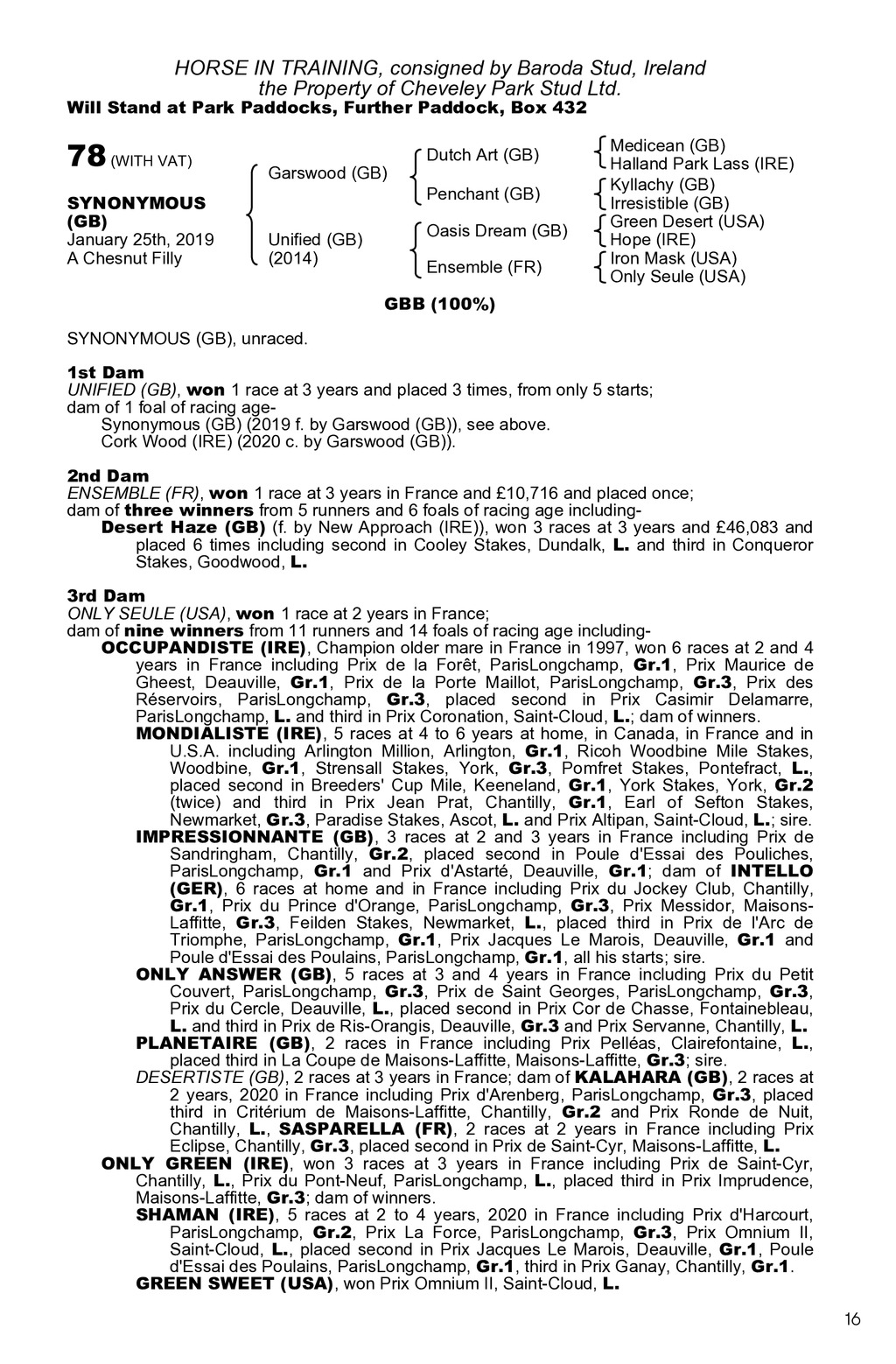 HORSE IN TRAINING, consigned by Baroda Stud, Ireland the Property of Cheveley Park Stud Ltd. Will Stand at Park Paddocks, Further Paddock, Box 432 78 (WITH VAT) SYNONYMOUS (GB) January 25th, 2019 A Chesnut Filly Garswood (GB) Dutch Art (GB) Penchant (GB) Unified (GB) (2014) Oasis Dream (GB) Ensemble (FR) Medicean (GB) Halland Park Lass (IRE) Kyllachy (GB) Irresistible (GB) Green Desert (USA) Hope (IRE) Iron Mask (USA) Only Seule (USA) GBB (100%) SYNONYMOUS (GB), unraced. 1st Dam UNIFIED (GB), won 1 race at 3 years and placed 3 times, from only 5 starts; dam of 1 foal of racing ageSynonymous (GB) (2019 f. by Garswood (GB)), see above. Cork Wood (IRE) (2020 c. by Garswood (GB)). 2nd Dam ENSEMBLE (FR), won 1 race at 3 years in France and 10,716 and placed once; dam of three winners from 5 runners and 6 foals of racing age includingDesert Haze (GB) (f. by New Approach (IRE)), won 3 races at 3 years and 46,083 and placed 6 times including second in Cooley Stakes, Dundalk, L. and third in Conqueror Stakes, Goodwood, L. 3rd Dam ONLY SEULE (USA), won 1 race at 2 years in France; dam of nine winners from 11 runners and 14 foals of racing age includingOCCUPANDISTE (IRE), Champion older mare in France in 1997, won 6 races at 2 and 4 years in France including Prix de la Fort, ParisLongchamp, Gr.1, Prix Maurice de Gheest, Deauville, Gr.1, Prix de la Porte Maillot, ParisLongchamp, Gr.3, Prix des Rservoirs, ParisLongchamp, Gr.3, placed second in Prix Casimir Delamarre, ParisLongchamp, L. and third in Prix Coronation, Saint-Cloud, L.; dam of winners. MONDIALISTE (IRE), 5 races at 4 to 6 years at home, in Canada, in France and in U.S.A. including Arlington Million, Arlington, Gr.1, Ricoh Woodbine Mile Stakes, Woodbine, Gr.1, Strensall Stakes, York, Gr.3, Pomfret Stakes, Pontefract, L., placed second in Breeders Cup Mile, Keeneland, Gr.1, York Stakes, York, Gr.2 (twice) and third in Prix Jean Prat, Chantilly, Gr.1, Earl of Sefton Stakes, Newmarket, Gr.3, Paradise Stakes, Ascot, L. and Prix Altipan, Saint-Cloud, L.; sire. IMPRESSIONNANTE (GB), 3 races at 2 and 3 years in France including Prix de Sandringham, Chantilly, Gr.2, placed second in Poule d Essai des Pouliches, ParisLongchamp, Gr.1 and Prix d Astart, Deauville, Gr.1; dam of INTELLO (GER), 6 races at home and in France including Prix du Jockey Club, Chantilly, Gr.1, Prix du Prince d Orange, ParisLongchamp, Gr.3, Prix Messidor, MaisonsLaffitte, Gr.3, Feilden Stakes, Newmarket, L., placed third in Prix de l Arc de Triomphe, ParisLongchamp, Gr.1, Prix Jacques Le Marois, Deauville, Gr.1 and Poule d Essai des Poulains, ParisLongchamp, Gr.1, all his starts; sire. ONLY ANSWER (GB), 5 races at 3 and 4 years in France including Prix du Petit Couvert, ParisLongchamp, Gr.3, Prix de Saint Georges, ParisLongchamp, Gr.3, Prix du Cercle, Deauville, L., placed second in Prix Cor de Chasse, Fontainebleau, L. and third in Prix de Ris-Orangis, Deauville, Gr.3 and Prix Servanne, Chantilly, L. PLANETAIRE (GB), 2 races in France including Prix Pellas, Clairefontaine, L., placed third in La Coupe de Maisons-Laffitte, Maisons-Laffitte, Gr.3; sire. DESERTISTE (GB), 2 races at 3 years in France; dam of KALAHARA (GB), 2 races at 2 years, 2020 in France including Prix d Arenberg, ParisLongchamp, Gr.3, placed third in Critrium de Maisons-Laffitte, Chantilly, Gr.2 and Prix Ronde de Nuit, Chantilly, L., SASPARELLA (FR), 2 races at 2 years in France including Prix Eclipse, Chantilly, Gr.3, placed second in Prix de Saint-Cyr, Maisons-Laffitte, L. ONLY GREEN (IRE), won 3 races at 3 years in France including Prix de Saint-Cyr, Chantilly, L., Prix du Pont-Neuf, ParisLongchamp, L., placed third in Prix Imprudence, Maisons-Laffitte, Gr.3; dam of winners. SHAMAN (IRE), 5 races at 2 to 4 years, 2020 in France including Prix d Harcourt, ParisLongchamp, Gr.2, Prix La Force, ParisLongchamp, Gr.3, Prix Omnium II, Saint-Cloud, L., placed second in Prix Jacques Le Marois, Deauville, Gr.1, Poule d Essai des Poulains, ParisLongchamp, Gr.1, third in Prix Ganay, Chantilly, Gr.1. GREEN SWEET (USA), won Prix Omnium II, Saint-Cloud, L. 16