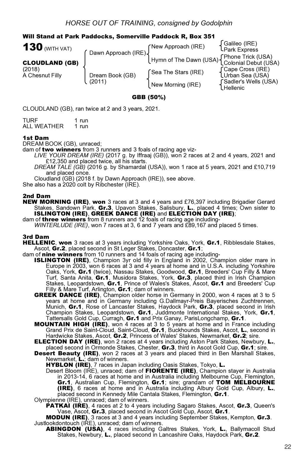 HORSE OUT OF TRAINING, consigned by Godolphin Will Stand at Park Paddocks, Somerville Paddock R, Box 351 130 (WITH VAT) Dawn Approach (IRE) CLOUDLAND (GB) (2018) A Chesnut Filly Dream Book (GB) (2011) Galileo (IRE) Park Express Phone Trick (USA) Hymn of The Dawn (USA) Colonial Debut (USA) Cape Cross (IRE) Sea The Stars (IRE) Urban Sea (USA) Sadler s Wells (USA) New Morning (IRE) Hellenic New Approach (IRE) GBB (50%) CLOUDLAND (GB), ran twice at 2 and 3 years, 2021. TURF ALL WEATHER 1 run 1 run 1st Dam DREAM BOOK (GB), unraced; dam of two winners from 3 runners and 3 foals of racing age vizLIVE YOUR DREAM (IRE) (2017 g. by Iffraaj (GB)), won 2 races at 2 and 4 years, 2021 and 12,350 and placed twice, all his starts. DREAM TALE (GB) (2016 g. by Shamardal (USA)), won 1 race at 5 years, 2021 and 10,719 and placed once. Cloudland (GB) (2018 f. by Dawn Approach (IRE)), see above. She also has a 2020 colt by Ribchester (IRE). 2nd Dam NEW MORNING (IRE), won 3 races at 3 and 4 years and 76,397 including Brigadier Gerard Stakes, Sandown Park, Gr.3, Upavon Stakes, Salisbury, L., placed 4 times; Own sister to ISLINGTON (IRE), GREEK DANCE (IRE) and ELECTION DAY (IRE); dam of three winners from 8 runners and 12 foals of racing age includingWINTERLUDE (IRE), won 7 races at 3, 6 and 7 years and 89,167 and placed 5 times. 3rd Dam HELLENIC, won 3 races at 3 years including Yorkshire Oaks, York, Gr.1, Ribblesdale Stakes, Ascot, Gr.2, placed second in St Leger Stakes, Doncaster, Gr.1; dam of nine winners from 10 runners and 14 foals of racing age includingISLINGTON (IRE), Champion 3yr old filly in England in 2002, Champion older mare in Europe in 2003, won 6 races at 3 and 4 years at home and in U.S.A. including Yorkshire Oaks, York, Gr.1 (twice), Nassau Stakes, Goodwood, Gr.1, Breeders Cup Filly & Mare Turf, Santa Anita, Gr.1, Musidora Stakes, York, Gr.3, placed third in Irish Champion Stakes, Leopardstown, Gr.1, Prince of Wales s Stakes, Ascot, Gr.1 and Breeders Cup Filly & Mare Turf, Arlington, Gr.1; dam of winners. GREEK DANCE (IRE), Champion older horse in Germany in 2000, won 4 races at 3 to 5 years at home and in Germany including G.Dallmayr-Preis Bayerisches Zuchtrennen, Munich, Gr.1, Rose of Lancaster Stakes, Haydock Park, Gr.3, placed second in Irish Champion Stakes, Leopardstown, Gr.1, Juddmonte International Stakes, York, Gr.1, Tattersalls Gold Cup, Curragh, Gr.1 and Prix Ganay, ParisLongchamp, Gr.1. MOUNTAIN HIGH (IRE), won 4 races at 3 to 5 years at home and in France including Grand Prix de Saint-Cloud, Saint-Cloud, Gr.1, Buckhounds Stakes, Ascot, L., second in Hardwicke Stakes, Ascot, Gr.2, Princess of Wales Stakes, Newmarket, Gr.2; sire. ELECTION DAY (IRE), won 2 races at 4 years including Aston Park Stakes, Newbury, L., placed second in Ormonde Stakes, Chester, Gr.3, third in Ascot Gold Cup, Gr.1; sire. Desert Beauty (IRE), won 2 races at 3 years and placed third in Ben Marshall Stakes, Newmarket, L.; dam of winners. HYBLON (IRE), 7 races in Japan including Oasis Stakes, Tokyo, L. Desert Bloom (IRE), unraced; dam of FIORENTE (IRE), Champion stayer in Australia in 2013-14, 6 races at home and in Australia including Melbourne Cup, Flemington, Gr.1, Australian Cup, Flemington, Gr.1; sire; grandam of TOM MELBOURNE (IRE), 6 races at home and in Australia including Albury Gold Cup, Albury, L., placed second in Kennedy Mile Cantala Stakes, Flemington, Gr.1. Olympienne (IRE), unraced; dam of winners. PATKAI (IRE), 4 races at 2 to 4 years including Sagaro Stakes, Ascot, Gr.3, Queen s Vase, Ascot, Gr.3, placed second in Ascot Gold Cup, Ascot, Gr.1. MODUN (IRE), 3 races at 3 and 4 years including September Stakes, Kempton, Gr.3. Justlookdontouch (IRE), unraced; dam of winners. ABINGDON (USA), 4 races including Galtres Stakes, York, L., Ballymacoll Stud Stakes, Newbury, L., placed second in Lancashire Oaks, Haydock Park, Gr.2. 22