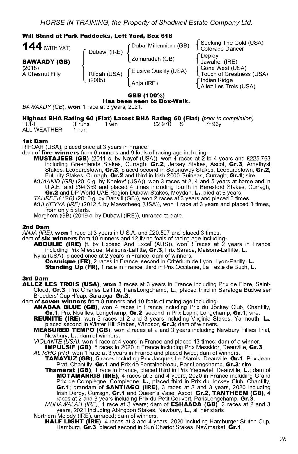 HORSE IN TRAINING, the Property of Shadwell Estate Company Ltd. Will Stand at Park Paddocks, Left Yard, Box 618 144 (WITH VAT) BAWAADY (GB) (2018) A Chesnut Filly Dubawi (IRE) Dubai Millennium (GB) Zomaradah (GB) Rifqah (USA) (2005) Elusive Quality (USA) Anja (IRE) Seeking The Gold (USA) Colorado Dancer Deploy Jawaher (IRE) Gone West (USA) Touch of Greatness (USA) Indian Ridge Allez Les Trois (USA) GBB (100%) Has been seen to Box-Walk. BAWAADY (GB), won 1 race at 3 years, 2021. Highest BHA Rating 60 (Flat) Latest BHA Rating 60 (Flat) (prior to compilation) TURF 3 runs 1 win 2,970 S 7f 96y ALL WEATHER 1 run 1st Dam RIFQAH (USA), placed once at 3 years in France; dam of five winners from 6 runners and 9 foals of racing age includingMUSTAJEEB (GB) (2011 c. by Nayef (USA)), won 4 races at 2 to 4 years and 225,763 including Greenlands Stakes, Curragh, Gr.2, Jersey Stakes, Ascot, Gr.3, Amethyst Stakes, Leopardstown, Gr.3, placed second in Solonaway Stakes, Leopardstown, Gr.2, Futurity Stakes, Curragh, Gr.2 and third in Irish 2000 Guineas, Curragh, Gr.1; sire. MUAANID (GB) (2010 g. by Kheleyf (USA)), won 3 races at 2, 4 and 5 years at home and in U.A.E. and 94,359 and placed 4 times including fourth in Beresford Stakes, Curragh, Gr.2 and DP World UAE Region Dubawi Stakes, Meydan, L., died at 6 years. TAHREEK (GB) (2015 g. by Dansili (GB)), won 2 races at 3 years and placed 3 times. MULKEYYA (IRE) (2012 f. by Mawatheeq (USA)), won 1 race at 3 years and placed 3 times, from only 5 starts. Morghom (GB) (2019 c. by Dubawi (IRE)), unraced to date. 2nd Dam ANJA (IRE), won 1 race at 3 years in U.S.A. and 20,597 and placed 3 times; dam of six winners from 10 runners and 12 living foals of racing age includingABOULIE (IRE) (f. by Exceed And Excel (AUS)), won 3 races at 2 years in France including Prix Miesque, Maisons-Laffitte, Gr.3, Prix Saraca, Maisons-Laffitte, L. Kylia (USA), placed once at 2 years in France; dam of winners. Cosmique (FR), 2 races in France, second in Critrium de Lyon, Lyon-Parilly, L. Standing Up (FR), 1 race in France, third in Prix Occitanie, La Teste de Buch, L. 3rd Dam ALLEZ LES TROIS (USA), won 3 races at 3 years in France including Prix de Flore, SaintCloud, Gr.3, Prix Charles Laffitte, ParisLongchamp, L., placed third in Saratoga Budweiser Breeders Cup H cap, Saratoga, Gr.3; dam of seven winners from 8 runners and 10 foals of racing age includingANABAA BLUE (GB), won 4 races in France including Prix du Jockey Club, Chantilly, Gr.1, Prix Noailles, Longchamp, Gr.2, second in Prix Lupin, Longchamp, Gr.1; sire. REUNITE (IRE), won 3 races at 2 and 3 years including Virginia Stakes, Yarmouth, L., placed second in Winter Hill Stakes, Windsor, Gr.3; dam of winners. MEASURED TEMPO (GB), won 2 races at 2 and 3 years including Newbury Fillies Trial, Newbury, L.; dam of winners. VIOLANTE (USA), won 1 race at 4 years in France and placed 13 times; dam of a winner. IMPULSIF (GB), 5 races to 2020 in France including Prix Messidor, Deauville, Gr.3. AL ISHQ (FR), won 1 race at 3 years in France and placed twice; dam of winners. TAMAYUZ (GB), 5 races including Prix Jacques Le Marois, Deauville, Gr.1, Prix Jean Prat, Chantilly, Gr.1 and Prix de Fontainebleau, ParisLongchamp, Gr.3; sire. Thamarat (GB), 1 race in France, placed third in Prix Yacowlef, Deauville, L.; dam of MOTAMARRIS (IRE), 4 races at 3 and 4 years, 2020 in France including Grand Prix de Compigne, Compiegne, L., placed third in Prix du Jockey Club, Chantilly, Gr.1; grandam of SANTIAGO (IRE), 3 races at 2 and 3 years, 2020 including Irish Derby, Curragh, Gr.1 and Queen s Vase, Ascot, Gr.2, TANTHEEM (GB), 4 races at 2 and 3 years including Prix du Petit Couvert, ParisLongchamp, Gr.3. MUHAWALAH (IRE), 1 race at 3 years; dam of ESHAADA (GB), 2 races at 2 and 3 years, 2021 including Abingdon Stakes, Newbury, L., all her starts. Northern Melody (IRE), unraced; dam of winners. HALF LIGHT (IRE), 4 races at 3 and 4 years, 2020 including Hamburger Stuten Cup, Hamburg, Gr.3, placed second in Sun Chariot Stakes, Newmarket, Gr.1. 26
