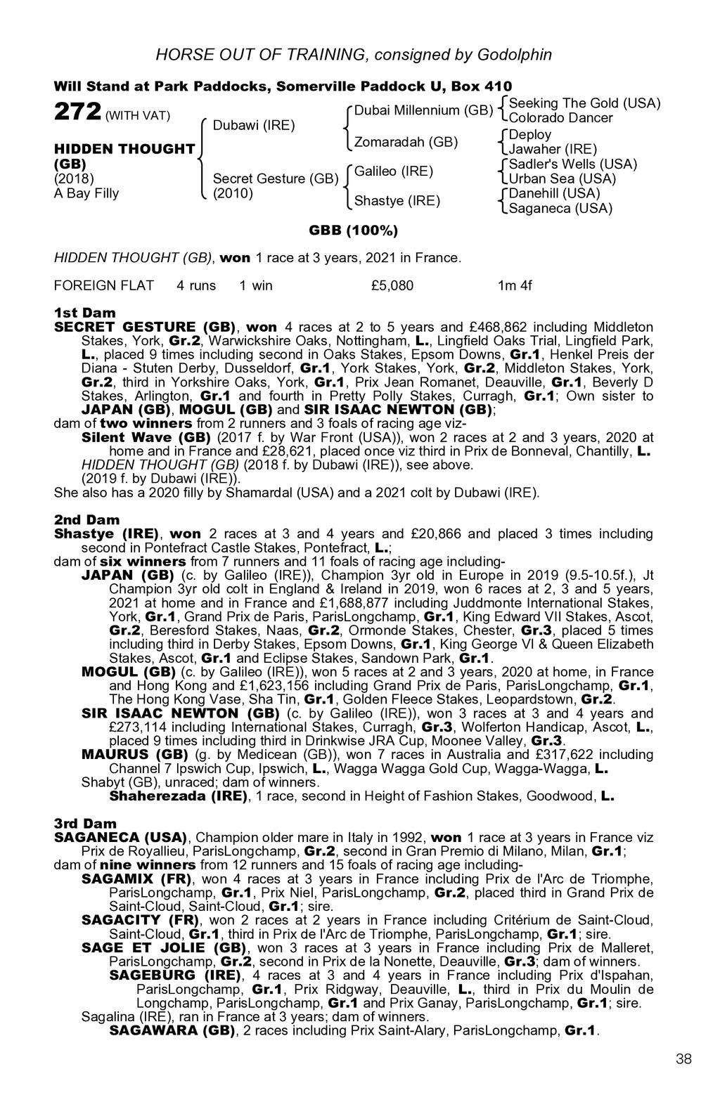 HORSE OUT OF TRAINING, consigned by Godolphin Will Stand at Park Paddocks, Somerville Paddock U, Box 410 Seeking The Gold (USA) Dubai Millennium (GB) (WITH VAT) Colorado Dancer Dubawi (IRE) Deploy Zomaradah (GB) HIDDEN THOUGHT Jawaher (IRE) Sadler s Wells (USA) (GB) Galileo (IRE) (2018) Secret Gesture (GB) Urban Sea (USA) A Bay Filly Danehill (USA) (2010) Shastye (IRE) Saganeca (USA) 272 GBB (100%) HIDDEN THOUGHT (GB), won 1 race at 3 years, 2021 in France. FOREIGN FLAT 4 runs 1 win 5,080 1m 4f 1st Dam SECRET GESTURE (GB), won 4 races at 2 to 5 years and 468,862 including Middleton Stakes, York, Gr.2, Warwickshire Oaks, Nottingham, L., Lingfield Oaks Trial, Lingfield Park, L., placed 9 times including second in Oaks Stakes, Epsom Downs, Gr.1, Henkel Preis der Diana - Stuten Derby, Dusseldorf, Gr.1, York Stakes, York, Gr.2, Middleton Stakes, York, Gr.2, third in Yorkshire Oaks, York, Gr.1, Prix Jean Romanet, Deauville, Gr.1, Beverly D Stakes, Arlington, Gr.1 and fourth in Pretty Polly Stakes, Curragh, Gr.1; Own sister to JAPAN (GB), MOGUL (GB) and SIR ISAAC NEWTON (GB); dam of two winners from 2 runners and 3 foals of racing age vizSilent Wave (GB) (2017 f. by War Front (USA)), won 2 races at 2 and 3 years, 2020 at home and in France and 28,621, placed once viz third in Prix de Bonneval, Chantilly, L. HIDDEN THOUGHT (GB) (2018 f. by Dubawi (IRE)), see above. (2019 f. by Dubawi (IRE)). She also has a 2020 filly by Shamardal (USA) and a 2021 colt by Dubawi (IRE). 2nd Dam Shastye (IRE), won 2 races at 3 and 4 years and 20,866 and placed 3 times including second in Pontefract Castle Stakes, Pontefract, L.; dam of six winners from 7 runners and 11 foals of racing age includingJAPAN (GB) (c. by Galileo (IRE)), Champion 3yr old in Europe in 2019 (9.5-10.5f.), Jt Champion 3yr old colt in England & Ireland in 2019, won 6 races at 2, 3 and 5 years, 2021 at home and in France and 1,688,877 including Juddmonte International Stakes, York, Gr.1, Grand Prix de Paris, ParisLongchamp, Gr.1, King Edward VII Stakes, Ascot, Gr.2, Beresford Stakes, Naas, Gr.2, Ormonde Stakes, Chester, Gr.3, placed 5 times including third in Derby Stakes, Epsom Downs, Gr.1, King George VI & Queen Elizabeth Stakes, Ascot, Gr.1 and Eclipse Stakes, Sandown Park, Gr.1. MOGUL (GB) (c. by Galileo (IRE)), won 5 races at 2 and 3 years, 2020 at home, in France and Hong Kong and 1,623,156 including Grand Prix de Paris, ParisLongchamp, Gr.1, The Hong Kong Vase, Sha Tin, Gr.1, Golden Fleece Stakes, Leopardstown, Gr.2. SIR ISAAC NEWTON (GB) (c. by Galileo (IRE)), won 3 races at 3 and 4 years and 273,114 including International Stakes, Curragh, Gr.3, Wolferton Handicap, Ascot, L., placed 9 times including third in Drinkwise JRA Cup, Moonee Valley, Gr.3. MAURUS (GB) (g. by Medicean (GB)), won 7 races in Australia and 317,622 including Channel 7 Ipswich Cup, Ipswich, L., Wagga Wagga Gold Cup, Wagga-Wagga, L. Shabyt (GB), unraced; dam of winners. Shaherezada (IRE), 1 race, second in Height of Fashion Stakes, Goodwood, L. 3rd Dam SAGANECA (USA), Champion older mare in Italy in 1992, won 1 race at 3 years in France viz Prix de Royallieu, ParisLongchamp, Gr.2, second in Gran Premio di Milano, Milan, Gr.1; dam of nine winners from 12 runners and 15 foals of racing age includingSAGAMIX (FR), won 4 races at 3 years in France including Prix de l Arc de Triomphe, ParisLongchamp, Gr.1, Prix Niel, ParisLongchamp, Gr.2, placed third in Grand Prix de Saint-Cloud, Saint-Cloud, Gr.1; sire. SAGACITY (FR), won 2 races at 2 years in France including Critrium de Saint-Cloud, Saint-Cloud, Gr.1, third in Prix de l Arc de Triomphe, ParisLongchamp, Gr.1; sire. SAGE ET JOLIE (GB), won 3 races at 3 years in France including Prix de Malleret, ParisLongchamp, Gr.2, second in Prix de la Nonette, Deauville, Gr.3; dam of winners. SAGEBURG (IRE), 4 races at 3 and 4 years in France including Prix d Ispahan, ParisLongchamp, Gr.1, Prix Ridgway, Deauville, L., third in Prix du Moulin de Longchamp, ParisLongchamp, Gr.1 and Prix Ganay, ParisLongchamp, Gr.1; sire. Sagalina (IRE), ran in France at 3 years; dam of winners. SAGAWARA (GB), 2 races including Prix Saint-Alary, ParisLongchamp, Gr.1. 38