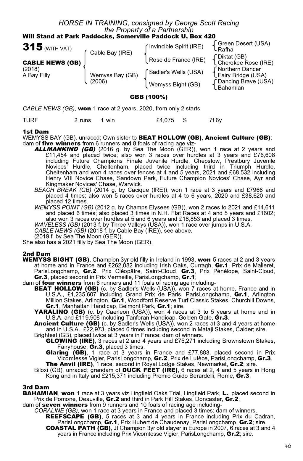HORSE IN TRAINING, consigned by George Scott Racing the Property of a Partnership Will Stand at Park Paddocks, Somerville Paddock U, Box 420 315 (WITH VAT) Cable Bay (IRE) CABLE NEWS (GB) (2018) A Bay Filly Invincible Spirit (IRE) Rose de France (IRE) Wemyss Bay (GB) (2006) Sadler s Wells (USA) Wemyss Bight (GB) Green Desert (USA) Rafha Diktat (GB) Cherokee Rose (IRE) Northern Dancer Fairy Bridge (USA) Dancing Brave (USA) Bahamian GBB (100%) CABLE NEWS (GB), won 1 race at 2 years, 2020, from only 2 starts. TURF 2 runs 1 win 4,075 S 7f 6y 1st Dam WEMYSS BAY (GB), unraced; Own sister to BEAT HOLLOW (GB), Ancient Culture (GB); dam of five winners from 6 runners and 8 foals of racing age vizALLMANKIND (GB) (2016 g. by Sea The Moon (GER)), won 1 race at 2 years and 11,454 and placed twice; also won 3 races over hurdles at 3 years and 76,608 including Future Champions Finale Juvenile Hurdle, Chepstow, Prestbury Juvenile Novices Hurdle, Cheltenham, placed twice including third in Triumph Hurdle, Cheltenham and won 4 races over fences at 4 and 5 years, 2021 and 68,532 including Henry VIII Novice Chase, Sandown Park, Future Champion Novices Chase, Ayr and Kingmaker Novices Chase, Warwick. BEACH BREAK (GB) (2014 g. by Cacique (IRE)), won 1 race at 3 years and 7966 and placed 4 times; also won 5 races over hurdles at 4 to 6 years, 2020 and 38,620 and placed 12 times. WEMYSS POINT (GB) (2012 g. by Champs Elysees (GB)), won 2 races to 2021 and 14,611 and placed 6 times; also placed 3 times in N.H. Flat Races at 4 and 5 years and 1602; also won 3 races over hurdles at 5 and 6 years and 18,853 and placed 3 times. WAVELESS (GB) (2013 f. by Three Valleys (USA)), won 1 race over jumps in U.S.A. CABLE NEWS (GB) (2018 f. by Cable Bay (IRE)), see above. (2019 f. by Sea The Moon (GER)). She also has a 2021 filly by Sea The Moon (GER). 2nd Dam WEMYSS BIGHT (GB), Champion 3yr old filly in Ireland in 1993, won 5 races at 2 and 3 years at home and in France and 262,082 including Irish Oaks, Curragh, Gr.1, Prix de Malleret, ParisLongchamp, Gr.2, Prix Cloptre, Saint-Cloud, Gr.3, Prix Pnlope, Saint-Cloud, Gr.3, placed second in Prix Vermeille, ParisLongchamp, Gr.1; dam of four winners from 6 runners and 11 foals of racing age includingBEAT HOLLOW (GB) (c. by Sadler s Wells (USA)), won 7 races at home, France and in U.S.A., 1,235,607 including Grand Prix de Paris, ParisLongchamp, Gr.1, Arlington Million Stakes, Arlington, Gr.1, Woodford Reserve Turf Classic Stakes, Churchill Downs, Gr.1, Manhattan Handicap, Belmont Park, Gr.1; sire. YARALINO (GB) (c. by Caerleon (USA)), won 4 races at 3 to 5 years at home and in U.S.A. and 119,908 including Tanforan Handicap, Golden Gate, Gr.3. Ancient Culture (GB) (c. by Sadler s Wells (USA)), won 2 races at 3 and 4 years at home and in U.S.A., 22,973, placed 6 times including second in Mataji Stakes, Calder; sire. Brightest (GB), placed twice at 3 years in France; dam of winners. GLOWING (IRE), 3 races at 2 and 4 years and 75,271 including Brownstown Stakes, Fairyhouse, Gr.3, placed 3 times. Glaring (GB), 1 race at 3 years in France and 77,883, placed second in Prix Vicomtesse Vigier, ParisLongchamp, Gr.2, Prix de Lutce, ParisLongchamp, Gr.3. The Anvil (IRE), 1 race, second in Royal Lodge Stakes, Newmarket, Gr.2; sire. Biloxi (GB), unraced; grandam of DUCK FEET (IRE), 6 races at 2, 4 and 5 years in Hong Kong and in Italy and 215,371 including Premio Guido Berardelli, Rome, Gr.3. 3rd Dam BAHAMIAN, won 1 race at 3 years viz Lingfield Oaks Trial, Lingfield Park, L., placed second in Prix de Pomone, Deauville, Gr.2 and third in Park Hill Stakes, Doncaster, Gr.2; dam of seven winners from 9 runners and 10 foals of racing age includingCORALINE (GB), won 1 race at 3 years in France and placed 3 times; dam of winners. REEFSCAPE (GB), 5 races at 3 and 4 years in France including Prix du Cadran, ParisLongchamp, Gr.1, Prix Hubert de Chaudenay, ParisLongchamp, Gr.2; sire. COASTAL PATH (GB), Jt Champion 3yr old stayer in Europe in 2007, 6 races at 3 and 4 years in France including Prix Vicomtesse Vigier, ParisLongchamp, Gr.2; sire. 46