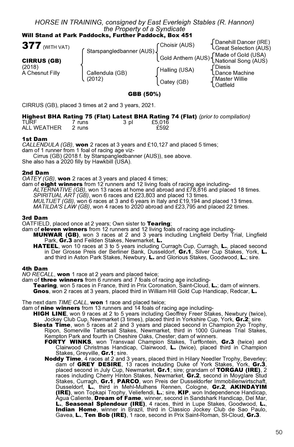 HORSE IN TRAINING, consigned by East Everleigh Stables (R. Hannon) the Property of a Syndicate Will Stand at Park Paddocks, Further Paddock, Box 451 377 (WITH VAT) CIRRUS (GB) (2018) A Chesnut Filly Starspangledbanner (AUS) Callendula (GB) (2012) Danehill Dancer (IRE) Great Selection (AUS) Made of Gold (USA) Gold Anthem (AUS) National Song (AUS) Diesis Halling (USA) Dance Machine Master Willie Oatey (GB) Oatfield Choisir (AUS) GBB (50%) CIRRUS (GB), placed 3 times at 2 and 3 years, 2021. Highest BHA Rating 75 (Flat) Latest BHA Rating 74 (Flat) (prior to compilation) TURF 7 runs 3 pl 5,016 ALL WEATHER 2 runs 592 1st Dam CALLENDULA (GB), won 2 races at 3 years and 10,127 and placed 5 times; dam of 1 runner from 1 foal of racing age vizCirrus (GB) (2018 f. by Starspangledbanner (AUS)), see above. She also has a 2020 filly by Hawkbill (USA). 2nd Dam OATEY (GB), won 2 races at 3 years and placed 4 times; dam of eight winners from 12 runners and 12 living foals of racing age includingALTERNATIVE (GB), won 13 races at home and abroad and 78,816 and placed 18 times. SPIRITUAL ART (GB), won 6 races and 23,803 and placed 13 times. MULTIJET (GB), won 6 races at 3 and 6 years in Italy and 19,194 and placed 13 times. MATILDA S LAW (GB), won 4 races to 2020 abroad and 23,795 and placed 22 times. 3rd Dam OATFIELD, placed once at 2 years; Own sister to Tearing; dam of eleven winners from 12 runners and 12 living foals of racing age includingMUNWAR (GB), won 3 races at 2 and 3 years including Lingfield Derby Trial, Lingfield Park, Gr.3 and Feilden Stakes, Newmarket, L. HATEEL, won 10 races at 3 to 5 years including Curragh Cup, Curragh, L., placed second in Der Grosse Preis der Berliner Bank, Dusseldorf, Gr.1, Silver Cup Stakes, York, L. and third in Aston Park Stakes, Newbury, L. and Glorious Stakes, Goodwood, L.; sire. 4th Dam NO RECALL, won 1 race at 2 years and placed twice; dam of three winners from 6 runners and 7 foals of racing age includingTearing, won 5 races in France, third in Prix Coronation, Saint-Cloud, L.; dam of winners. Gnos, won 2 races at 3 years, placed third in William Hill Gold Cup Handicap, Redcar, L. The next dam TIME CALL, won 1 race and placed twice; dam of nine winners from 13 runners and 14 foals of racing age includingHIGH LINE, won 9 races at 2 to 5 years including Geoffrey Freer Stakes, Newbury (twice), Jockey Club Cup, Newmarket (3 times), placed third in Yorkshire Cup, York, Gr.2; sire. Siesta Time, won 5 races at 2 and 3 years and placed second in Champion 2yo Trophy, Ripon, Somerville Tattersall Stakes, Newmarket, third in 1000 Guineas Trial Stakes, Kempton Park and fourth in Cheshire Oaks, Chester; dam of winners. FORTY WINKS, won Transvaal Champion Stakes, Turffontein, Gr.3 (twice) and Clairwood Christmas Handicap, Clairwood, L. (twice), placed third in Champion Stakes, Greyville, Gr.1; sire. Noddy Time, 4 races at 2 and 3 years, placed third in Hilary Needler Trophy, Beverley; dam of GREY DESIRE, 13 races including Duke of York Stakes, York, Gr.3, placed second in July Cup, Newmarket, Gr.1; sire; grandam of TORGAU (IRE), 2 races including Cherry Hinton Stakes, Newmarket, Gr.2, second in Moyglare Stud Stakes, Curragh, Gr.1, PARCO, won Preis der Dusseldorfer Immobilienwirtschaft, Dusseldorf, L., third in Mehl-Mulhens Rennen, Cologne, Gr.2, AKINDAYIM (IRE), won Topkapi Trophy, Veliefendi, L.; sire, KIP, won Independence Handicap, Agua Caliente, Dream of Fame, winner, second in Sandshark Handicap, Del Mar, L., Seasonal Splendour (IRE), 4 races, third in Lupe Stakes, Goodwood, L., Indian Home, winner in Brazil, third in Classico Jockey Club de Sao Paulo, Gavea, L., Ten Bob (IRE), 1 race, second in Prix Saint-Roman, St-Cloud, Gr.3. 50