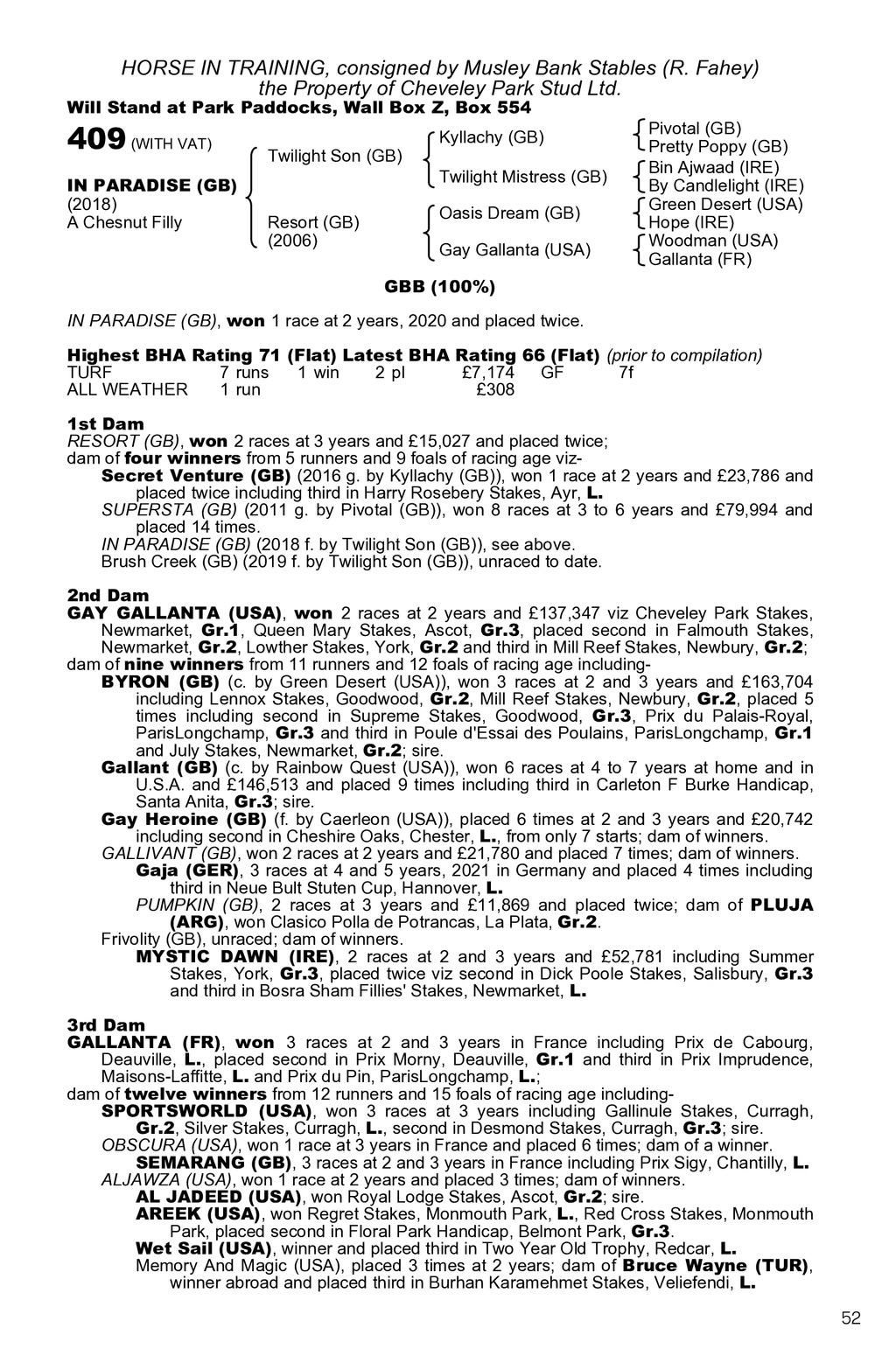 HORSE IN TRAINING, consigned by Musley Bank Stables (R. Fahey) the Property of Cheveley Park Stud Ltd. Will Stand at Park Paddocks, Wall Box Z, Box 554 409 (WITH VAT) IN PARADISE (GB) (2018) A Chesnut Filly Twilight Son (GB) Kyllachy (GB) Twilight Mistress (GB) Resort (GB) (2006) Oasis Dream (GB) Gay Gallanta (USA) Pivotal (GB) Pretty Poppy (GB) Bin Ajwaad (IRE) By Candlelight (IRE) Green Desert (USA) Hope (IRE) Woodman (USA) Gallanta (FR) GBB (100%) IN PARADISE (GB), won 1 race at 2 years, 2020 and placed twice. Highest BHA Rating 71 (Flat) Latest BHA Rating 66 (Flat) (prior to compilation) TURF 7 runs 1 win 2 pl 7,174 GF 7f ALL WEATHER 1 run 308 1st Dam RESORT (GB), won 2 races at 3 years and 15,027 and placed twice; dam of four winners from 5 runners and 9 foals of racing age vizSecret Venture (GB) (2016 g. by Kyllachy (GB)), won 1 race at 2 years and 23,786 and placed twice including third in Harry Rosebery Stakes, Ayr, L. SUPERSTA (GB) (2011 g. by Pivotal (GB)), won 8 races at 3 to 6 years and 79,994 and placed 14 times. IN PARADISE (GB) (2018 f. by Twilight Son (GB)), see above. Brush Creek (GB) (2019 f. by Twilight Son (GB)), unraced to date. 2nd Dam GAY GALLANTA (USA), won 2 races at 2 years and 137,347 viz Cheveley Park Stakes, Newmarket, Gr.1, Queen Mary Stakes, Ascot, Gr.3, placed second in Falmouth Stakes, Newmarket, Gr.2, Lowther Stakes, York, Gr.2 and third in Mill Reef Stakes, Newbury, Gr.2; dam of nine winners from 11 runners and 12 foals of racing age includingBYRON (GB) (c. by Green Desert (USA)), won 3 races at 2 and 3 years and 163,704 including Lennox Stakes, Goodwood, Gr.2, Mill Reef Stakes, Newbury, Gr.2, placed 5 times including second in Supreme Stakes, Goodwood, Gr.3, Prix du Palais-Royal, ParisLongchamp, Gr.3 and third in Poule d Essai des Poulains, ParisLongchamp, Gr.1 and July Stakes, Newmarket, Gr.2; sire. Gallant (GB) (c. by Rainbow Quest (USA)), won 6 races at 4 to 7 years at home and in U.S.A. and 146,513 and placed 9 times including third in Carleton F Burke Handicap, Santa Anita, Gr.3; sire. Gay Heroine (GB) (f. by Caerleon (USA)), placed 6 times at 2 and 3 years and 20,742 including second in Cheshire Oaks, Chester, L., from only 7 starts; dam of winners. GALLIVANT (GB), won 2 races at 2 years and 21,780 and placed 7 times; dam of winners. Gaja (GER), 3 races at 4 and 5 years, 2021 in Germany and placed 4 times including third in Neue Bult Stuten Cup, Hannover, L. PUMPKIN (GB), 2 races at 3 years and 11,869 and placed twice; dam of PLUJA (ARG), won Clasico Polla de Potrancas, La Plata, Gr.2. Frivolity (GB), unraced; dam of winners. MYSTIC DAWN (IRE), 2 races at 2 and 3 years and 52,781 including Summer Stakes, York, Gr.3, placed twice viz second in Dick Poole Stakes, Salisbury, Gr.3 and third in Bosra Sham Fillies Stakes, Newmarket, L. 3rd Dam GALLANTA (FR), won 3 races at 2 and 3 years in France including Prix de Cabourg, Deauville, L., placed second in Prix Morny, Deauville, Gr.1 and third in Prix Imprudence, Maisons-Laffitte, L. and Prix du Pin, ParisLongchamp, L.; dam of twelve winners from 12 runners and 15 foals of racing age includingSPORTSWORLD (USA), won 3 races at 3 years including Gallinule Stakes, Curragh, Gr.2, Silver Stakes, Curragh, L., second in Desmond Stakes, Curragh, Gr.3; sire. OBSCURA (USA), won 1 race at 3 years in France and placed 6 times; dam of a winner. SEMARANG (GB), 3 races at 2 and 3 years in France including Prix Sigy, Chantilly, L. ALJAWZA (USA), won 1 race at 2 years and placed 3 times; dam of winners. AL JADEED (USA), won Royal Lodge Stakes, Ascot, Gr.2; sire. AREEK (USA), won Regret Stakes, Monmouth Park, L., Red Cross Stakes, Monmouth Park, placed second in Floral Park Handicap, Belmont Park, Gr.3. Wet Sail (USA), winner and placed third in Two Year Old Trophy, Redcar, L. Memory And Magic (USA), placed 3 times at 2 years; dam of Bruce Wayne (TUR), winner abroad and placed third in Burhan Karamehmet Stakes, Veliefendi, L. 52