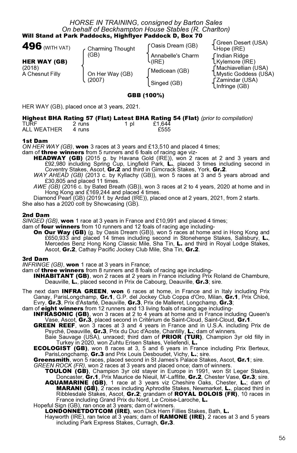 HORSE IN TRAINING, consigned by Barton Sales On behalf of Beckhampton House Stables (R. Charlton) Will Stand at Park Paddocks, Highflyer Paddock D, Box 70 496 (WITH VAT) HER WAY (GB) (2018) A Chesnut Filly Charming Thought (GB) On Her Way (GB) (2007) Oasis Dream (GB) Annabelle s Charm (IRE) Medicean (GB) Singed (GB) Green Desert (USA) Hope (IRE) Indian Ridge Kylemore (IRE) Machiavellian (USA) Mystic Goddess (USA) Zamindar (USA) Infringe (GB) GBB (100%) HER WAY (GB), placed once at 3 years, 2021. Highest BHA Rating 57 (Flat) Latest BHA Rating 54 (Flat) (prior to compilation) TURF 2 runs 1 pl 1,644 ALL WEATHER 4 runs 555 1st Dam ON HER WAY (GB), won 3 races at 3 years and 13,510 and placed 4 times; dam of three winners from 5 runners and 6 foals of racing age vizHEADWAY (GB) (2015 g. by Havana Gold (IRE)), won 2 races at 2 and 3 years and 92,980 including Spring Cup, Lingfield Park, L., placed 3 times including second in Coventry Stakes, Ascot, Gr.2 and third in Gimcrack Stakes, York, Gr.2. WAY AHEAD (GB) (2013 c. by Kyllachy (GB)), won 5 races at 3 and 5 years abroad and 30,805 and placed 11 times. AWE (GB) (2016 c. by Bated Breath (GB)), won 3 races at 2 to 4 years, 2020 at home and in Hong Kong and 169,244 and placed 4 times. Diamond Pearl (GB) (2019 f. by Ardad (IRE)), placed once at 2 years, 2021, from 2 starts. She also has a 2020 colt by Showcasing (GB). 2nd Dam SINGED (GB), won 1 race at 3 years in France and 10,991 and placed 4 times; dam of four winners from 10 runners and 12 foals of racing age includingOn Our Way (GB) (g. by Oasis Dream (GB)), won 5 races at home and in Hong Kong and 650,933 and placed 14 times including second in Stonehenge Stakes, Salisbury, L., Mercedes Benz Hong Kong Classic Mile, Sha Tin, L. and third in Royal Lodge Stakes, Ascot, Gr.2, Cathay Pacific Jockey Club Mile, Sha Tin, Gr.2. 3rd Dam INFRINGE (GB), won 1 race at 3 years in France; dam of three winners from 8 runners and 8 foals of racing age includingINHABITANT (GB), won 2 races at 2 years in France including Prix Roland de Chambure, Deauville, L., placed second in Prix de Cabourg, Deauville, Gr.3; sire. The next dam INFRA GREEN, won 6 races at home, in France and in Italy including Prix Ganay, ParisLongchamp, Gr.1, G.P. del Jockey Club Coppa d Oro, Milan, Gr.1, Prix Chlo, Evry, Gr.3, Prix d Astart, Deauville, Gr.3, Prix de Malleret, Longchamp, Gr.3; dam of eight winners from 12 runners and 13 living foals of racing age includingINFRASONIC (GB), won 3 races at 2 to 4 years at home and in France including Queen s Vase, Ascot, Gr.3, placed second in Critrium de Saint-Cloud, Saint-Cloud, Gr.1. GREEN REEF, won 3 races at 3 and 4 years in France and in U.S.A. including Prix de Psych, Deauville, Gr.3, Prix du Duc d Aoste, Chantilly, L.; dam of winners. Baie Sauvage (USA), unraced; third dam of PRIOR (TUR), Champion 3yr old filly in Turkey in 2020, won Zuhtu Erisen Stakes, Veliefendi, L. ECOLOGIST (GB), won 8 races at 3, 5 and 6 years in France including Prix Berteux, ParisLongchamp, Gr.3 and Prix Louis Desboudet, Vichy, L.; sire. Greensmith, won 5 races, placed second in St James s Palace Stakes, Ascot, Gr.1; sire. GREEN ROCK (FR), won 2 races at 3 years and placed once; dam of winners. TOULON (GB), Champion 3yr old stayer in Europe in 1991, won St Leger Stakes, Doncaster, Gr.1, Prix Maurice de Nieuil, M-Laffitte, Gr.2, Chester Vase, Gr.3; sire. AQUAMARINE (GB), 1 race at 3 years viz Cheshire Oaks, Chester, L.; dam of MARANI (GB), 2 races including Aphrodite Stakes, Newmarket, L., placed third in Ribblesdale Stakes, Ascot, Gr.2; grandam of ROYAL DOLOIS (FR), 10 races in France including Grand Prix du Nord, Le Croise-Laroche, L. Hopeful Sign (GB), ran once at 3 years; dam of winners. LONDONNETDOTCOM (IRE), won Dick Hern Fillies Stakes, Bath, L. Hayworth (IRE), ran twice at 3 years; dam of RAMONE (IRE), 2 races at 3 and 5 years including Park Express Stakes, Curragh, Gr.3. 56