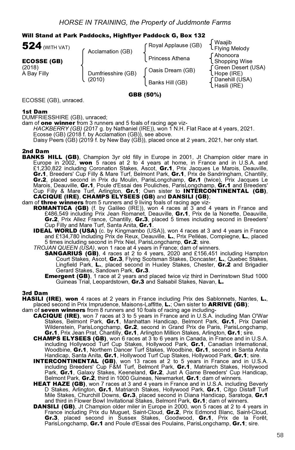 HORSE IN TRAINING, the Property of Juddmonte Farms Will Stand at Park Paddocks, Highflyer Paddock G, Box 132 524 (WITH VAT) ECOSSE (GB) (2018) A Bay Filly ECOSSE (GB), unraced. Acclamation (GB) Royal Applause (GB) Princess Athena Dumfriesshire (GB) (2010) Oasis Dream (GB) Banks Hill (GB) Waajib Flying Melody Ahonoora Shopping Wise Green Desert (USA) Hope (IRE) Danehill (USA) Hasili (IRE) GBB (50%) 1st Dam DUMFRIESSHIRE (GB), unraced; dam of one winner from 3 runners and 5 foals of racing age vizHACKBERRY (GB) (2017 g. by Nathaniel (IRE)), won 1 N.H. Flat Race at 4 years, 2021. Ecosse (GB) (2018 f. by Acclamation (GB)), see above. Daisy Peers (GB) (2019 f. by New Bay (GB)), placed once at 2 years, 2021, her only start. 2nd Dam BANKS HILL (GB), Champion 3yr old filly in Europe in 2001, Jt Champion older mare in Europe in 2002, won 5 races at 2 to 4 years at home, in France and in U.S.A. and 1,230,822 including Coronation Stakes, Ascot, Gr.1, Prix Jacques Le Marois, Deauville, Gr.1, Breeders Cup Filly & Mare Turf, Belmont Park, Gr.1, Prix de Sandringham, Chantilly, Gr.2, placed second in Prix du Moulin, ParisLongchamp, Gr.1 (twice), Prix Jacques Le Marois, Deauville, Gr.1, Poule d Essai des Pouliches, ParisLongchamp, Gr.1 and Breeders Cup Filly & Mare Turf, Arlington, Gr.1; Own sister to INTERCONTINENTAL (GB), CACIQUE (IRE), CHAMPS ELYSEES (GB) and DANSILI (GB); dam of three winners from 5 runners and 9 living foals of racing age vizROMANTICA (GB) (f. by Galileo (IRE)), won 4 races at 3 and 4 years in France and 486,549 including Prix Jean Romanet, Deauville, Gr.1, Prix de la Nonette, Deauville, Gr.2, Prix Allez France, Chantilly, Gr.3, placed 5 times including second in Breeders Cup Filly and Mare Turf, Santa Anita, Gr.1. IDEAL WORLD (USA) (c. by Kingmambo (USA)), won 4 races at 3 and 4 years in France and 134,780 including Prix de Reux, Deauville, L., Prix Pellas, Compiegne, L., placed 5 times including second in Prix Niel, ParisLongchamp, Gr.2; sire. TROJAN QUEEN (USA), won 1 race at 4 years in France; dam of winners. SANGARIUS (GB), 4 races at 2 to 4 years, 2020 and 156,451 including Hampton Court Stakes, Ascot, Gr.3, Flying Scotsman Stakes, Doncaster, L., Quebec Stakes, Lingfield Park, L., placed second in Huxley Stakes, Chester, Gr.2 and Brigadier Gerard Stakes, Sandown Park, Gr.3. Emergent (GB), 1 race at 2 years and placed twice viz third in Derrinstown Stud 1000 Guineas Trial, Leopardstown, Gr.3 and Salsabil Stakes, Navan, L. 3rd Dam HASILI (IRE), won 4 races at 2 years in France including Prix des Sablonnets, Nantes, L., placed second in Prix Imprudence, Maisons-Laffitte, L.; Own sister to ARRIVE (GB); dam of seven winners from 8 runners and 10 foals of racing age includingCACIQUE (IRE), won 7 races at 3 to 5 years in France and in U.S.A. including Man O War Stakes, Belmont Park, Gr.1, Manhattan Handicap, Belmont Park, Gr.1, Prix Daniel Wildenstein, ParisLongchamp, Gr.2, second in Grand Prix de Paris, ParisLongchamp, Gr.1, Prix Jean Prat, Chantilly, Gr.1, Arlington Million Stakes, Arlington, Gr.1; sire. CHAMPS ELYSEES (GB), won 6 races at 3 to 6 years in Canada, in France and in U.S.A. including Hollywood Turf Cup Stakes, Hollywood Park, Gr.1, Canadian International, Woodbine, Gr.1, Northern Dancer Turf Stakes, Woodbine, Gr.1, second in Santa Anita Handicap, Santa Anita, Gr.1, Hollywood Turf Cup Stakes, Hollywood Park, Gr.1; sire. INTERCONTINENTAL (GB), won 13 races at 2 to 5 years in France and in U.S.A. including Breeders Cup F&M Turf, Belmont Park, Gr.1, Matriarch Stakes, Hollywood Park, Gr.1, Galaxy Stakes, Keeneland, Gr.2, Just A Game Breeders Cup Handicap, Belmont Park, Gr.2, third in 1000 Guineas, Newmarket, Gr.1; dam of winners. HEAT HAZE (GB), won 7 races at 3 and 4 years in France and in U.S.A. including Beverly D Stakes, Arlington, Gr.1, Matriarch Stakes, Hollywood Park, Gr.1, Citgo Distaff Turf Mile Stakes, Churchill Downs, Gr.3, placed second in Diana Handicap, Saratoga, Gr.1 and third in Flower Bowl Invitational Stakes, Belmont Park, Gr.1; dam of winners. DANSILI (GB), Jt Champion older miler in Europe in 2000, won 5 races at 2 to 4 years in France including Prix du Muguet, Saint-Cloud, Gr.2, Prix Edmond Blanc, Saint-Cloud, Gr.3, placed second in Sussex Stakes, Goodwood, Gr.1, Prix de la Fort, ParisLongchamp, Gr.1 and Poule d Essai des Poulains, ParisLongchamp, Gr.1; sire. 58