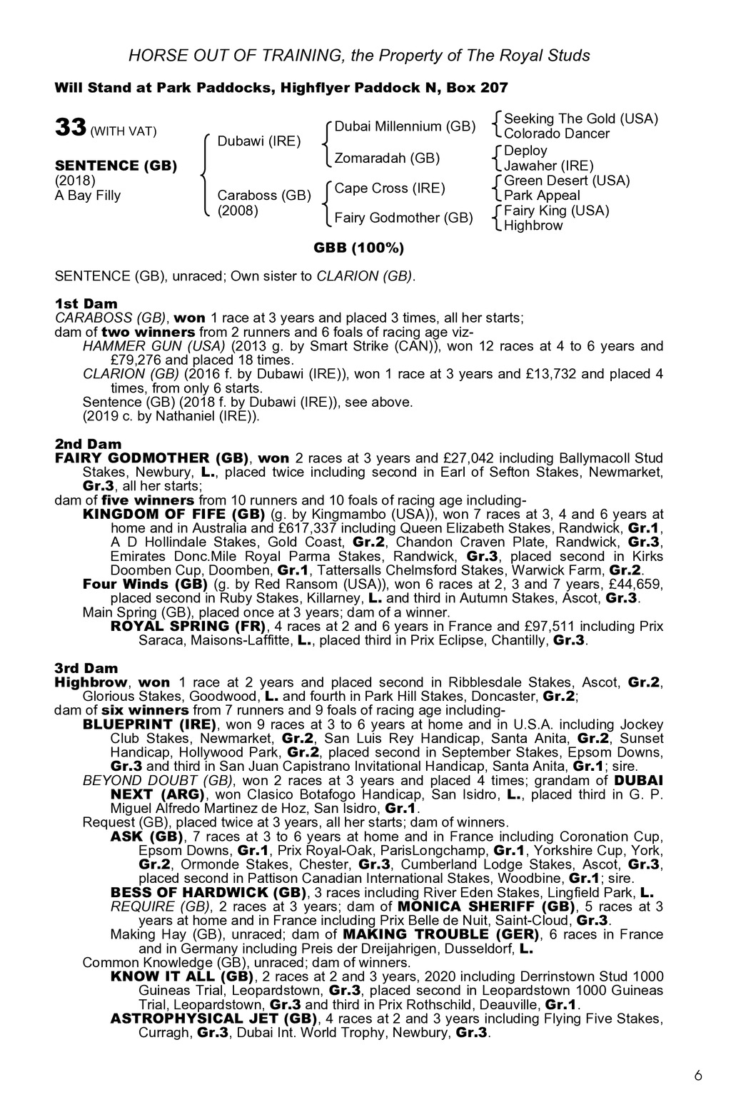 HORSE OUT OF TRAINING, the Property of The Royal Studs Will Stand at Park Paddocks, Highflyer Paddock N, Box 207 33 (WITH VAT) SENTENCE (GB) (2018) A Bay Filly Dubawi (IRE) Dubai Millennium (GB) Zomaradah (GB) Caraboss (GB) (2008) Cape Cross (IRE) Fairy Godmother (GB) Seeking The Gold (USA) Colorado Dancer Deploy Jawaher (IRE) Green Desert (USA) Park Appeal Fairy King (USA) Highbrow GBB (100%) SENTENCE (GB), unraced; Own sister to CLARION (GB). 1st Dam CARABOSS (GB), won 1 race at 3 years and placed 3 times, all her starts; dam of two winners from 2 runners and 6 foals of racing age vizHAMMER GUN (USA) (2013 g. by Smart Strike (CAN)), won 12 races at 4 to 6 years and 79,276 and placed 18 times. CLARION (GB) (2016 f. by Dubawi (IRE)), won 1 race at 3 years and 13,732 and placed 4 times, from only 6 starts. Sentence (GB) (2018 f. by Dubawi (IRE)), see above. (2019 c. by Nathaniel (IRE)). 2nd Dam FAIRY GODMOTHER (GB), won 2 races at 3 years and 27,042 including Ballymacoll Stud Stakes, Newbury, L., placed twice including second in Earl of Sefton Stakes, Newmarket, Gr.3, all her starts; dam of five winners from 10 runners and 10 foals of racing age includingKINGDOM OF FIFE (GB) (g. by Kingmambo (USA)), won 7 races at 3, 4 and 6 years at home and in Australia and 617,337 including Queen Elizabeth Stakes, Randwick, Gr.1, A D Hollindale Stakes, Gold Coast, Gr.2, Chandon Craven Plate, Randwick, Gr.3, Emirates Donc.Mile Royal Parma Stakes, Randwick, Gr.3, placed second in Kirks Doomben Cup, Doomben, Gr.1, Tattersalls Chelmsford Stakes, Warwick Farm, Gr.2. Four Winds (GB) (g. by Red Ransom (USA)), won 6 races at 2, 3 and 7 years, 44,659, placed second in Ruby Stakes, Killarney, L. and third in Autumn Stakes, Ascot, Gr.3. Main Spring (GB), placed once at 3 years; dam of a winner. ROYAL SPRING (FR), 4 races at 2 and 6 years in France and 97,511 including Prix Saraca, Maisons-Laffitte, L., placed third in Prix Eclipse, Chantilly, Gr.3. 3rd Dam Highbrow, won 1 race at 2 years and placed second in Ribblesdale Stakes, Ascot, Gr.2, Glorious Stakes, Goodwood, L. and fourth in Park Hill Stakes, Doncaster, Gr.2; dam of six winners from 7 runners and 9 foals of racing age includingBLUEPRINT (IRE), won 9 races at 3 to 6 years at home and in U.S.A. including Jockey Club Stakes, Newmarket, Gr.2, San Luis Rey Handicap, Santa Anita, Gr.2, Sunset Handicap, Hollywood Park, Gr.2, placed second in September Stakes, Epsom Downs, Gr.3 and third in San Juan Capistrano Invitational Handicap, Santa Anita, Gr.1; sire. BEYOND DOUBT (GB), won 2 races at 3 years and placed 4 times; grandam of DUBAI NEXT (ARG), won Clasico Botafogo Handicap, San Isidro, L., placed third in G. P. Miguel Alfredo Martinez de Hoz, San Isidro, Gr.1. Request (GB), placed twice at 3 years, all her starts; dam of winners. ASK (GB), 7 races at 3 to 6 years at home and in France including Coronation Cup, Epsom Downs, Gr.1, Prix Royal-Oak, ParisLongchamp, Gr.1, Yorkshire Cup, York, Gr.2, Ormonde Stakes, Chester, Gr.3, Cumberland Lodge Stakes, Ascot, Gr.3, placed second in Pattison Canadian International Stakes, Woodbine, Gr.1; sire. BESS OF HARDWICK (GB), 3 races including River Eden Stakes, Lingfield Park, L. REQUIRE (GB), 2 races at 3 years; dam of MONICA SHERIFF (GB), 5 races at 3 years at home and in France including Prix Belle de Nuit, Saint-Cloud, Gr.3. Making Hay (GB), unraced; dam of MAKING TROUBLE (GER), 6 races in France and in Germany including Preis der Dreijahrigen, Dusseldorf, L. Common Knowledge (GB), unraced; dam of winners. KNOW IT ALL (GB), 2 races at 2 and 3 years, 2020 including Derrinstown Stud 1000 Guineas Trial, Leopardstown, Gr.3, placed second in Leopardstown 1000 Guineas Trial, Leopardstown, Gr.3 and third in Prix Rothschild, Deauville, Gr.1. ASTROPHYSICAL JET (GB), 4 races at 2 and 3 years including Flying Five Stakes, Curragh, Gr.3, Dubai Int. World Trophy, Newbury, Gr.3. 6