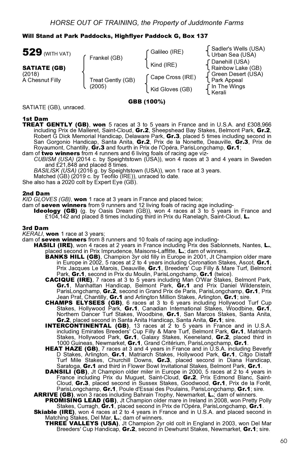 HORSE OUT OF TRAINING, the Property of Juddmonte Farms Will Stand at Park Paddocks, Highflyer Paddock G, Box 137 529 (WITH VAT) SATIATE (GB) (2018) A Chesnut Filly SATIATE (GB), unraced. Galileo (IRE) Frankel (GB) Kind (IRE) Treat Gently (GB) (2005) Cape Cross (IRE) Kid Gloves (GB) Sadler s Wells (USA) Urban Sea (USA) Danehill (USA) Rainbow Lake (GB) Green Desert (USA) Park Appeal In The Wings Kerali GBB (100%) 1st Dam TREAT GENTLY (GB), won 5 races at 3 to 5 years in France and in U.S.A. and 308,966 including Prix de Malleret, Saint-Cloud, Gr.2, Sheepshead Bay Stakes, Belmont Park, Gr.2, Robert G Dick Memorial Handicap, Delaware Park, Gr.3, placed 5 times including second in San Gorgonio Handicap, Santa Anita, Gr.2, Prix de la Nonette, Deauville, Gr.3, Prix de Royaumont, Chantilly, Gr.3 and fourth in Prix de l Opra, ParisLongchamp, Gr.1; dam of two winners from 4 runners and 6 living foals of racing age vizCUBISM (USA) (2014 c. by Speightstown (USA)), won 4 races at 3 and 4 years in Sweden and 21,848 and placed 8 times. BASILISK (USA) (2016 g. by Speightstown (USA)), won 1 race at 3 years. Matched (GB) (2019 c. by Teofilo (IRE)), unraced to date. She also has a 2020 colt by Expert Eye (GB). 2nd Dam KID GLOVES (GB), won 1 race at 3 years in France and placed twice; dam of seven winners from 9 runners and 12 living foals of racing age includingIdeology (GB) (g. by Oasis Dream (GB)), won 4 races at 3 to 5 years in France and 104,142 and placed 8 times including third in Prix du Ranelagh, Saint-Cloud, L. 3rd Dam KERALI, won 1 race at 3 years; dam of seven winners from 8 runners and 10 foals of racing age includingHASILI (IRE), won 4 races at 2 years in France including Prix des Sablonnets, Nantes, L., placed second in Prix Imprudence, Maisons-Laffitte, L.; dam of winners. BANKS HILL (GB), Champion 3yr old filly in Europe in 2001, Jt Champion older mare in Europe in 2002, 5 races at 2 to 4 years including Coronation Stakes, Ascot, Gr.1, Prix Jacques Le Marois, Deauville, Gr.1, Breeders Cup Filly & Mare Turf, Belmont Park, Gr.1, second in Prix du Moulin, ParisLongchamp, Gr.1 (twice). CACIQUE (IRE), 7 races at 3 to 5 years including Man O War Stakes, Belmont Park, Gr.1, Manhattan Handicap, Belmont Park, Gr.1 and Prix Daniel Wildenstein, ParisLongchamp, Gr.2, second in Grand Prix de Paris, ParisLongchamp, Gr.1, Prix Jean Prat, Chantilly, Gr.1 and Arlington Million Stakes, Arlington, Gr.1; sire. CHAMPS ELYSEES (GB), 6 races at 3 to 6 years including Hollywood Turf Cup Stakes, Hollywood Park, Gr.1, Canadian International Stakes, Woodbine, Gr.1, Northern Dancer Turf Stakes, Woodbine, Gr.1, San Marcos Stakes, Santa Anita, Gr.2, placed second in Santa Anita Handicap, Santa Anita, Gr.1; sire. INTERCONTINENTAL (GB), 13 races at 2 to 5 years in France and in U.S.A. including Emirates Breeders Cup Filly & Mare Turf, Belmont Park, Gr.1, Matriarch Stakes, Hollywood Park, Gr.1, Galaxy Stakes, Keeneland, Gr.2, placed third in 1000 Guineas, Newmarket, Gr.1, Grand Critrium, ParisLongchamp, Gr.1. HEAT HAZE (GB), 7 races at 3 and 4 years in France and in U.S.A. including Beverly D Stakes, Arlington, Gr.1, Matriarch Stakes, Hollywood Park, Gr.1, Citgo Distaff Turf Mile Stakes, Churchill Downs, Gr.3, placed second in Diana Handicap, Saratoga, Gr.1 and third in Flower Bowl Invitational Stakes, Belmont Park, Gr.1. DANSILI (GB), Jt Champion older miler in Europe in 2000, 5 races at 2 to 4 years in France including Prix du Muguet, Saint-Cloud, Gr.2, Prix Edmond Blanc, SaintCloud, Gr.3, placed second in Sussex Stakes, Goodwood, Gr.1, Prix de la Fort, ParisLongchamp, Gr.1, Poule d Essai des Poulains, ParisLongchamp, Gr.1; sire. ARRIVE (GB), won 3 races including Bahrain Trophy, Newmarket, L.; dam of winners. PROMISING LEAD (GB), Jt Champion older mare in Ireland in 2008, won Pretty Polly Stakes, Curragh, Gr.1, placed second in Prix de l Opra, ParisLongchamp, Gr.1. Skiable (IRE), won 4 races at 2 to 4 years in France and in U.S.A. and placed second in Matching Stakes, Del Mar, L.; dam of winners. THREE VALLEYS (USA), Jt Champion 2yr old colt in England in 2003, won Del Mar Breeders Cup Handicap, Gr.2, second in Dewhurst Stakes, Newmarket, Gr.1; sire. 60