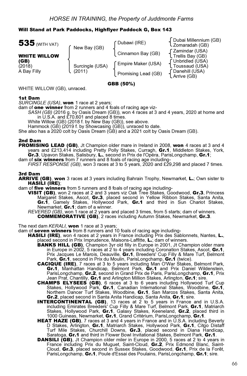 HORSE IN TRAINING, the Property of Juddmonte Farms Will Stand at Park Paddocks, Highflyer Paddock G, Box 143 535 (WITH VAT) WHITE WILLOW (GB) (2018) A Bay Filly New Bay (GB) Dubawi (IRE) Cinnamon Bay (GB) Surcingle (USA) (2011) WHITE WILLOW (GB), unraced. Empire Maker (USA) Promising Lead (GB) Dubai Millennium (GB) Zomaradah (GB) Zamindar (USA) Trellis Bay (GB) Unbridled (USA) Toussaud (USA) Danehill (USA) Arrive (GB) GBB (50%) 1st Dam SURCINGLE (USA), won 1 race at 2 years; dam of one winner from 2 runners and 4 foals of racing age vizSASH (GB) (2016 g. by Oasis Dream (GB)), won 4 races at 3 and 4 years, 2020 at home and in U.S.A. and 70,601 and placed 8 times. White Willow (GB) (2018 f. by New Bay (GB)), see above. Hammock (GB) (2019 f. by Showcasing (GB)), unraced to date. She also has a 2020 colt by Oasis Dream (GB) and a 2021 colt by Oasis Dream (GB). 2nd Dam PROMISING LEAD (GB), Jt Champion older mare in Ireland in 2008, won 4 races at 3 and 4 years and 213,414 including Pretty Polly Stakes, Curragh, Gr.1, Middleton Stakes, York, Gr.3, Upavon Stakes, Salisbury, L., second in Prix de l Opra, ParisLongchamp, Gr.1; dam of six winners from 7 runners and 8 foals of racing age includingFIRST RESPONSE (GB), won 3 races at 3 to 5 years, 2020 and 29,298 and placed 7 times. 3rd Dam ARRIVE (GB), won 3 races at 3 years including Bahrain Trophy, Newmarket, L.; Own sister to HASILI (IRE); dam of five winners from 5 runners and 8 foals of racing age includingVISIT (GB), won 2 races at 2 and 3 years viz Oak Tree Stakes, Goodwood, Gr.3, Princess Margaret Stakes, Ascot, Gr.3, placed second in Yellow Ribbon Stakes, Santa Anita, Gr.1, Gamely Stakes, Hollywood Park, Gr.1 and third in Sun Chariot Stakes, Newmarket, Gr.1; dam of a winner. REVERED (GB), won 1 race at 2 years and placed 3 times, from 5 starts; dam of winners. COMMEMORATIVE (GB), 2 races including Autumn Stakes, Newmarket, Gr.3. The next dam KERALI, won 1 race at 3 years; dam of seven winners from 8 runners and 10 foals of racing age includingHASILI (IRE), won 4 races at 2 years in France including Prix des Sablonnets, Nantes, L., placed second in Prix Imprudence, Maisons-Laffitte, L.; dam of winners. BANKS HILL (GB), Champion 3yr old filly in Europe in 2001, Jt Champion older mare in Europe in 2002, 5 races at 2 to 4 years including Coronation Stakes, Ascot, Gr.1, Prix Jacques Le Marois, Deauville, Gr.1, Breeders Cup Filly & Mare Turf, Belmont Park, Gr.1, second in Prix du Moulin, ParisLongchamp, Gr.1 (twice). CACIQUE (IRE), 7 races at 3 to 5 years including Man O War Stakes, Belmont Park, Gr.1, Manhattan Handicap, Belmont Park, Gr.1 and Prix Daniel Wildenstein, ParisLongchamp, Gr.2, second in Grand Prix de Paris, ParisLongchamp, Gr.1, Prix Jean Prat, Chantilly, Gr.1 and Arlington Million Stakes, Arlington, Gr.1; sire. CHAMPS ELYSEES (GB), 6 races at 3 to 6 years including Hollywood Turf Cup Stakes, Hollywood Park, Gr.1, Canadian International Stakes, Woodbine, Gr.1, Northern Dancer Turf Stakes, Woodbine, Gr.1, San Marcos Stakes, Santa Anita, Gr.2, placed second in Santa Anita Handicap, Santa Anita, Gr.1; sire. INTERCONTINENTAL (GB), 13 races at 2 to 5 years in France and in U.S.A. including Emirates Breeders Cup Filly & Mare Turf, Belmont Park, Gr.1, Matriarch Stakes, Hollywood Park, Gr.1, Galaxy Stakes, Keeneland, Gr.2, placed third in 1000 Guineas, Newmarket, Gr.1, Grand Critrium, ParisLongchamp, Gr.1. HEAT HAZE (GB), 7 races at 3 and 4 years in France and in U.S.A. including Beverly D Stakes, Arlington, Gr.1, Matriarch Stakes, Hollywood Park, Gr.1, Citgo Distaff Turf Mile Stakes, Churchill Downs, Gr.3, placed second in Diana Handicap, Saratoga, Gr.1 and third in Flower Bowl Invitational Stakes, Belmont Park, Gr.1. DANSILI (GB), Jt Champion older miler in Europe in 2000, 5 races at 2 to 4 years in France including Prix du Muguet, Saint-Cloud, Gr.2, Prix Edmond Blanc, SaintCloud, Gr.3, placed second in Sussex Stakes, Goodwood, Gr.1, Prix de la Fort, ParisLongchamp, Gr.1, Poule d Essai des Poulains, ParisLongchamp, Gr.1; sire. 66